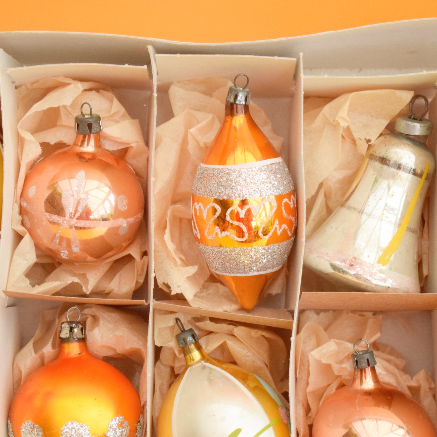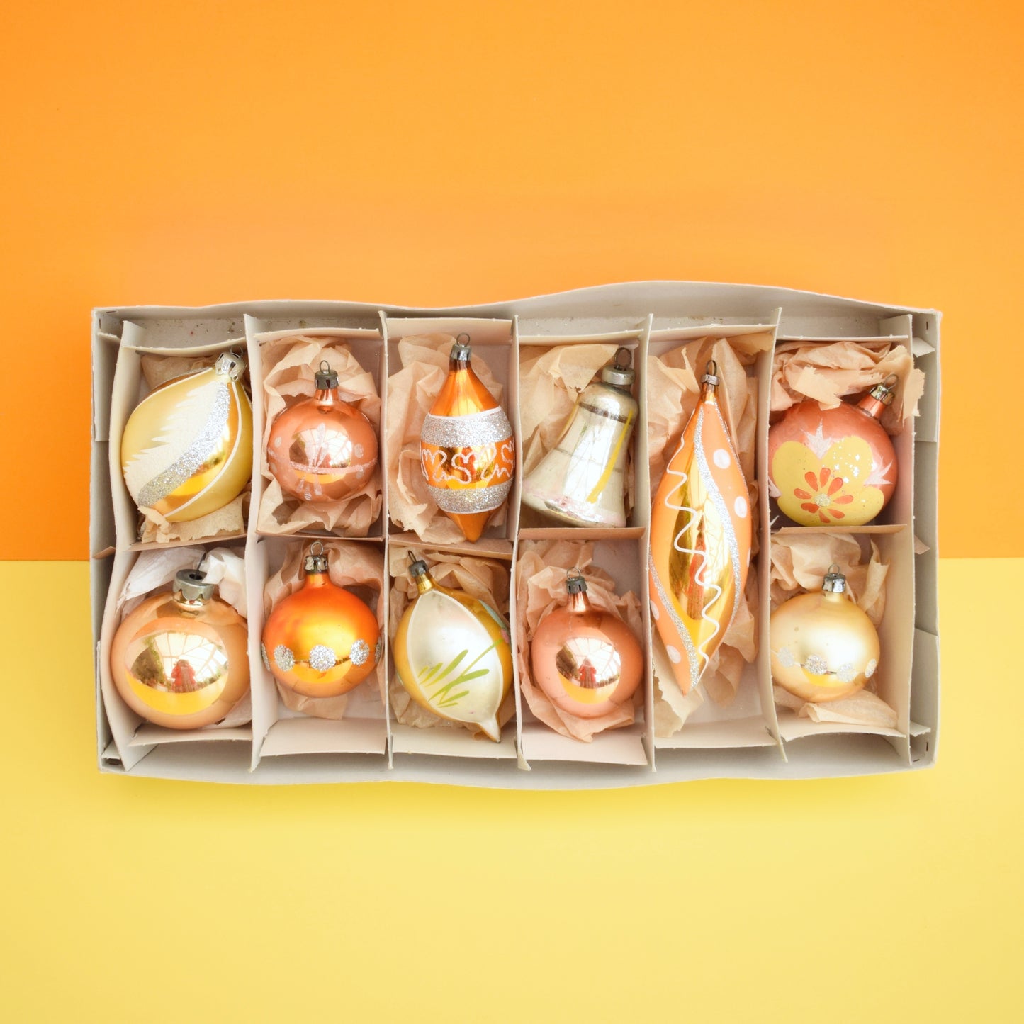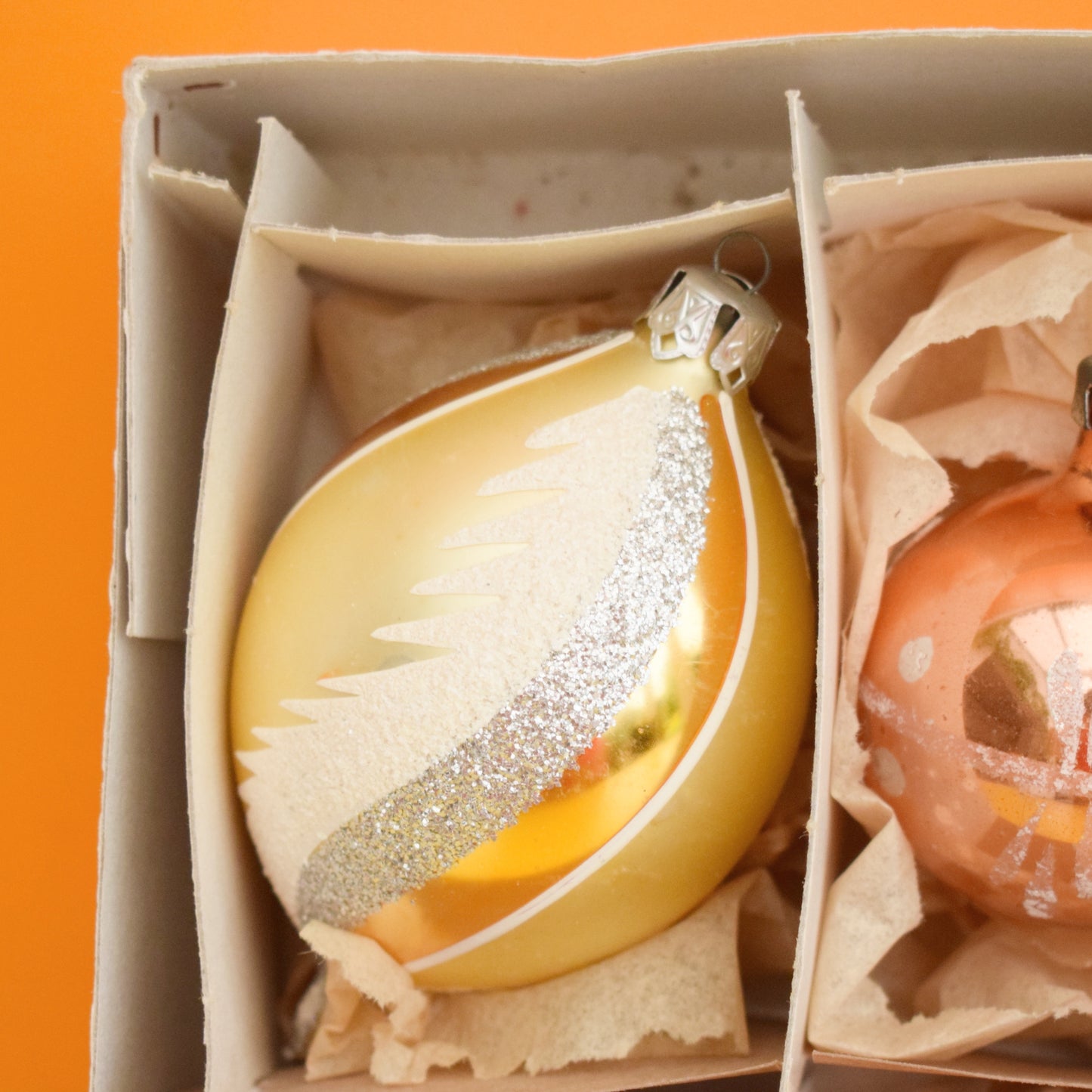 This is a lovely mixed box of delicate golden yellow, glass baubles