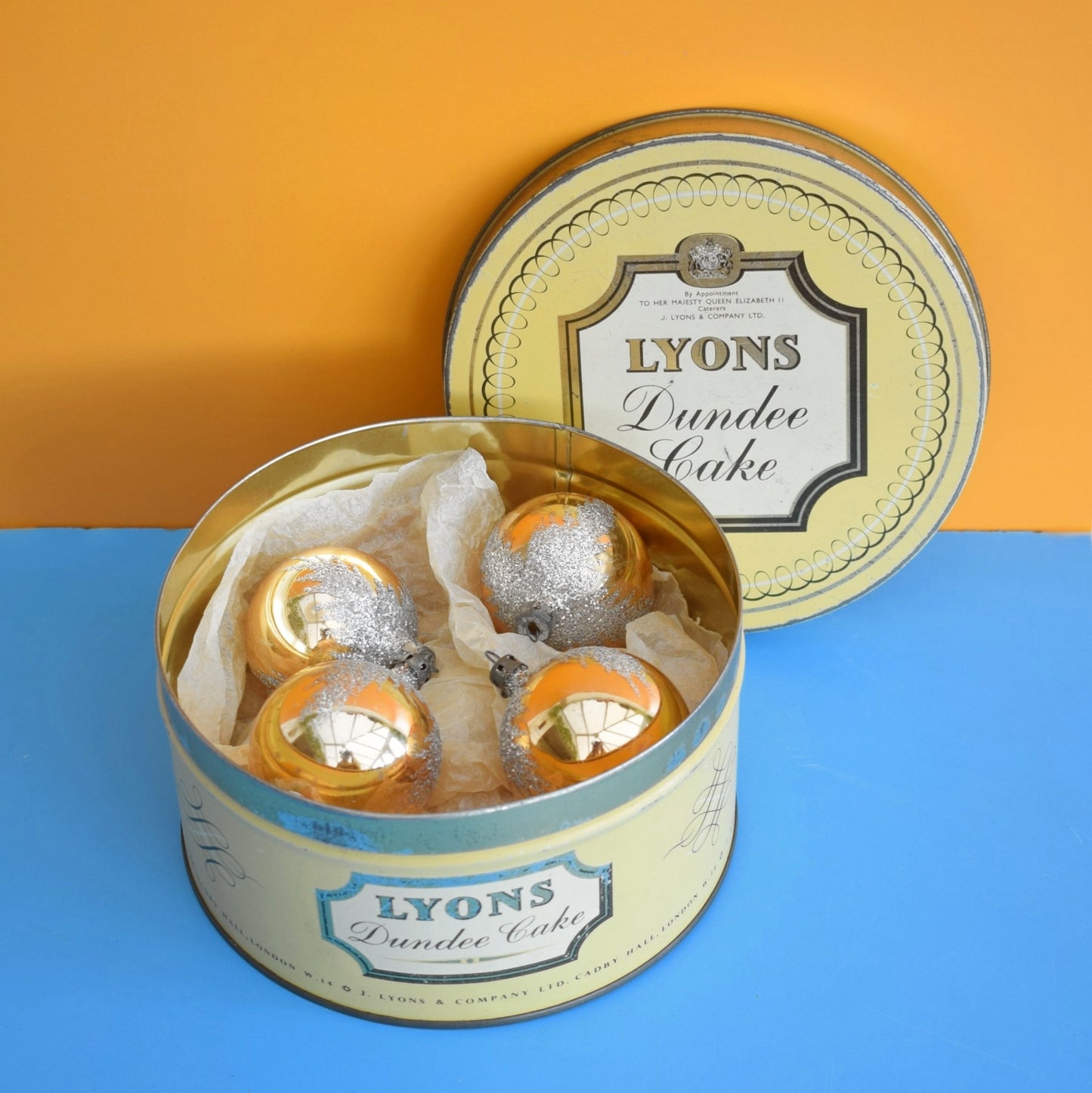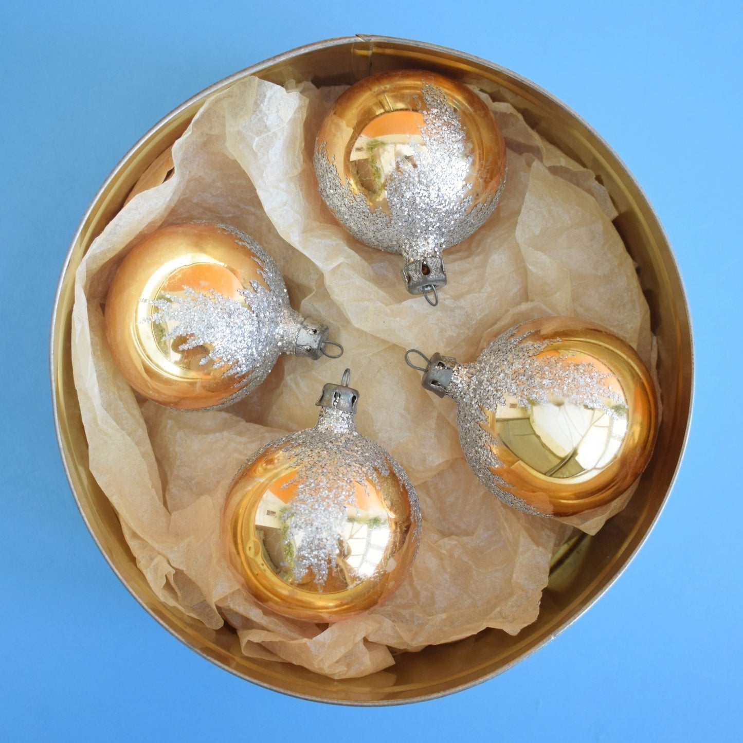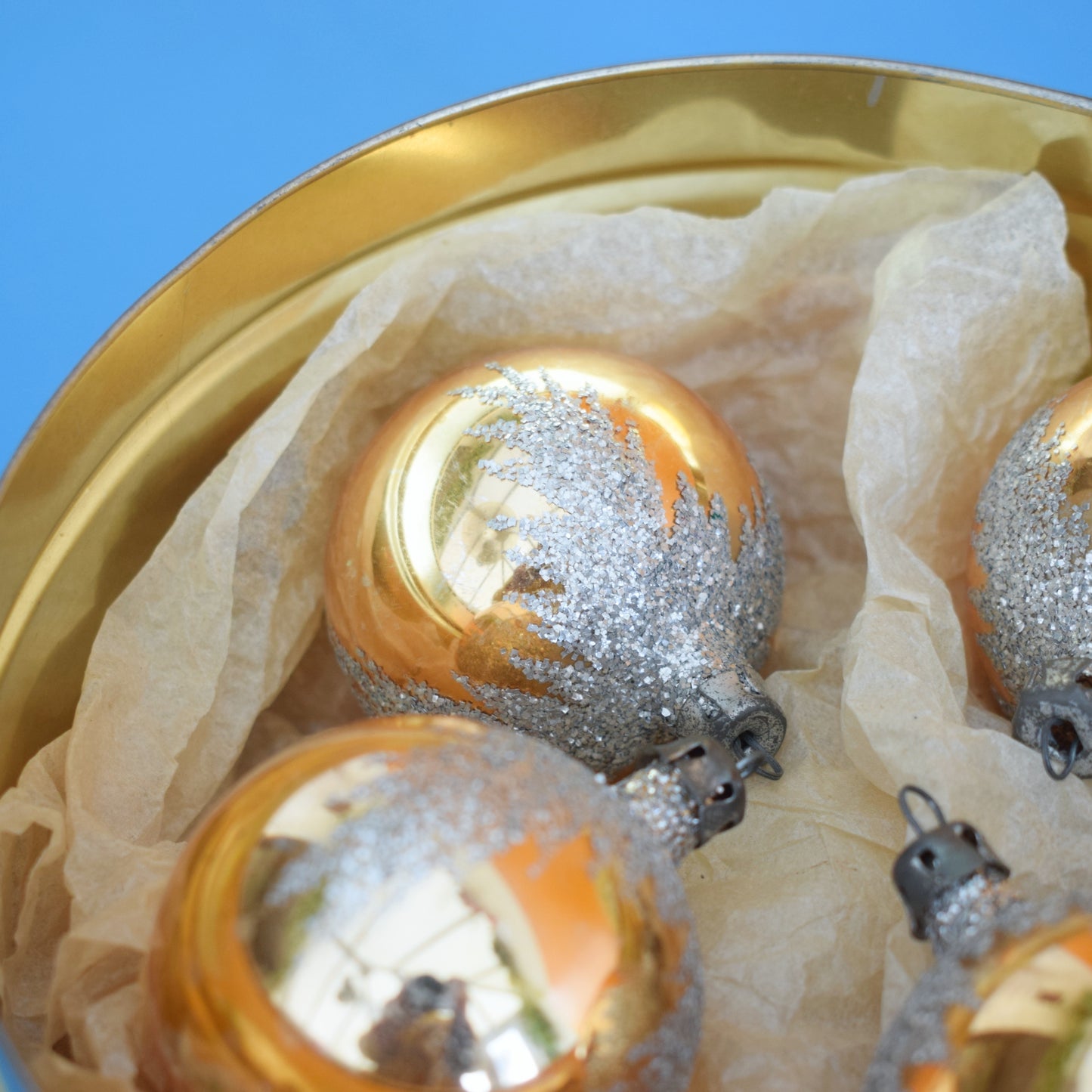 Vintage 1970s Glass Christmas Baubles In Vintage Tin - Gold