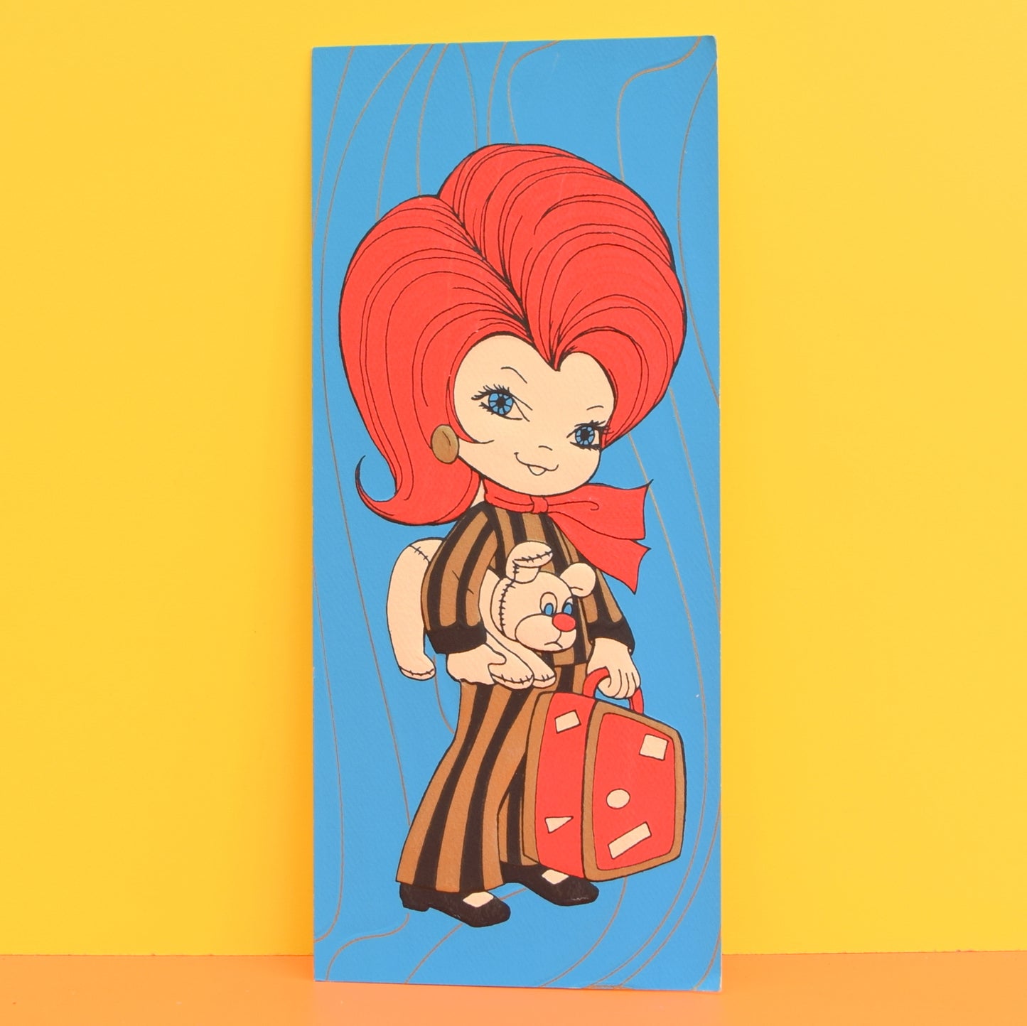 Charming 1970s American greeting card featuring a playful Bon Voyage suitcase motif—perfect for travel lovers, vintage collectors, or framing as retro wall art.