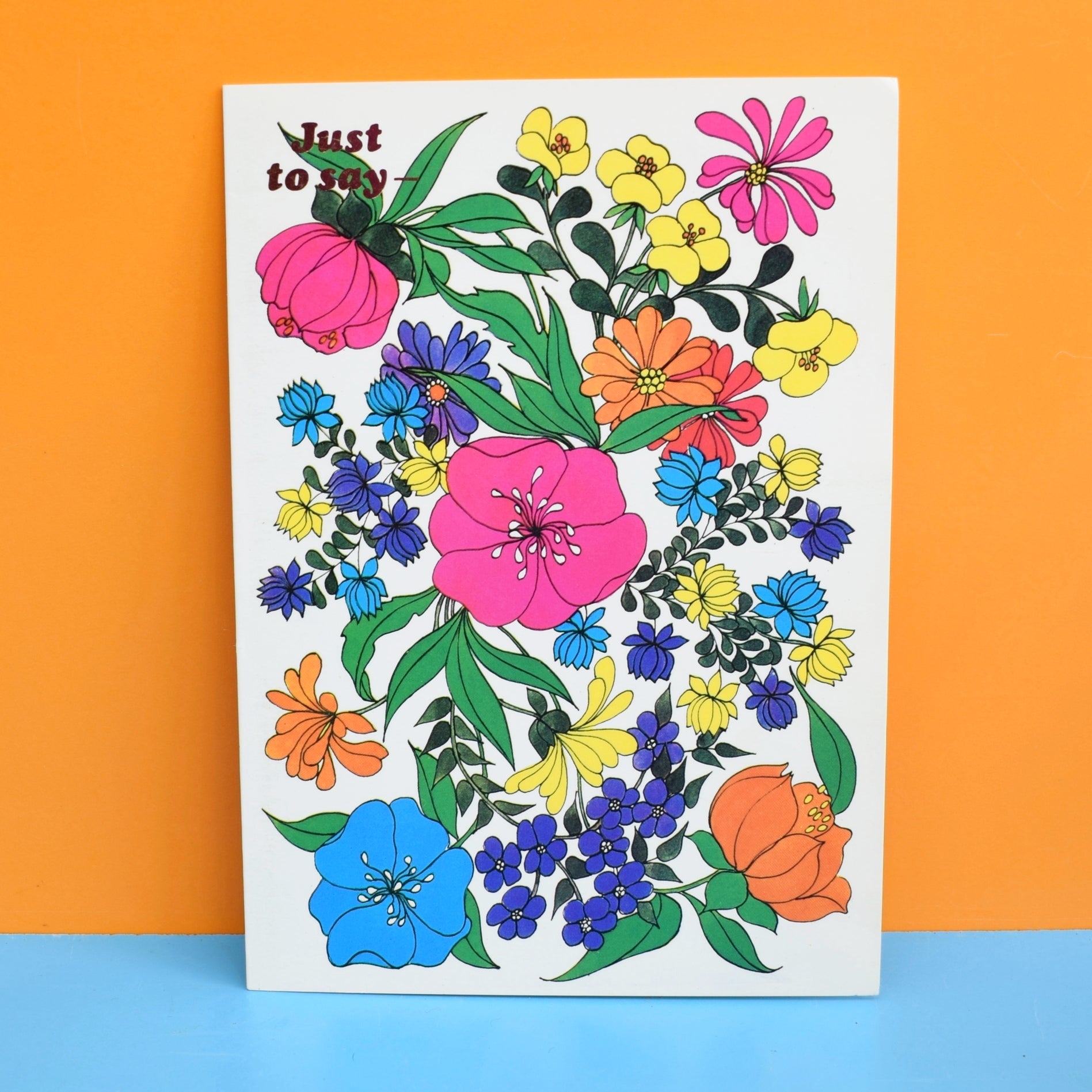 A vintage 1970s greeting card designed by Contessa Di Colbertaldo; unused and perfect for collecting or framing. Outside reads "Just to Say" (inside blank) and it comes with its original white envelope.