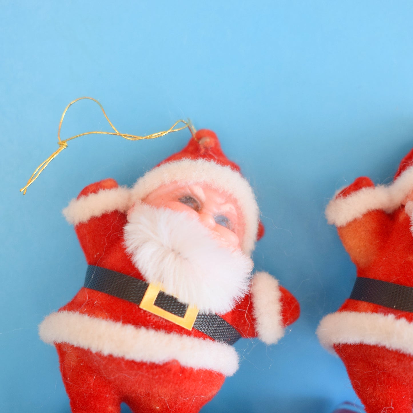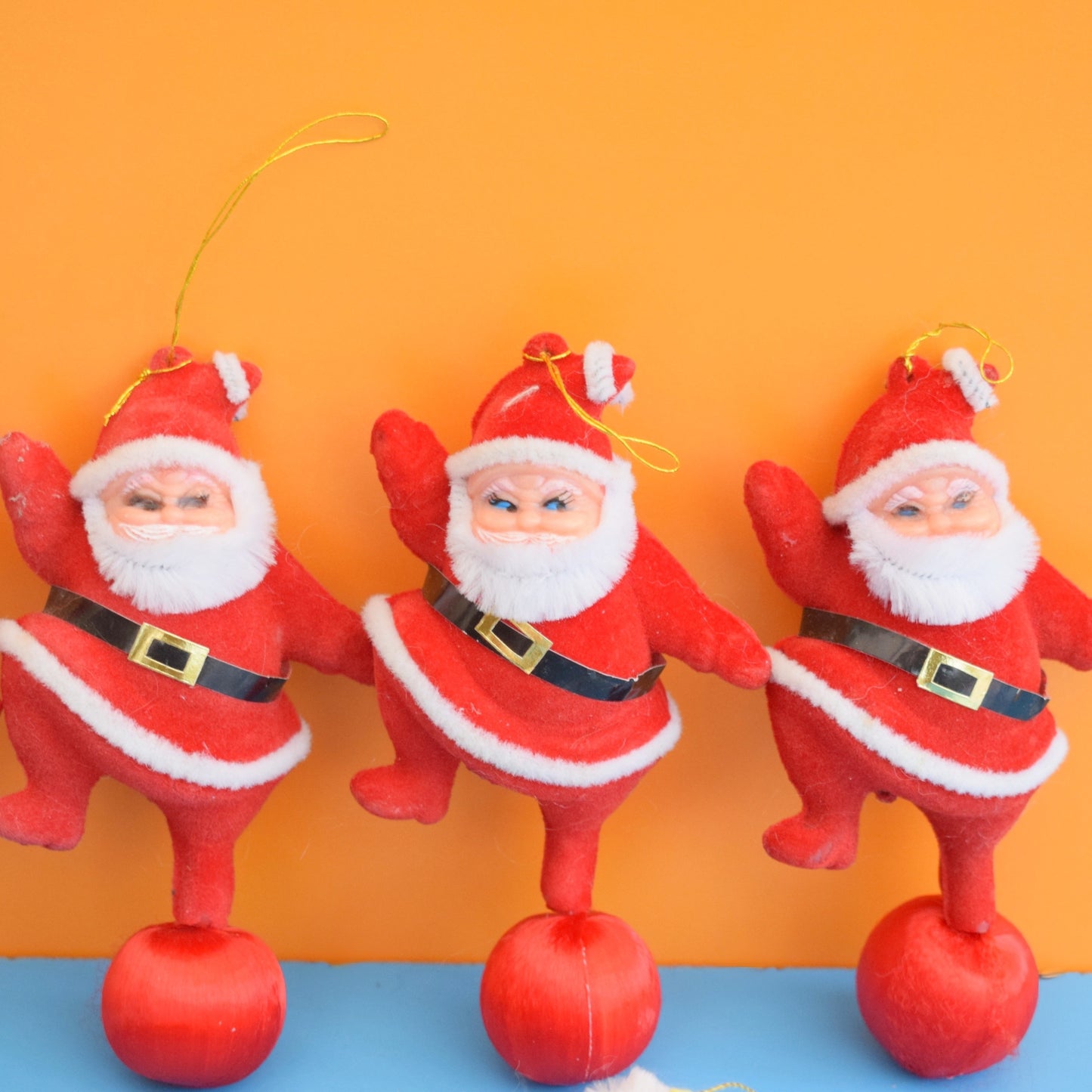 Playful, retro holiday charm: a selection of vintage 1970s flocked plastic Santa decorations perfect for collectors, seasonal displays, or anyone seeking a whimsical, nostalgic festive touch.