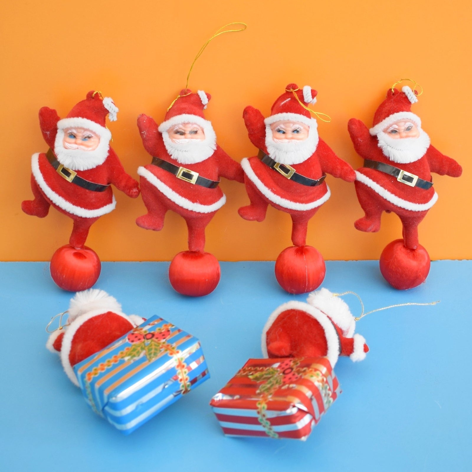 - Design Unbranded 1970s kitsch design — assorted Santas including mixed figurines, Santas mounted on decorative balls, and a pair perched on presents; brightly colored flocking and simple molded details characteristic of mid-century novelty ornaments