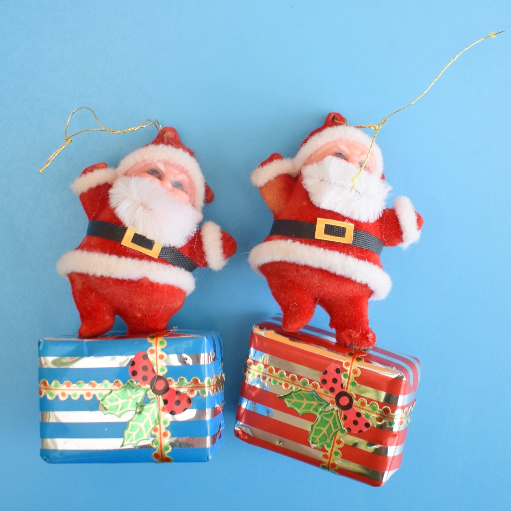 Vintage 1970s Kitsch Flocked Plastic Christmas Decorations - Santas