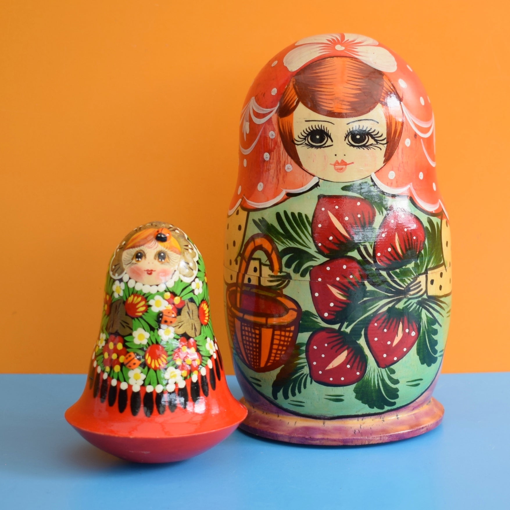 - Design Russian nesting / roly-poly style; manufacturer unknown; hand-painted strawberry motif on the larger doll and painted ladybird on the smaller wobbling figure