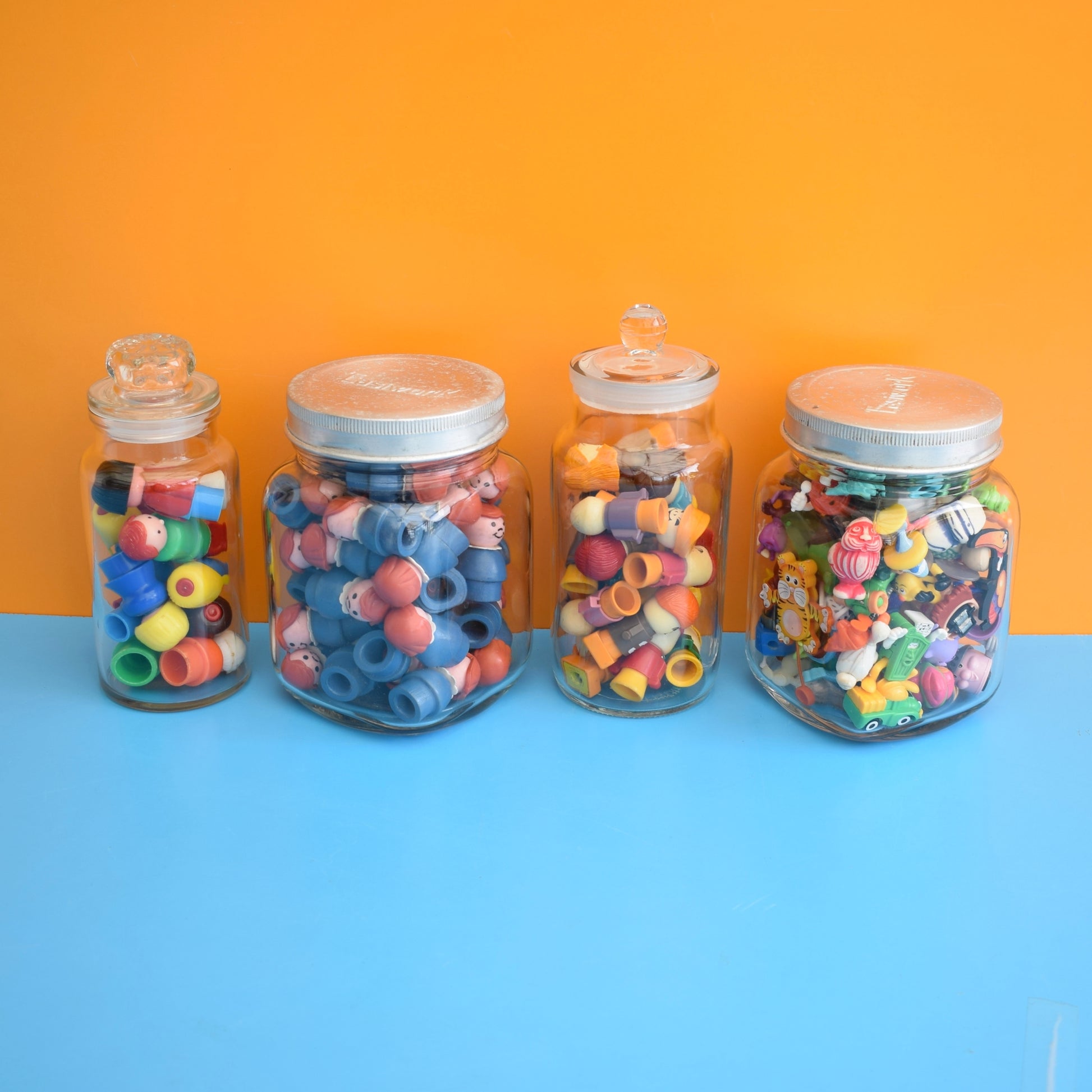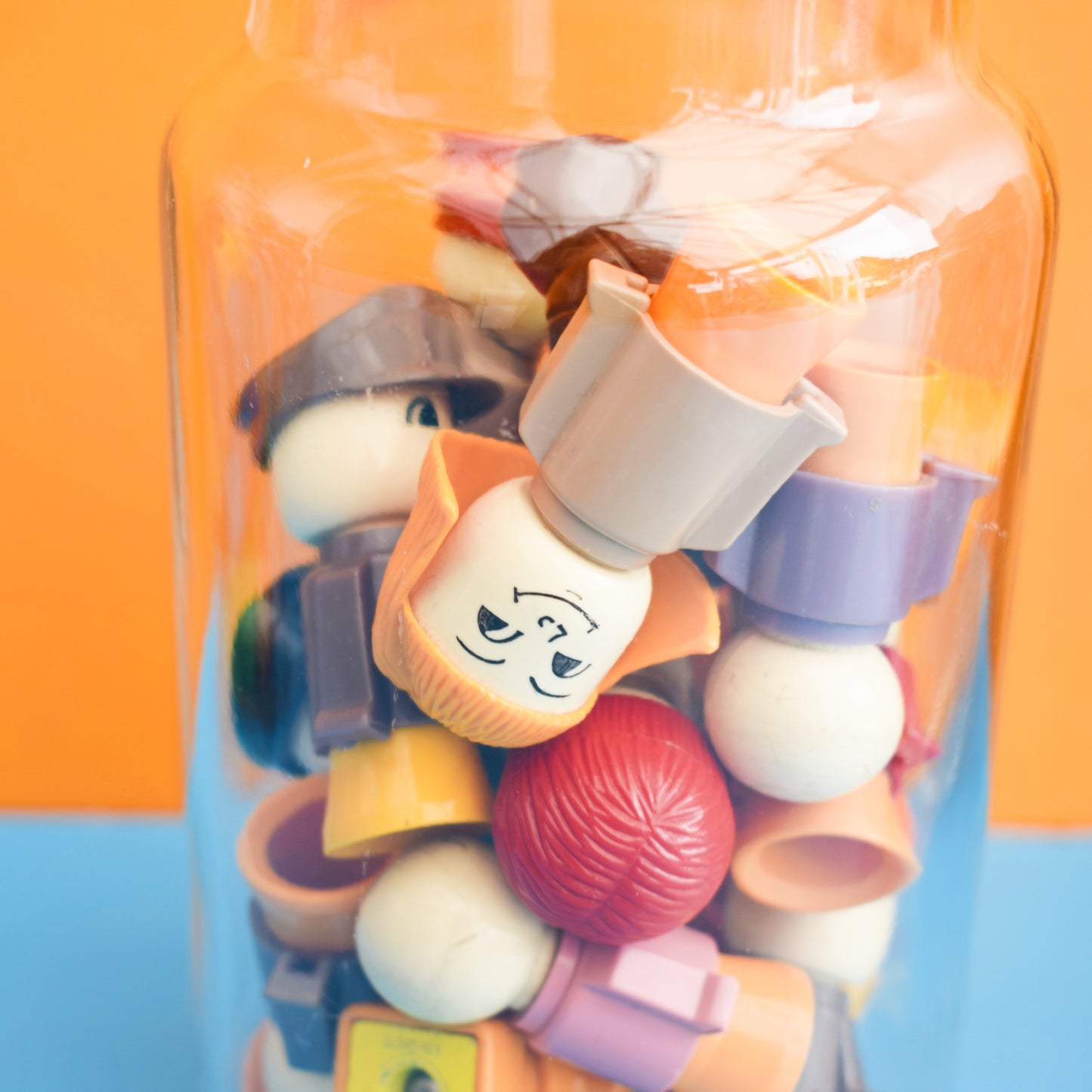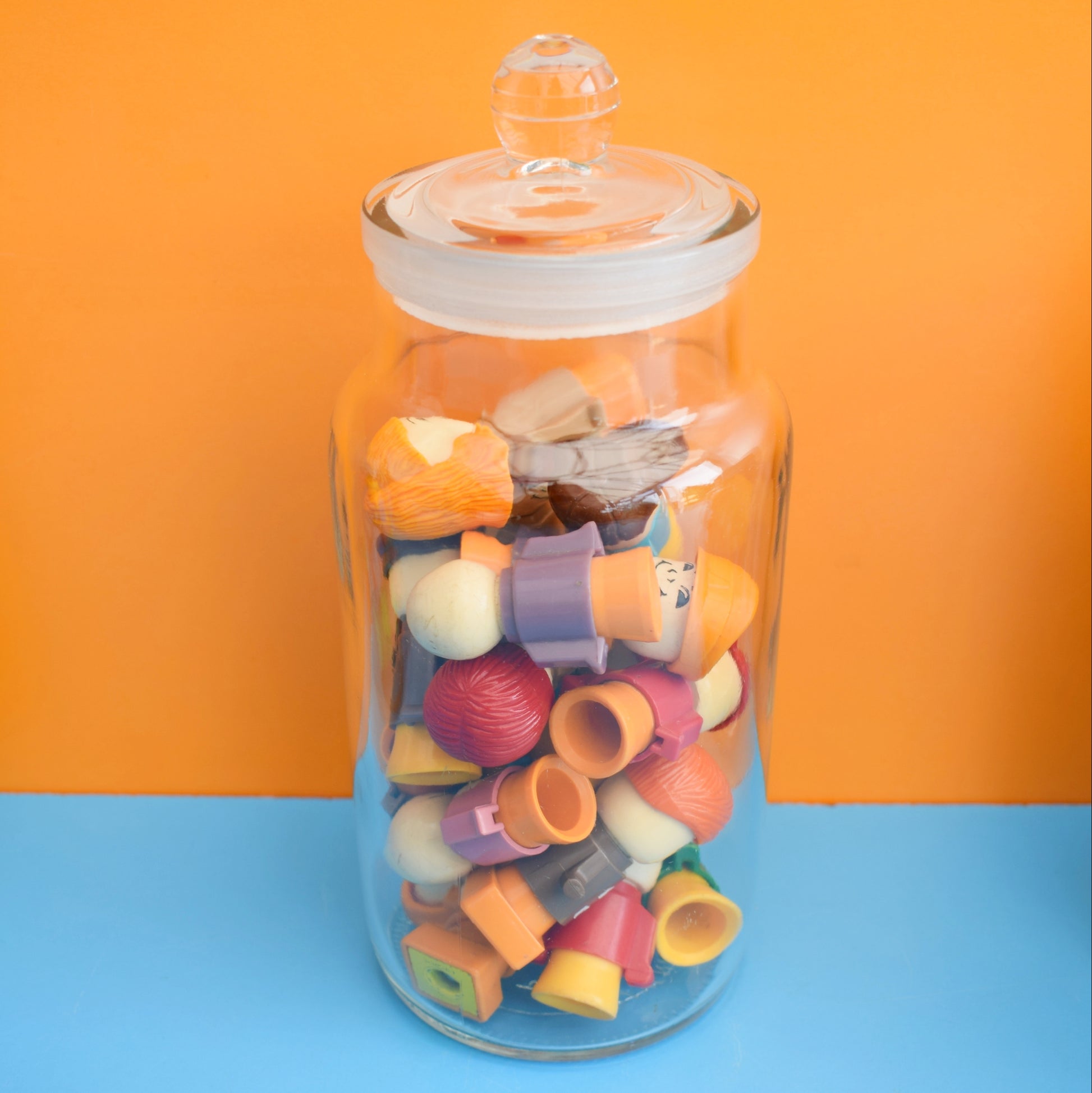 A vintage (glass) jar, filled with vintage, plastic, Matchbox figures