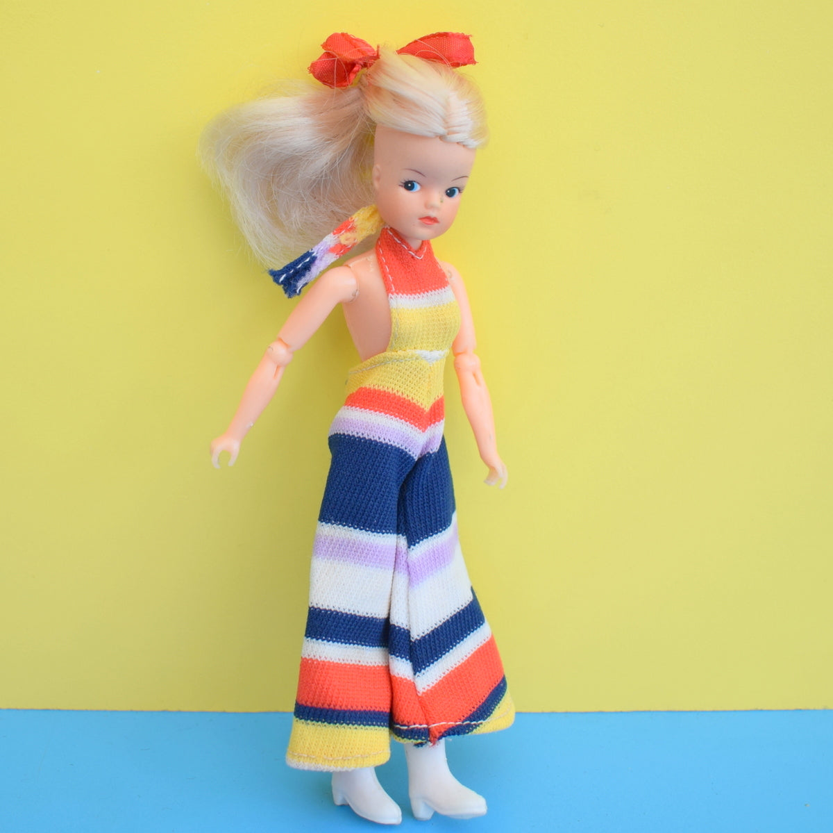Sarah Louise Doll (Debenhams) Slightly loose limbs- original elastic inside. One mark on her nose (may come off) original elastic band and ribbon in her hair. She is wearing a striped jumpsuit and white boots