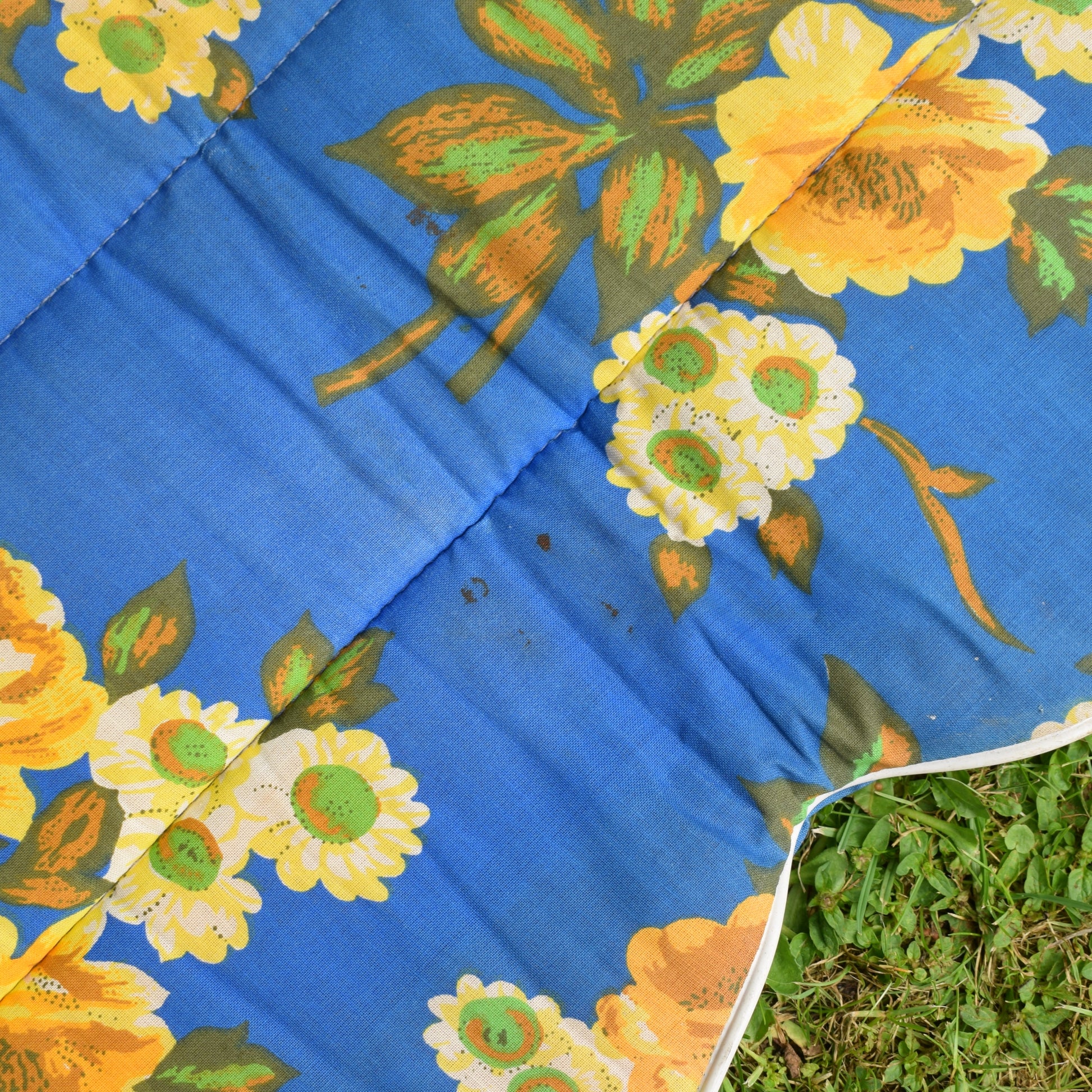 This long padded lounger captures the vibrant, nostalgic spirit of 1970s textile design with a versatile blue floral motif that suits retro interiors or outdoor leisure. The padded construction offers comfortable, casual seating for laid-back living, while the rollable format makes it simple to transport and store. The elastic loop on the back shows gentle bagging from age — noted above — which is typical for a genuine vintage piece and adds to its authentic character.