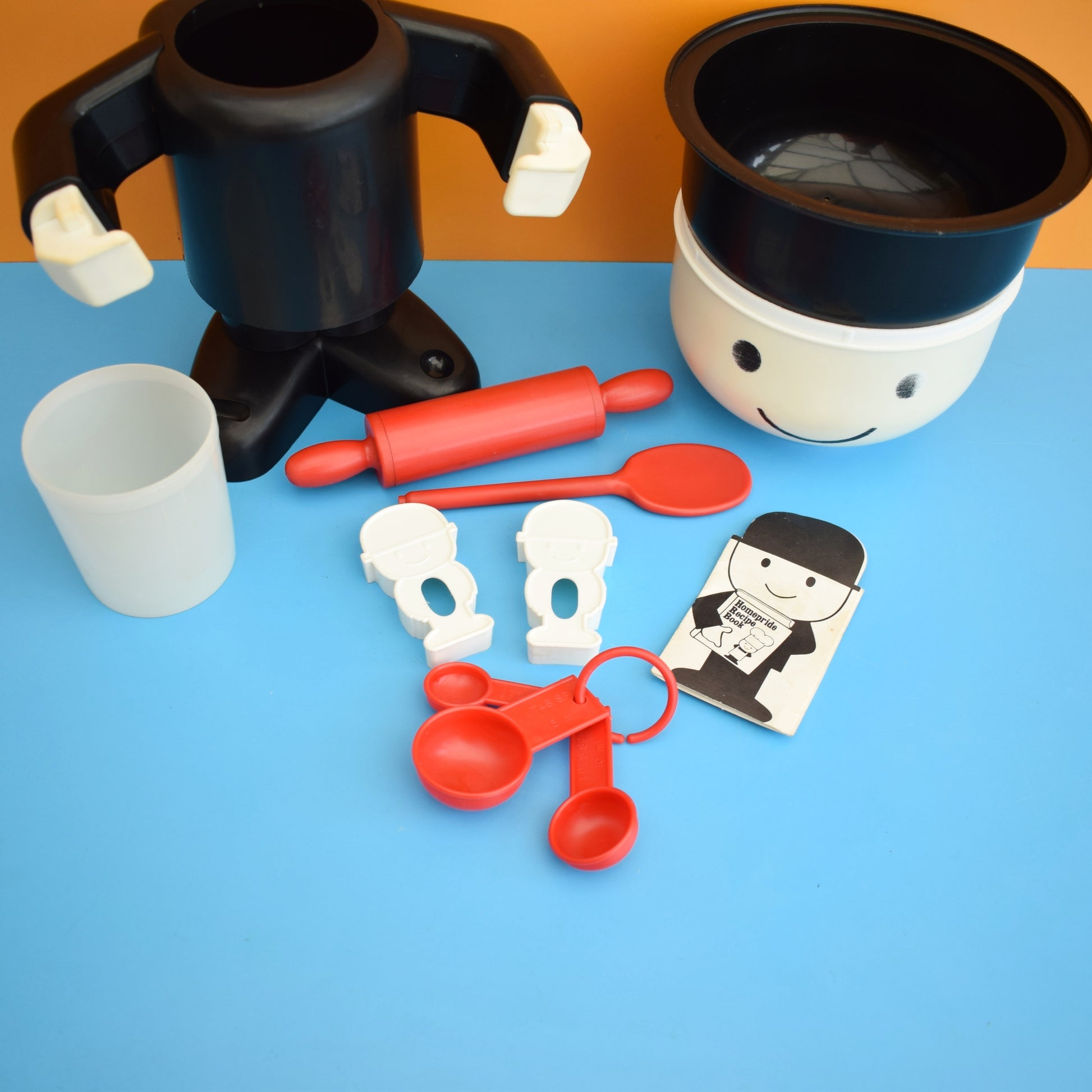 A cheerful, collectible 1970s plastic baking set featuring Spillers’ iconic Homepride “Fred” — perfect for vintage advertising collectors, retro kitchens, or as a nostalgic display piece. Playful, well-preserved and offered with original paperwork for one complete set.