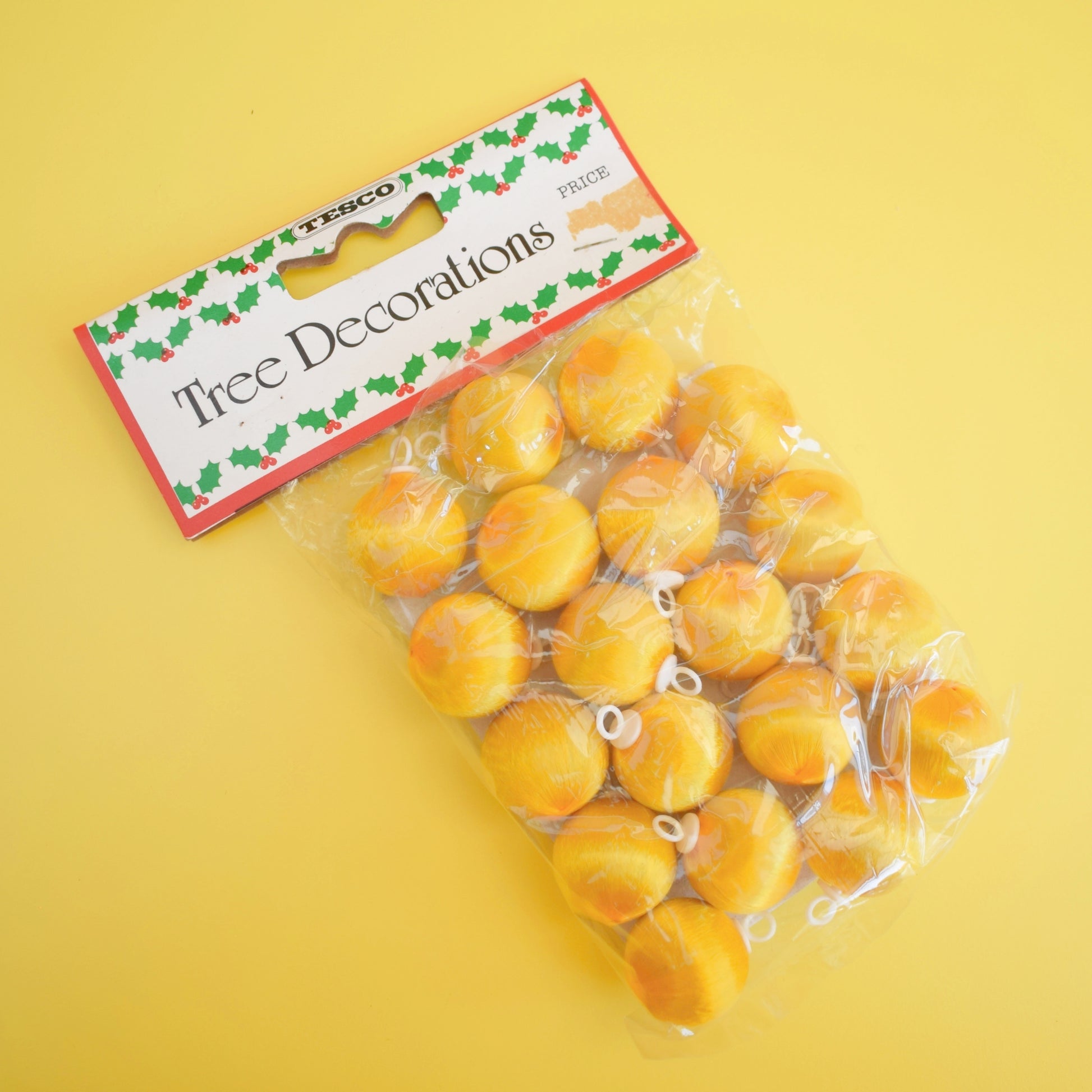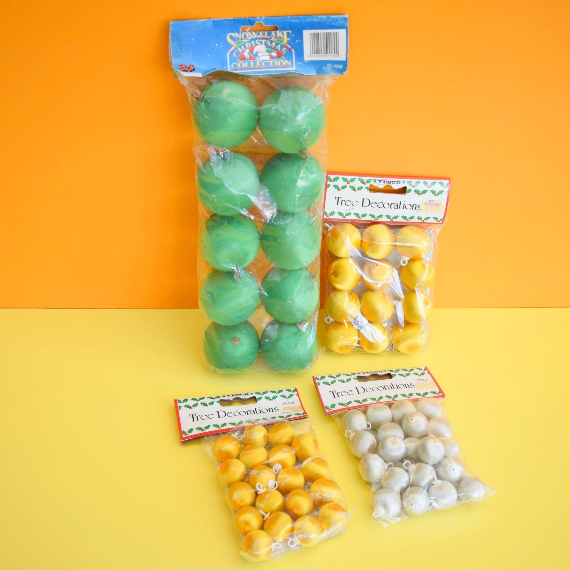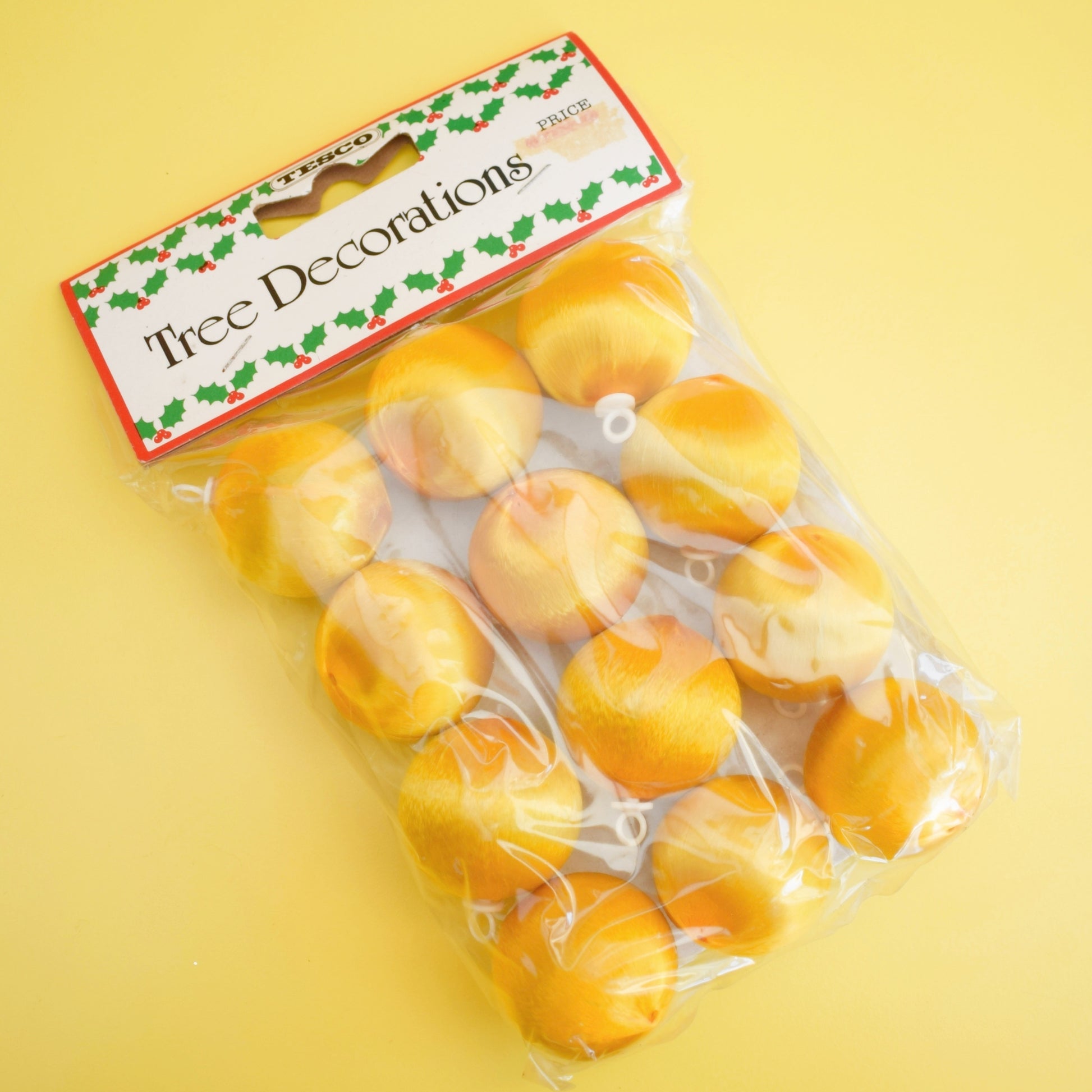 Authentic 1970s satin-finish Christmas baubles sold per unused packet — perfect for vintage collectors, stylists, and anyone seeking a soft, retro holiday look in yellow, white or green.
