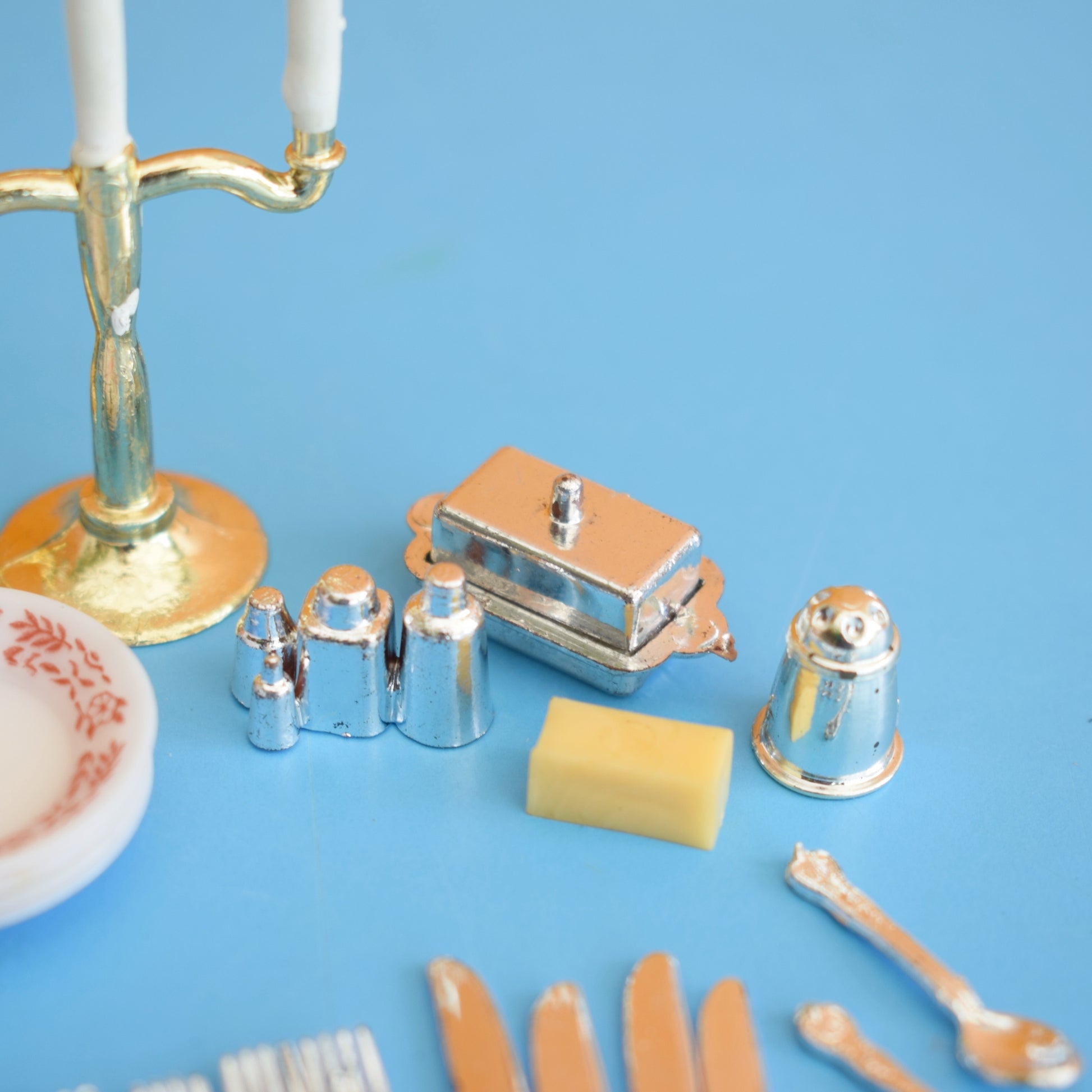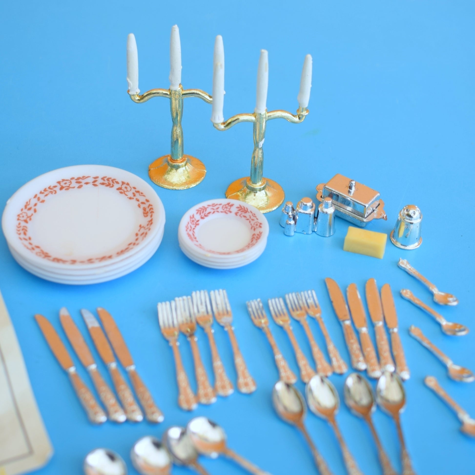 This curated set includes tiny forks, knives, spoons, small plates and decorative pieces such as a miniature candelabra — each showing crisp moulding and the gentle patina of careful previous ownership. The original paperwork is included, adding provenance and extra value for display or resale.