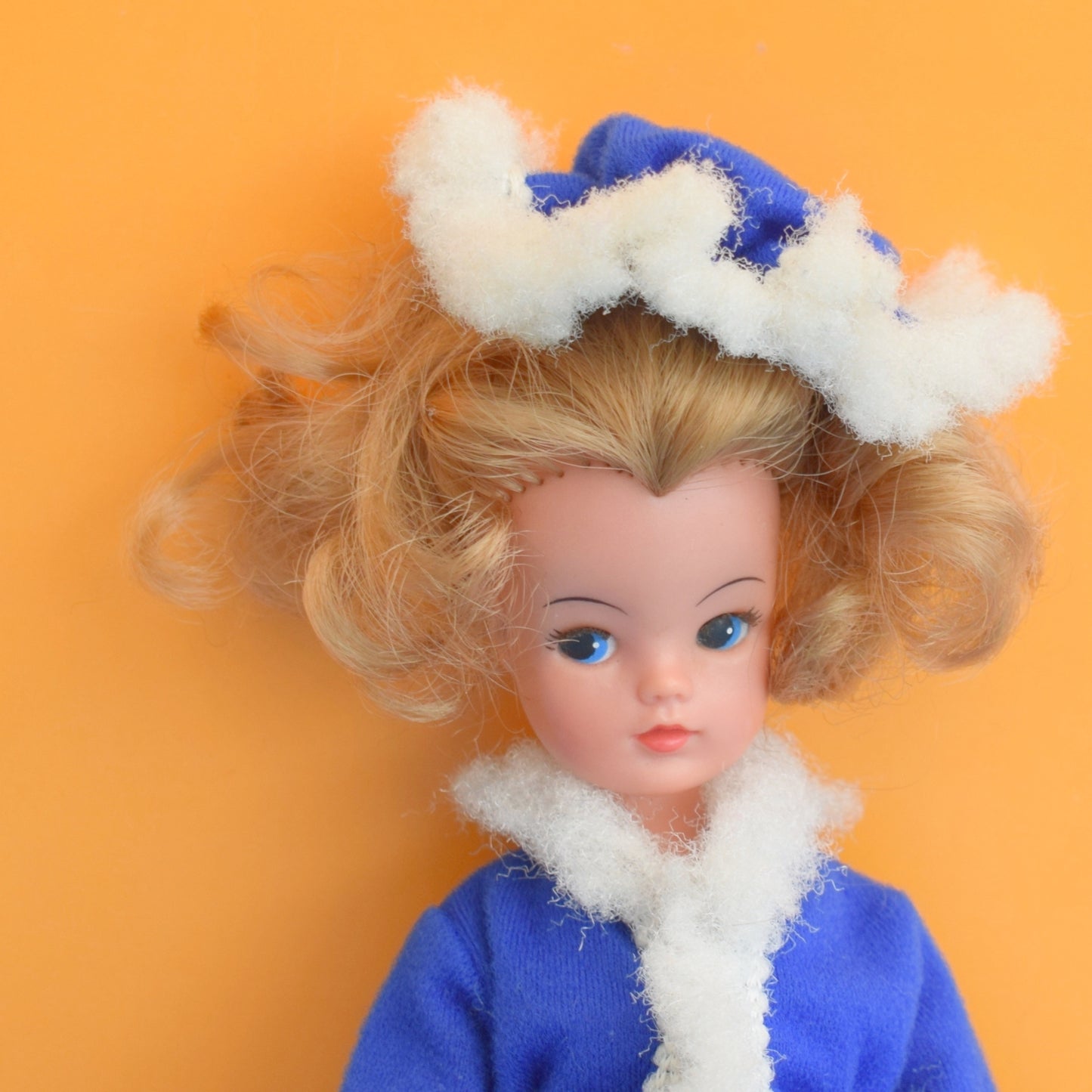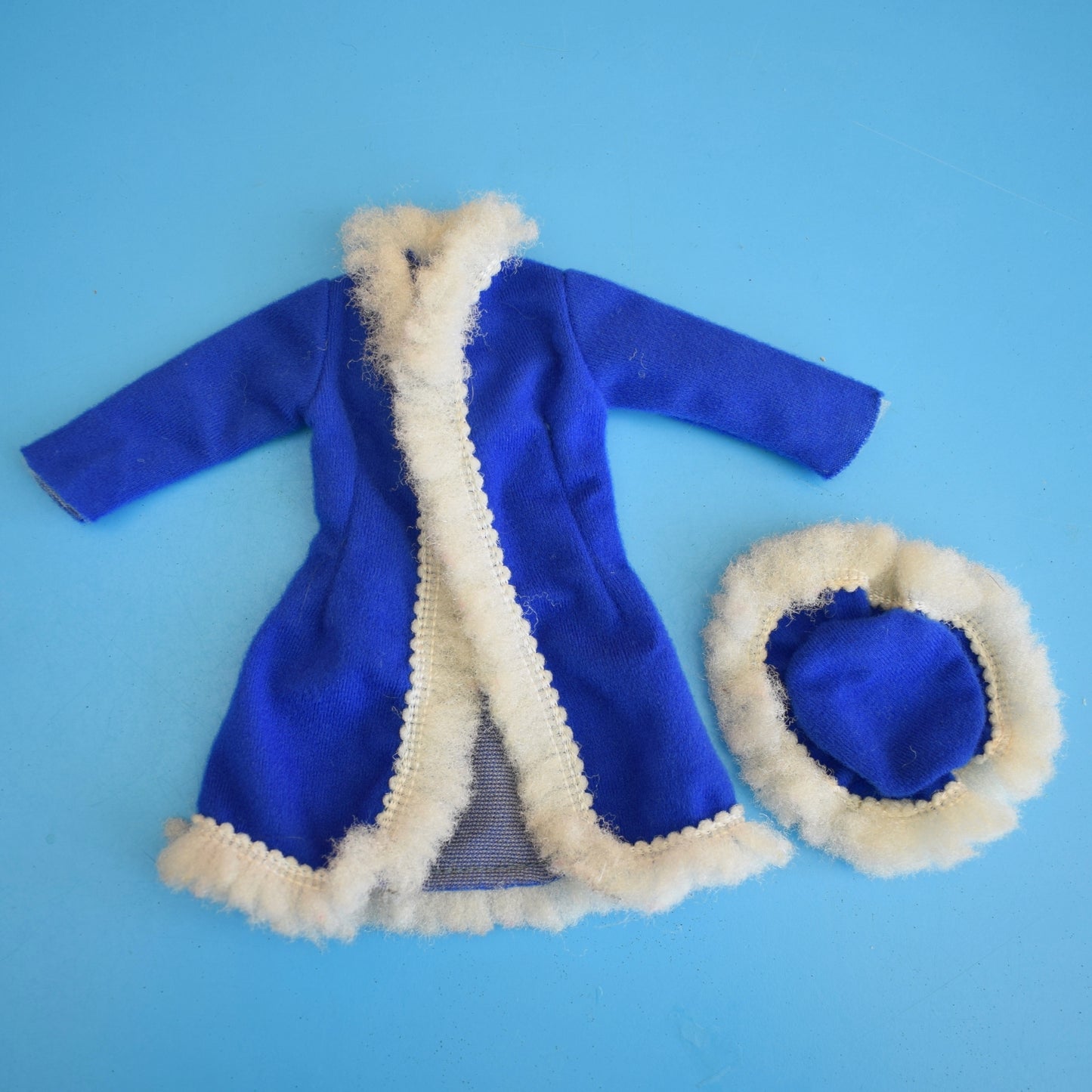 This blue and white coat set showcases classic 1970s silhouette and detailing — neat seams, faithful trims and a versatile palette that complements many Sindy wardrobes. Perfect for collectors restoring a period look or for creative doll styling, the outfit is tactile, wearable and ready to display.