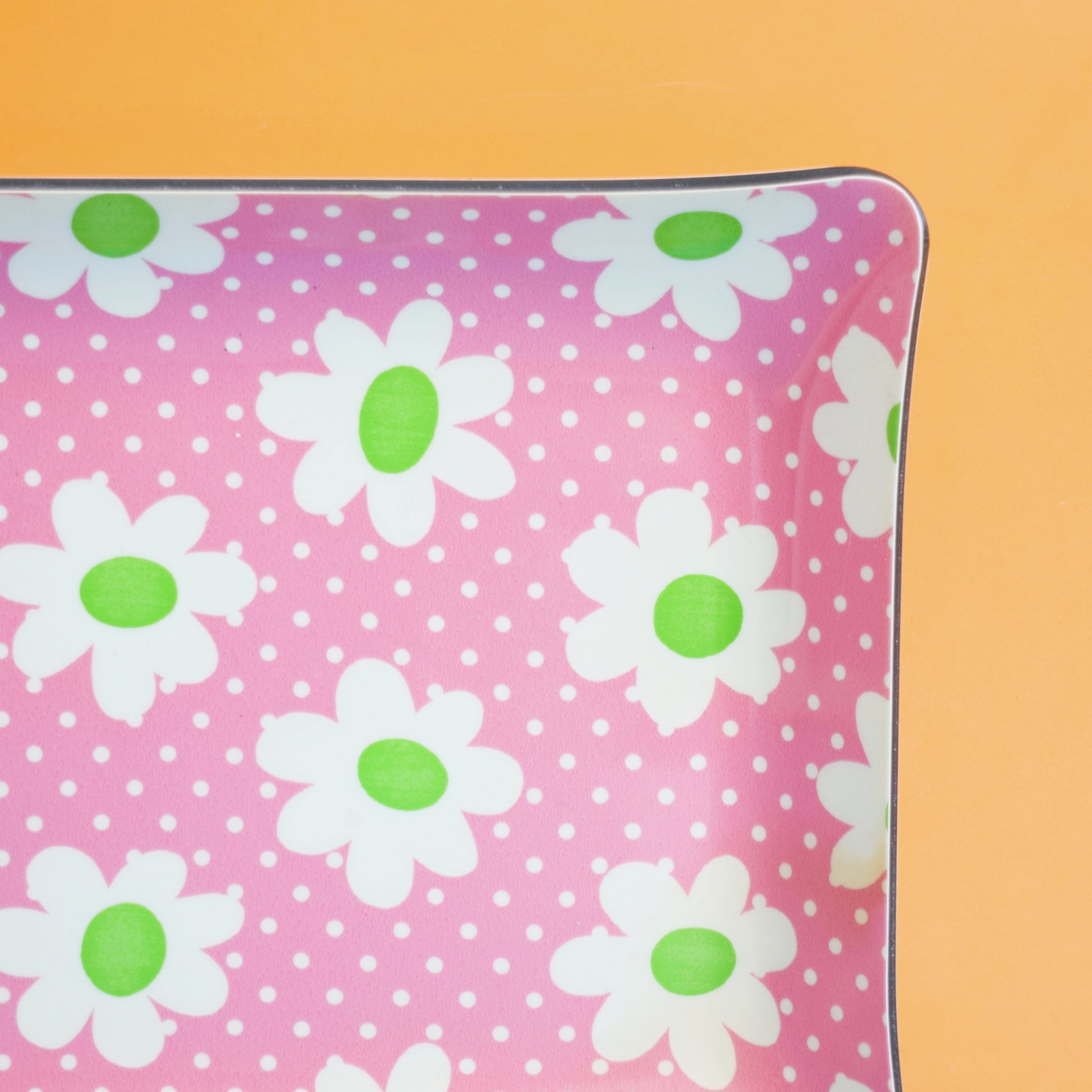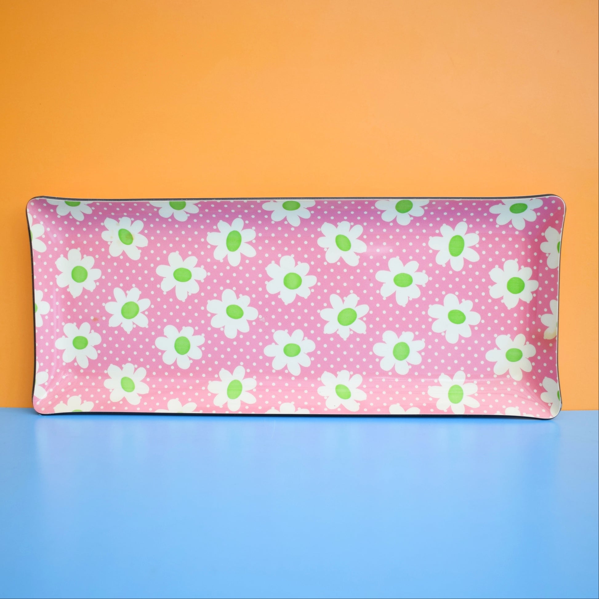 It has a bold flower design. Pink background, cream daisies (green centres)