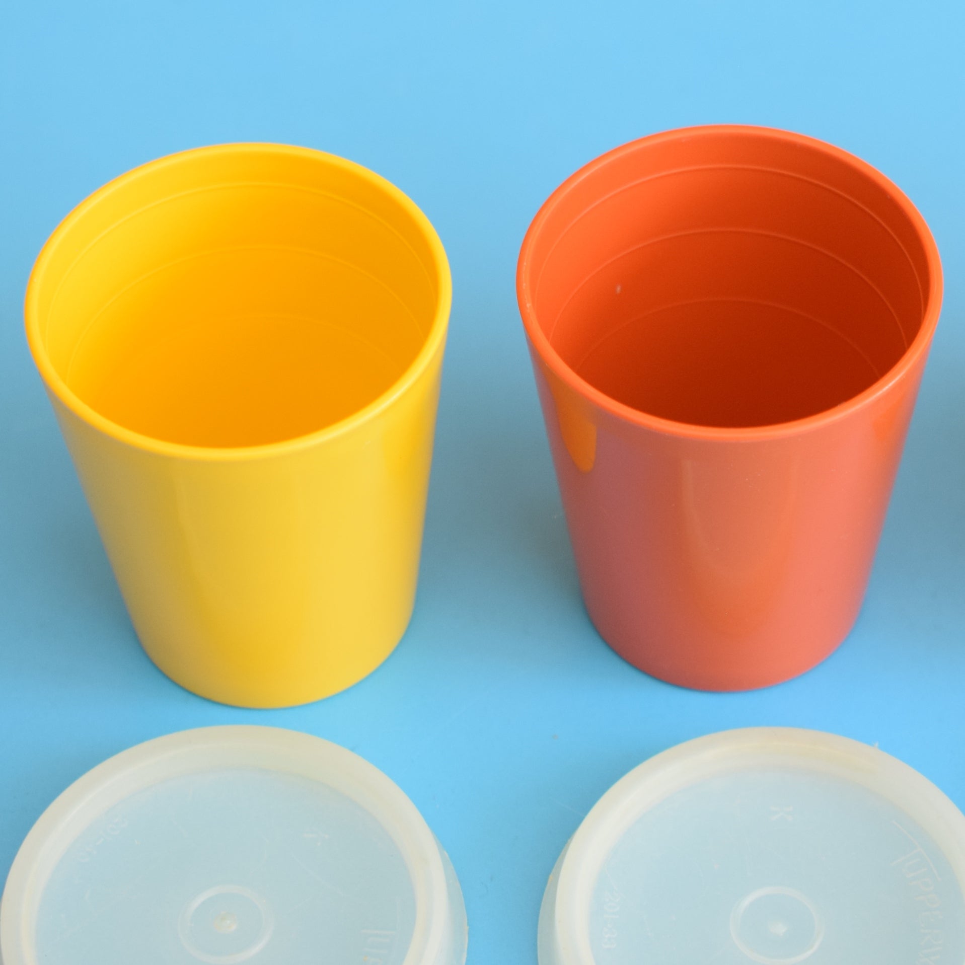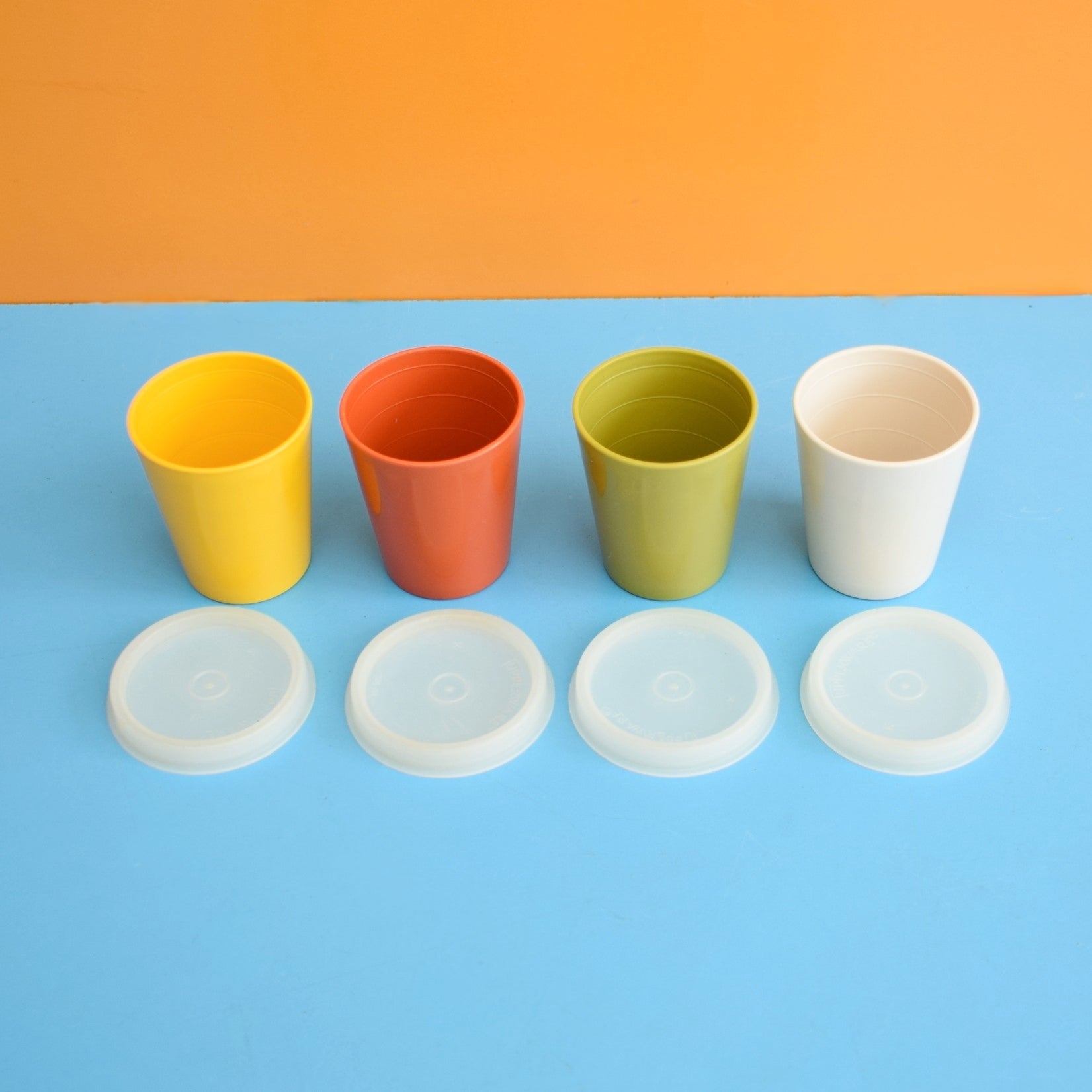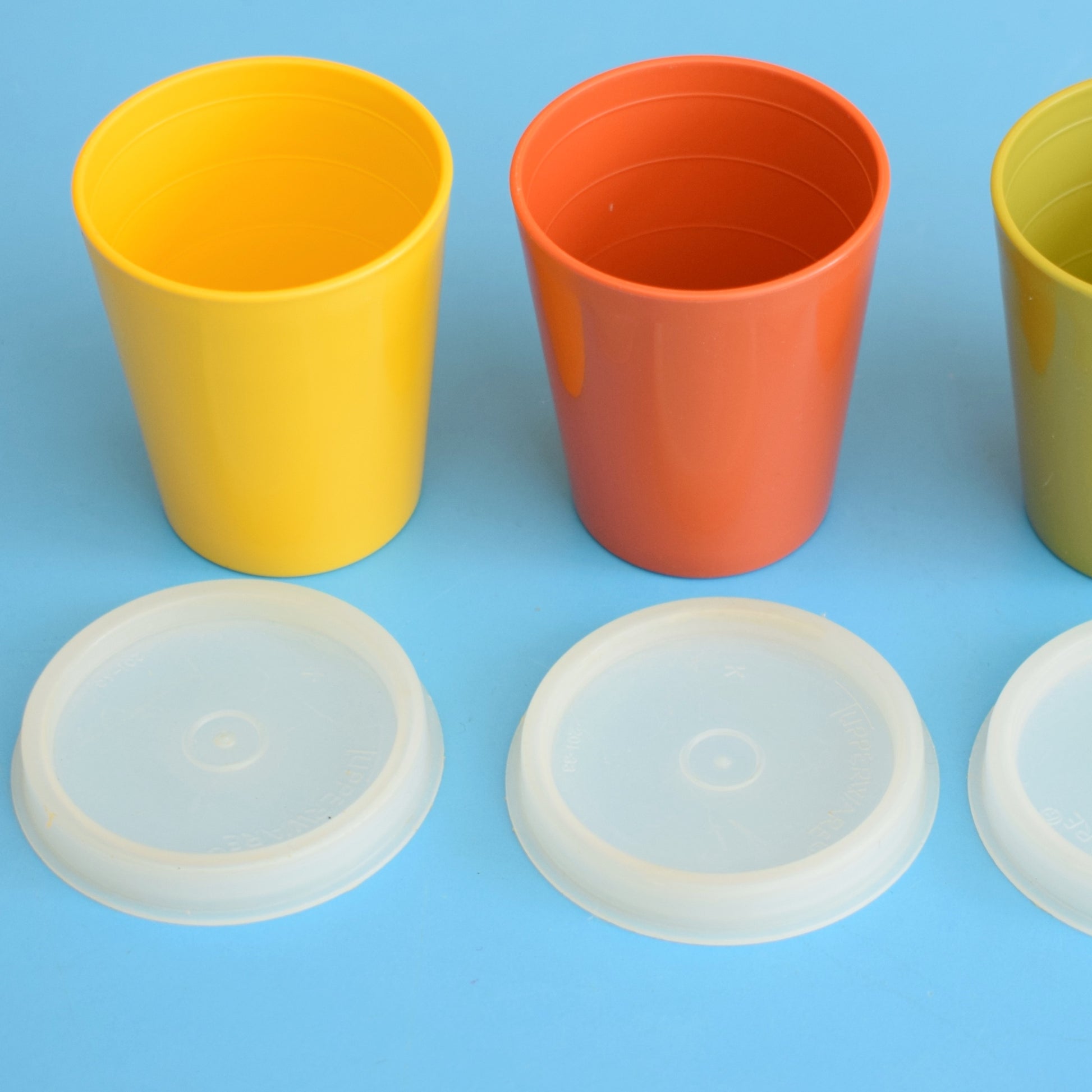 This is a set of vintage 1970s plastic, Tupperware pots, with lids