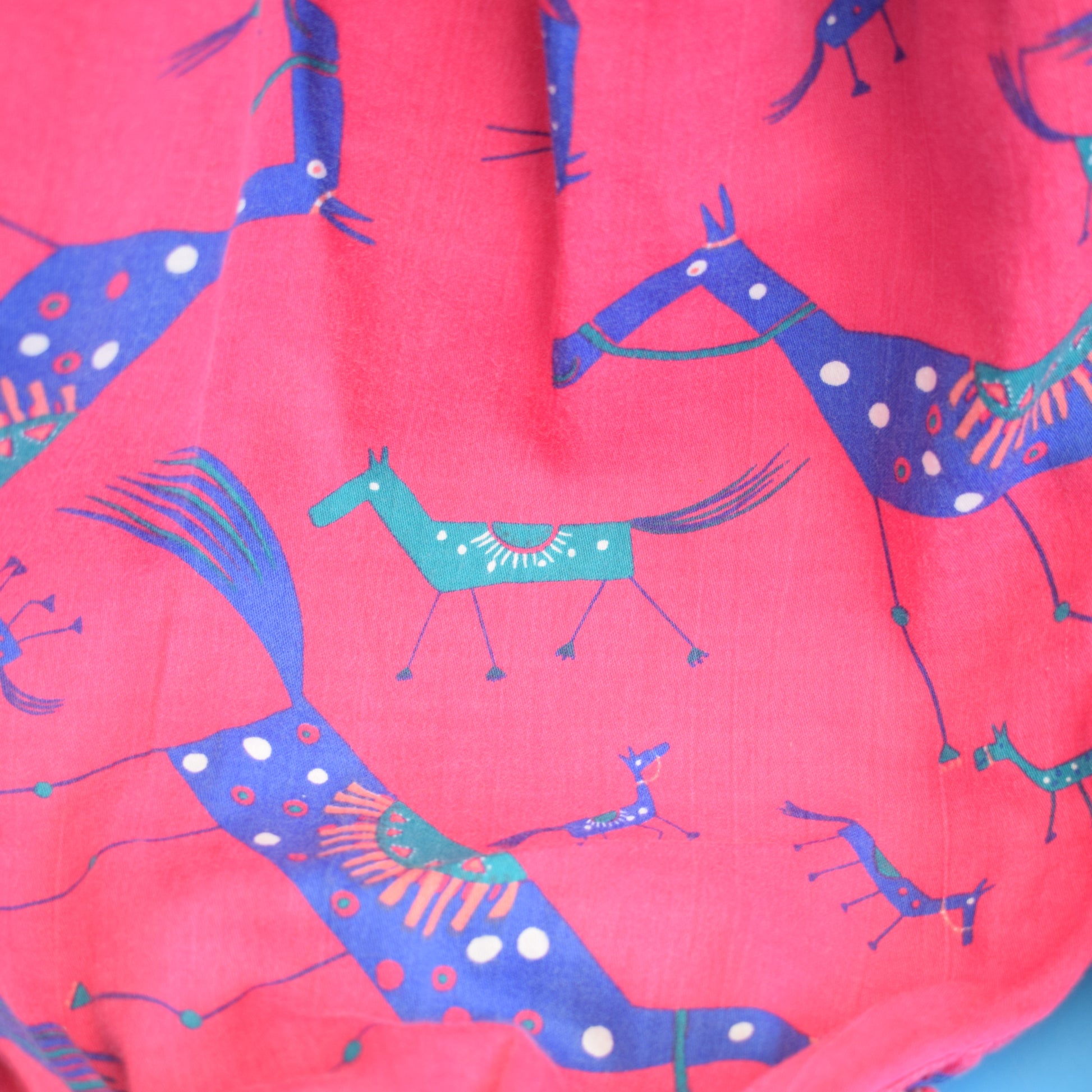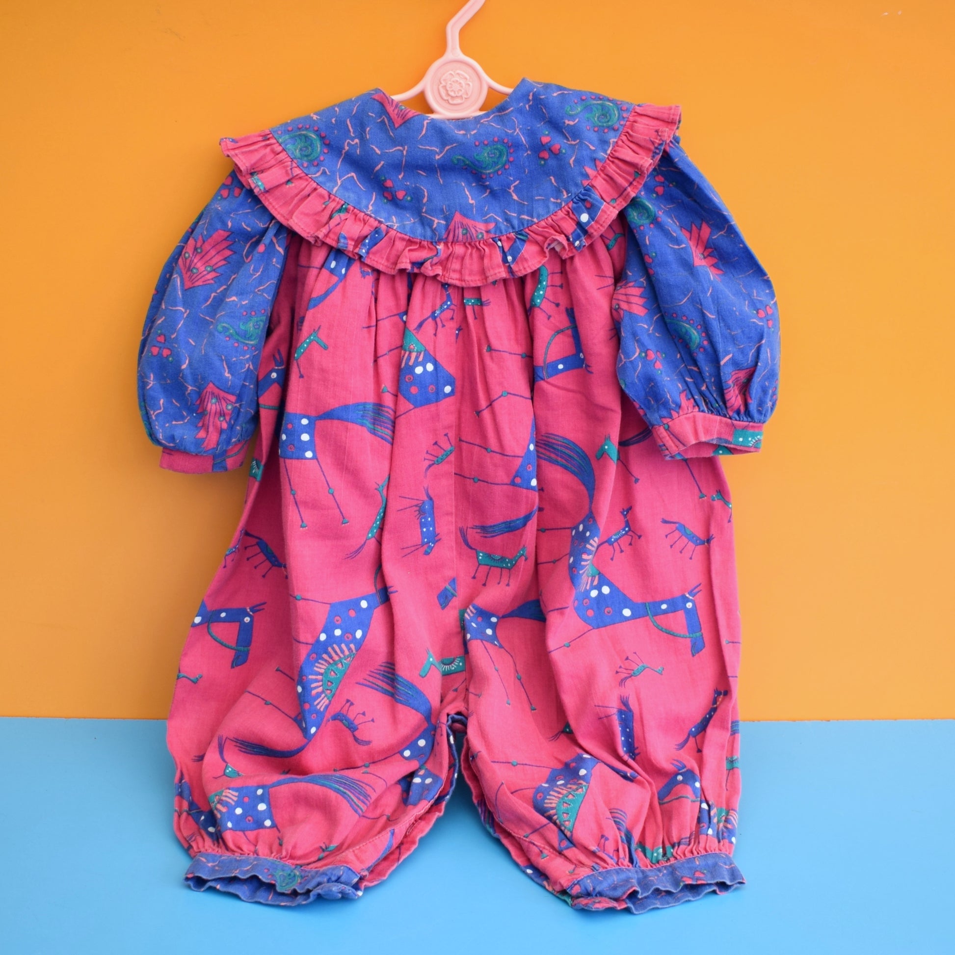 A fantastic stylised horse print in magenta, bright blue and teal, with a frilled collar and bows down the front (buttons underneath, and at the legs