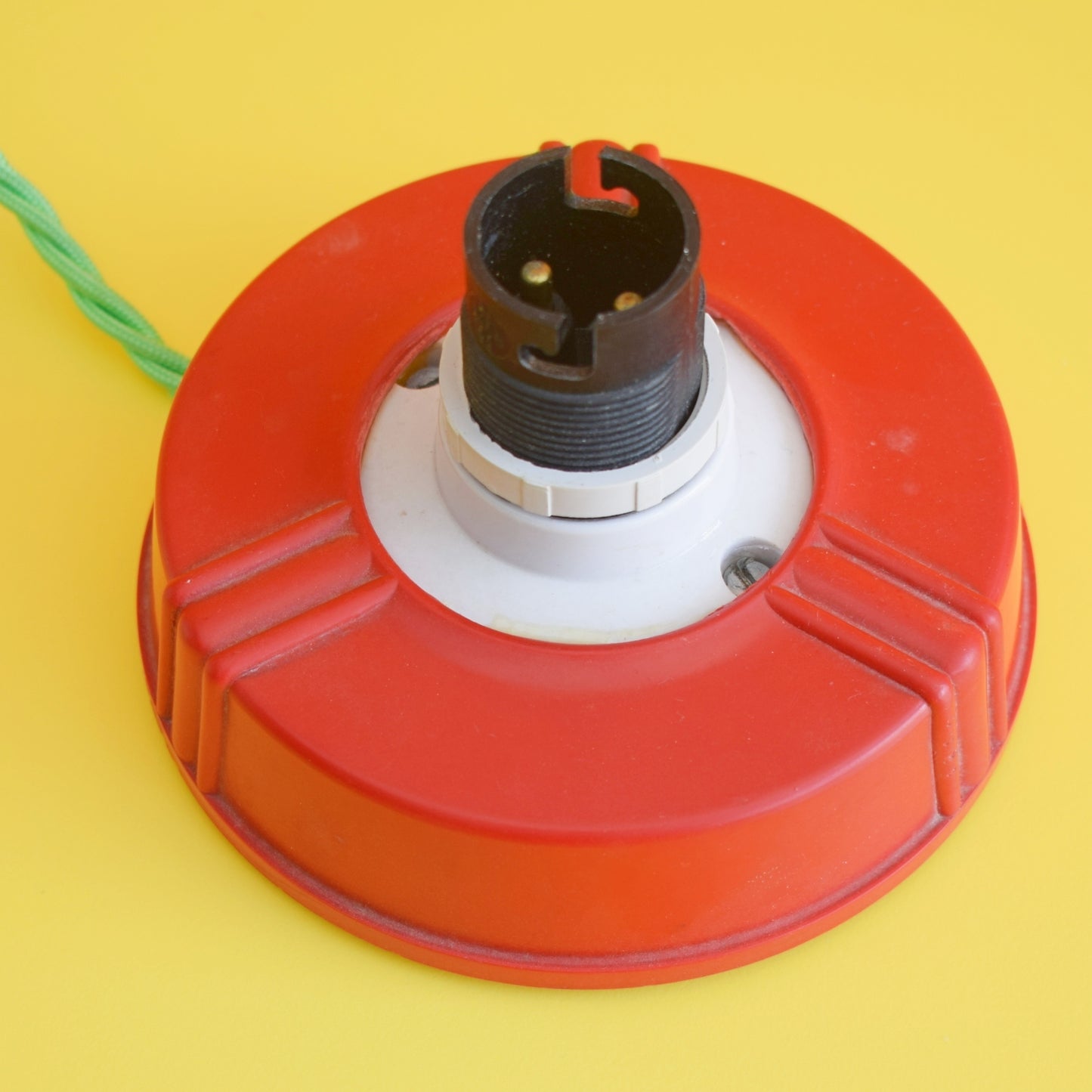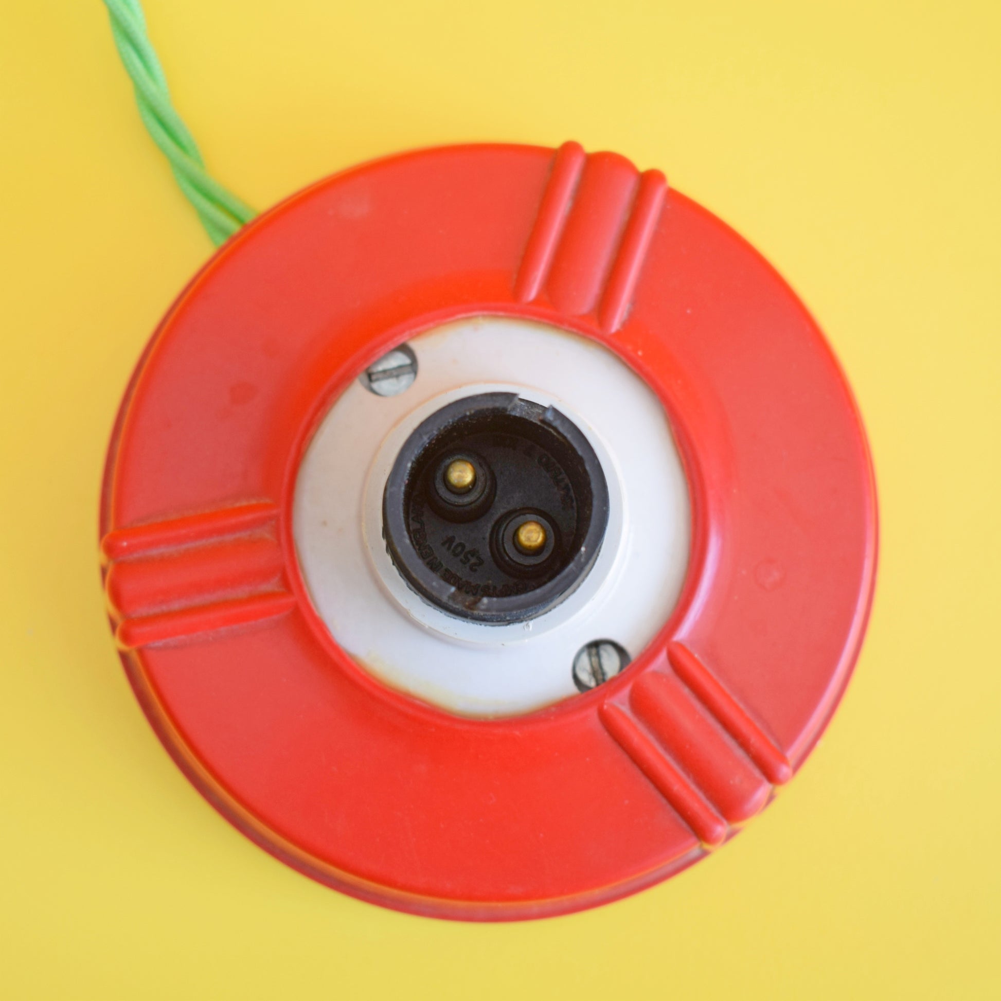 The base was missing when i found this, so i have very carefully made one using an old red bakelite sweet jar lid and modern bulb holder. Inside the lid is a piece of solid oak to weigh it down. Finished with a fresh green, modern 3 core twisted cable and new plug
