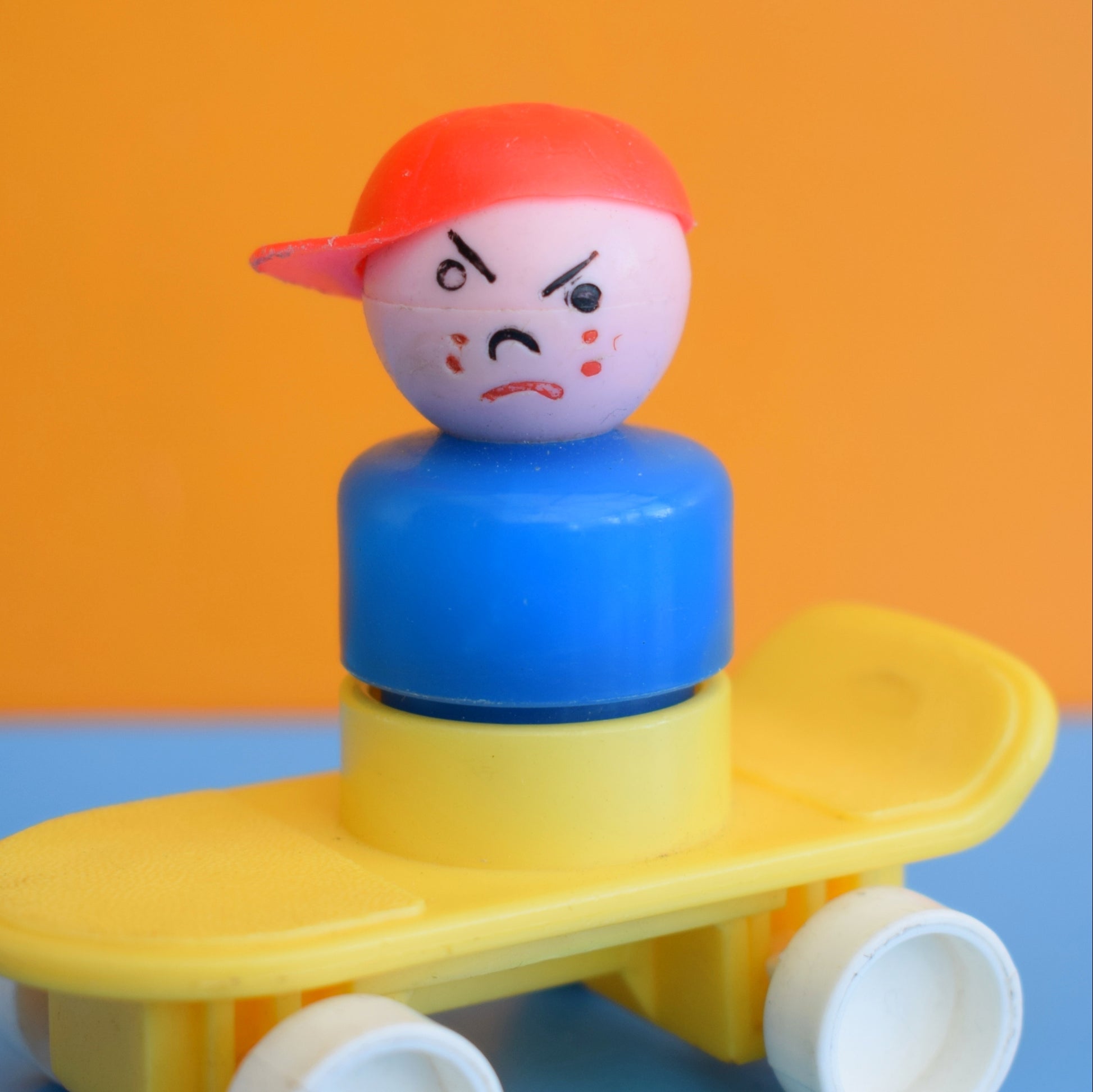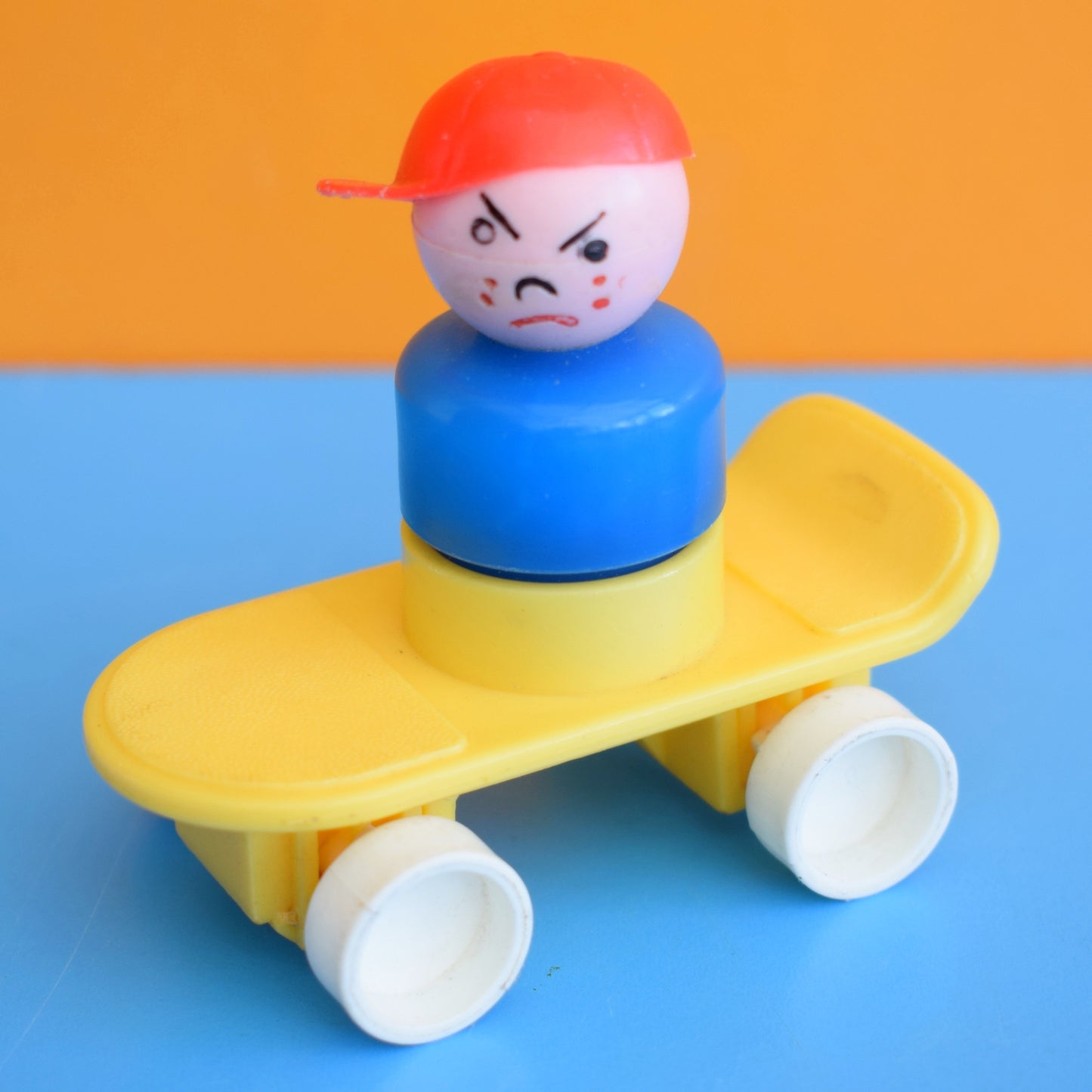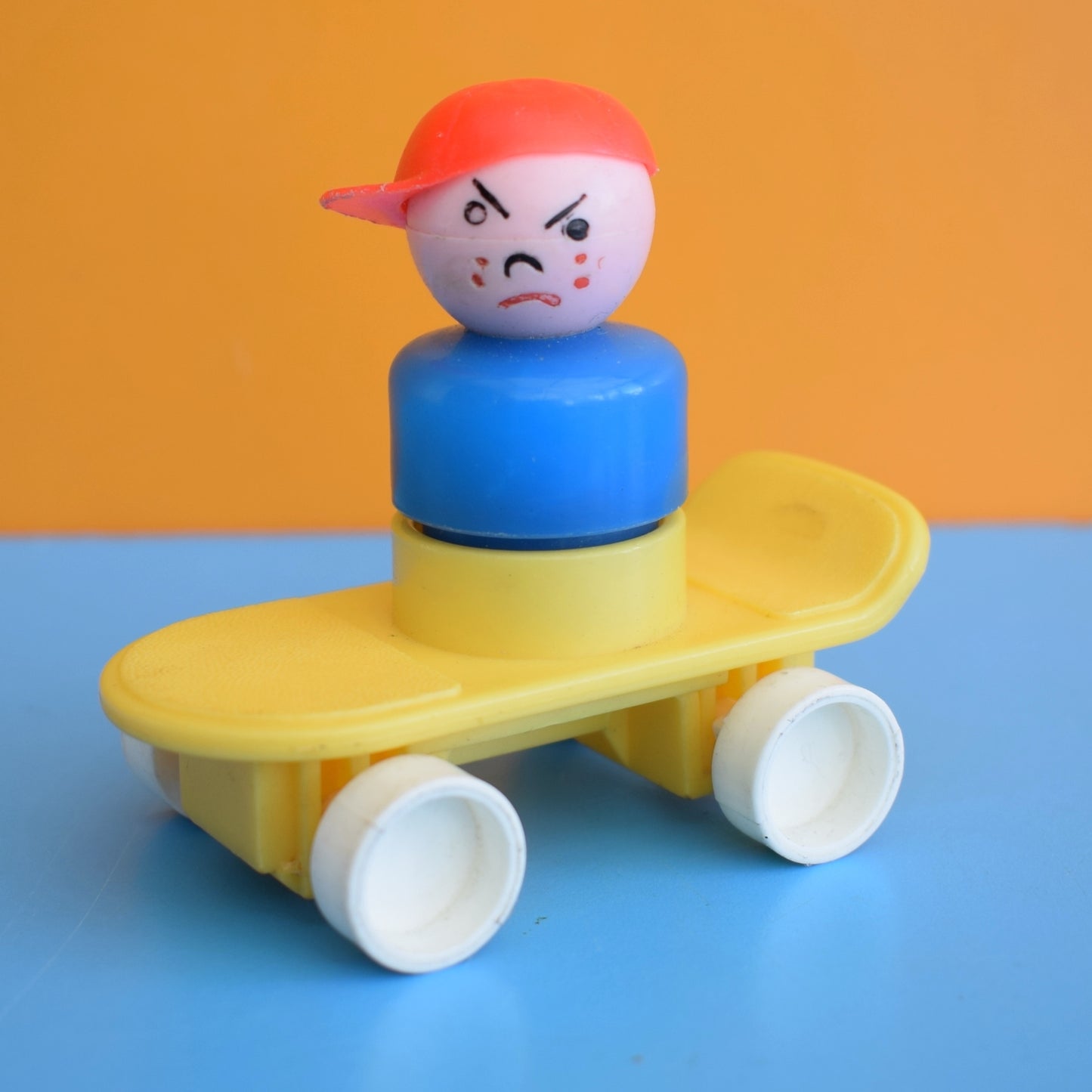 A yellow plastic FP skateboard, with little person (angry boy)!