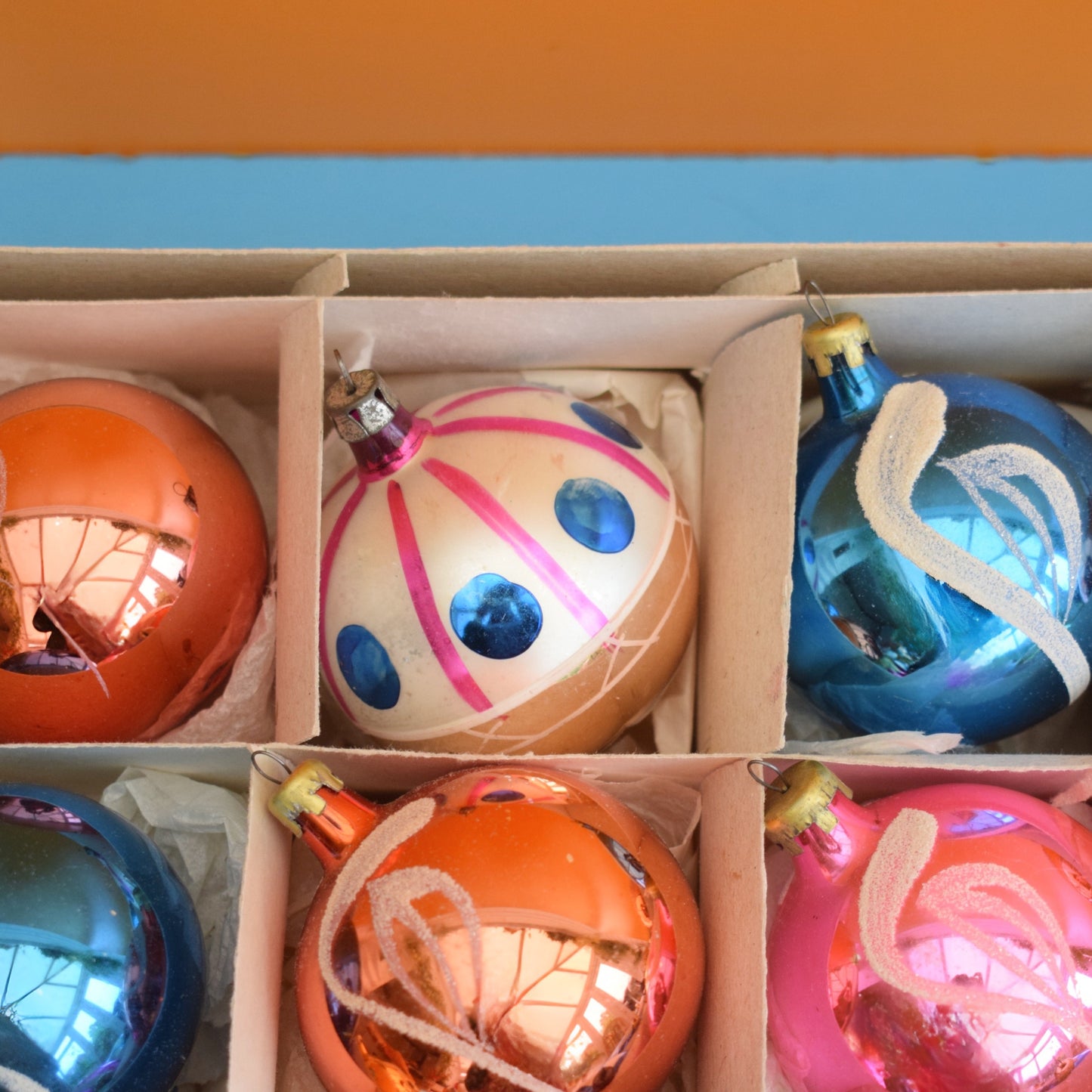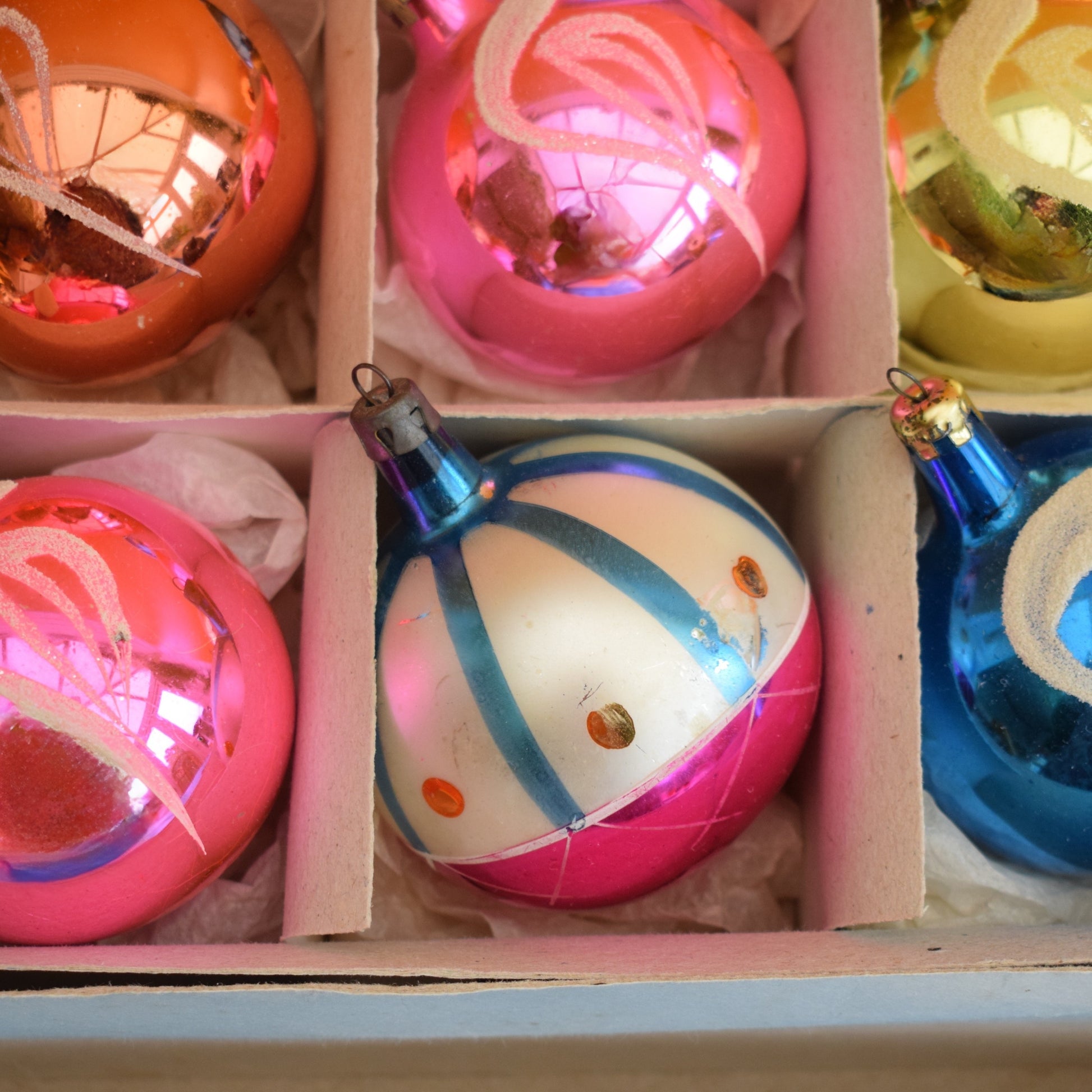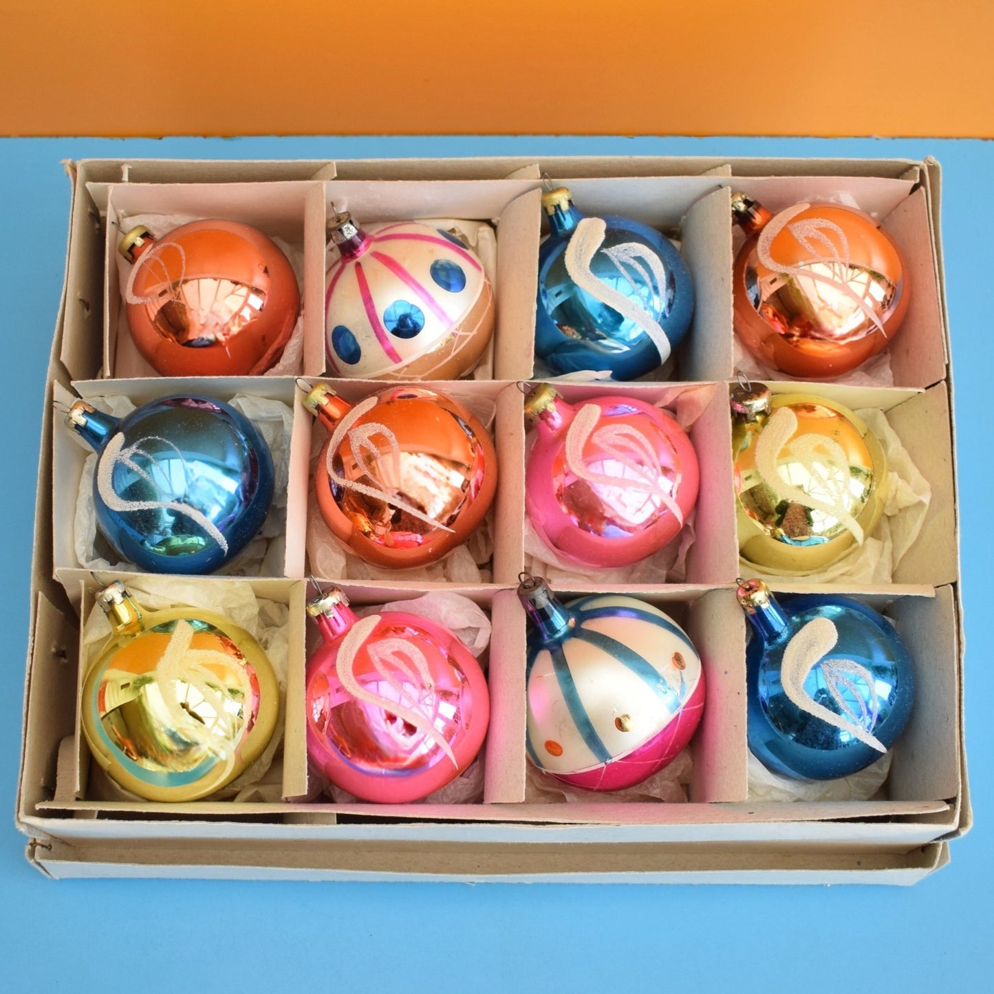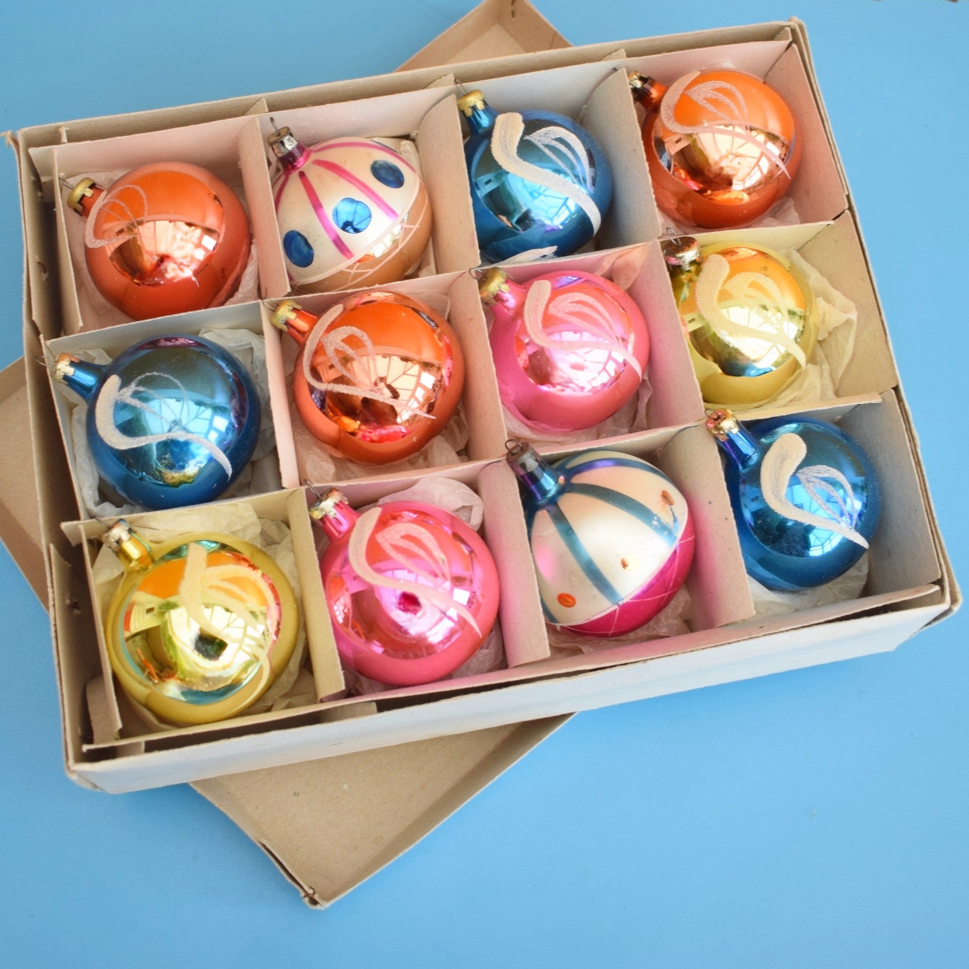 This is a box of vintage, gorgeous, glass christmas baubles.
