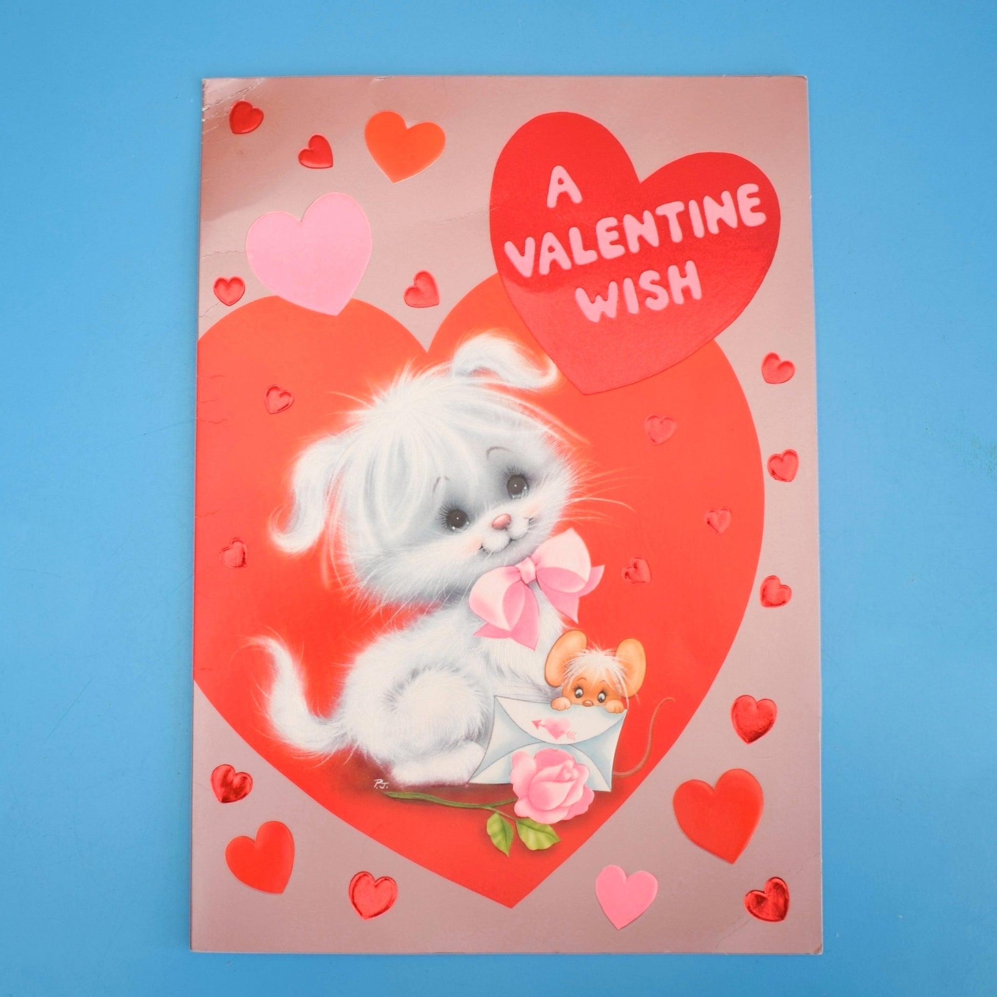 Charmingly retro and delightfully kitsch, this vintage 1980s Valentine's card features an adorable kitten illustration — perfect for collectors, nostalgic senders, or anyone decorating with playful, vintage ephemera.