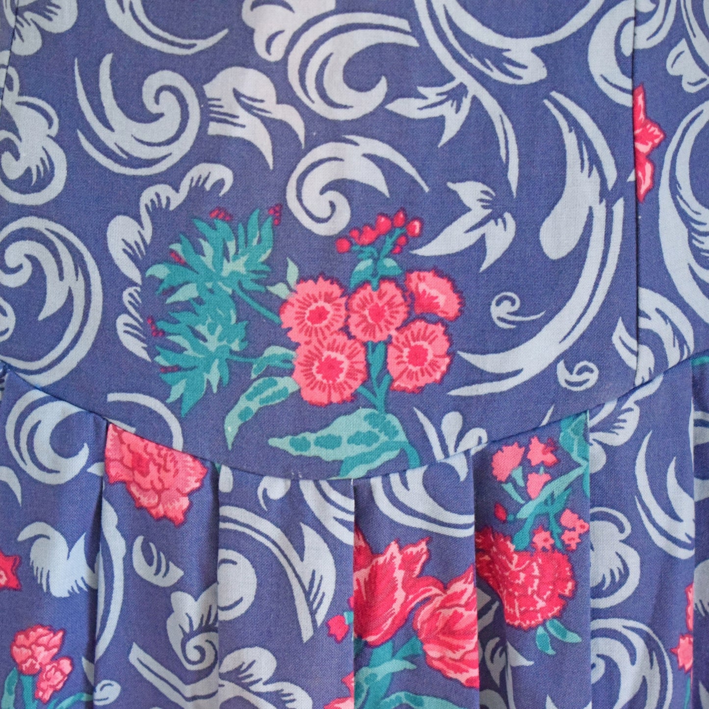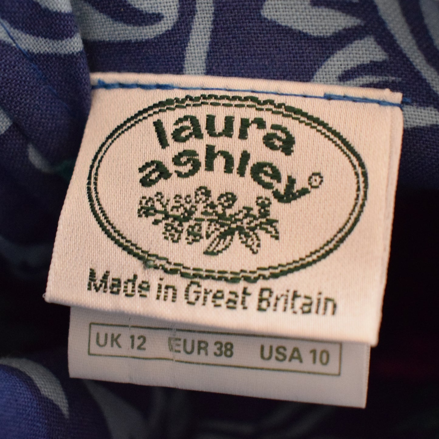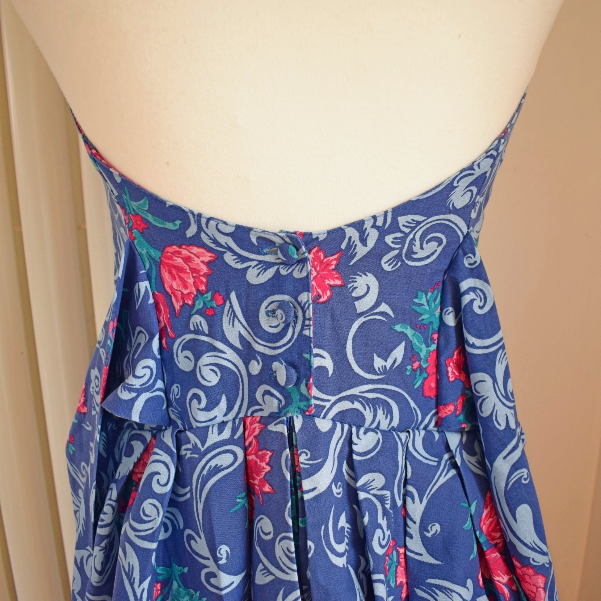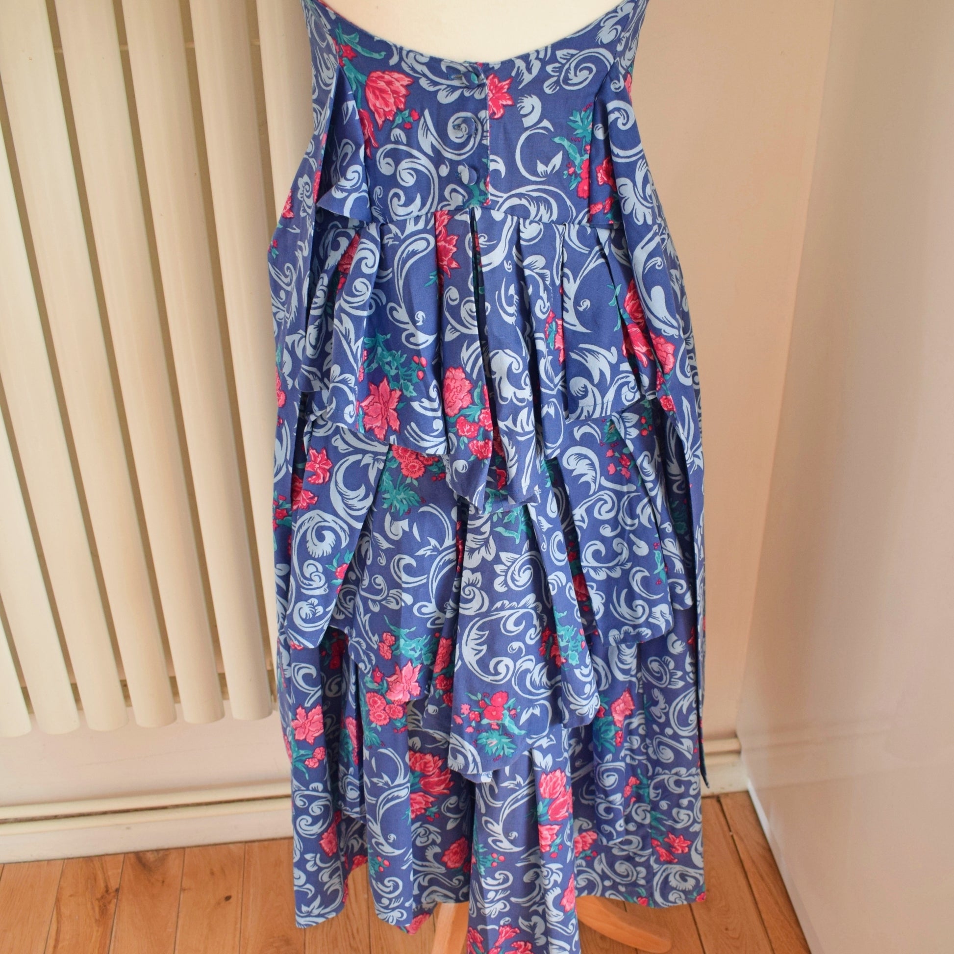 The fabric is a blue and pink floral cotton, with zip and lots of layers at the back (optional bow can be tied)