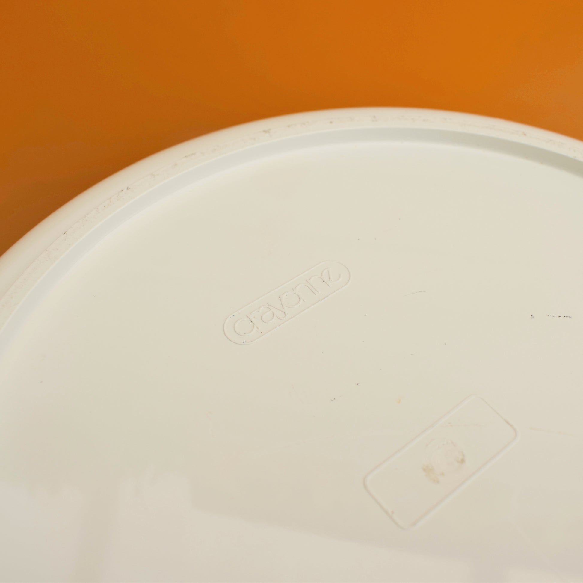Condition notes: the Crayonne piece is white with very slight yellowing noticeable at the base when turned over; the Kartell shows more overall yellowing plus a few cosmetic splash marks where previous paint was removed, revealing a brighter white beneath. Both retain structural integrity and smooth interiors, making them practical for everyday use and appealing to collectors of 1980s designer plastics.