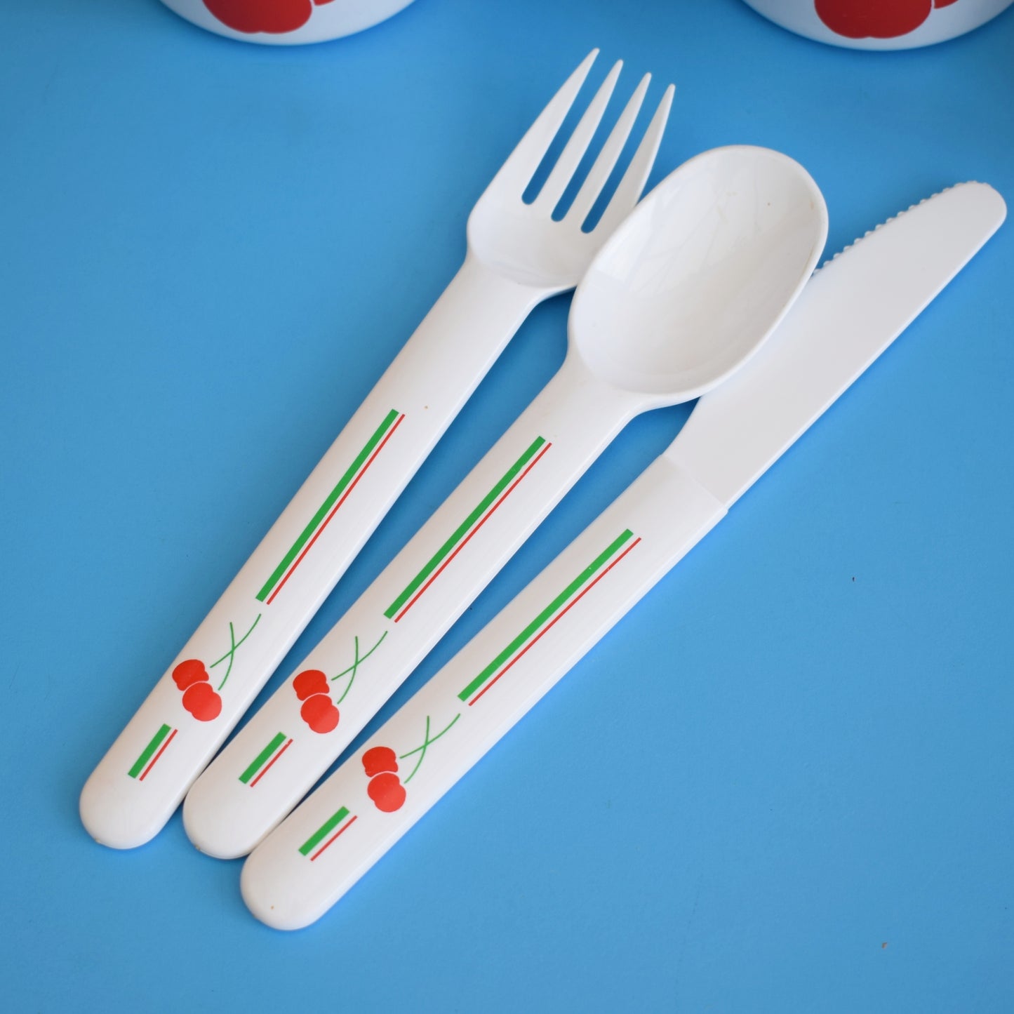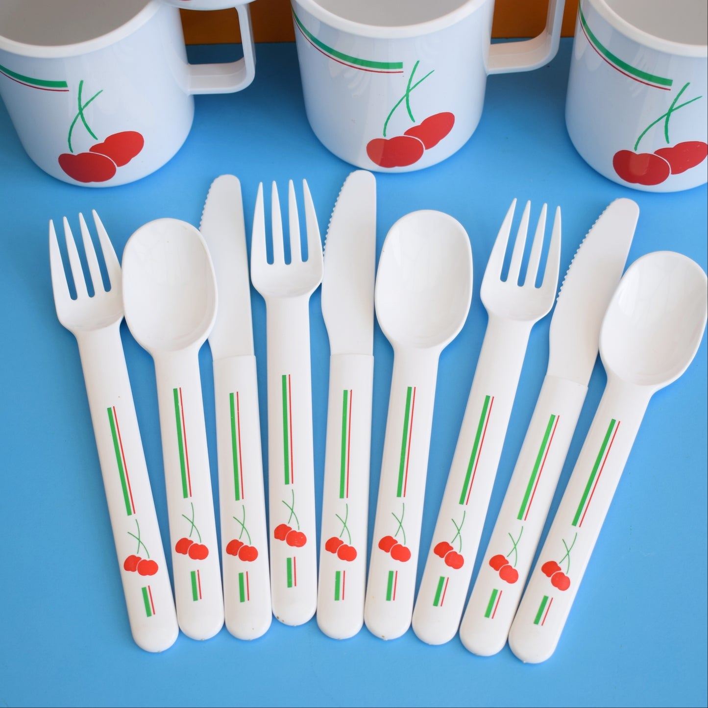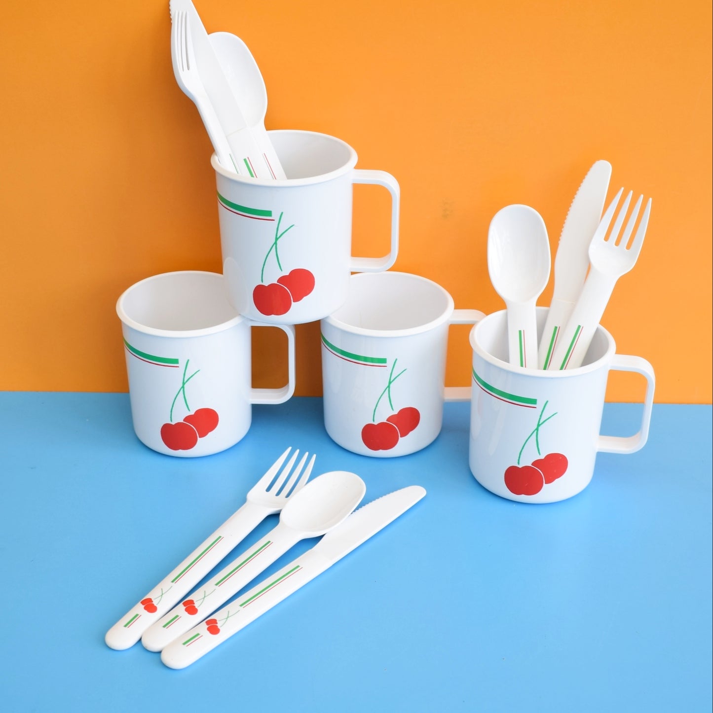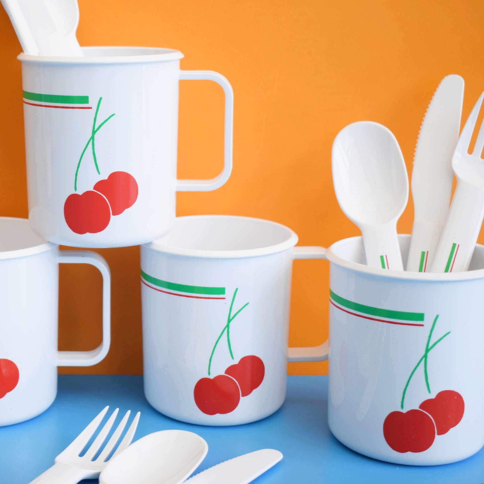 Vintage 1980s Plastic Mugs / Cutlery- Cherry Design
