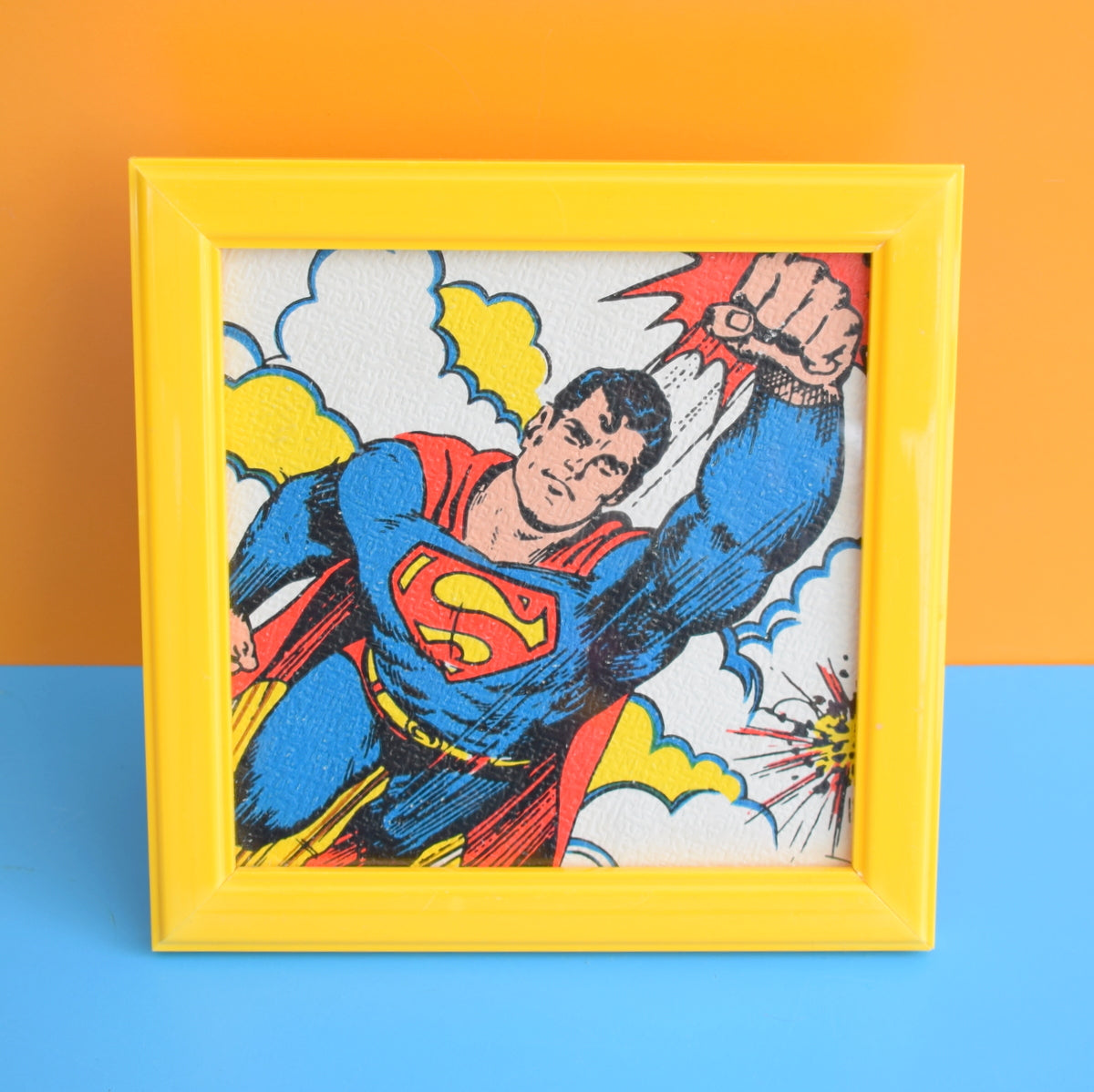 A funky yellow plastic frame with a piece of very rare vintage Superman wallpaper behind glass