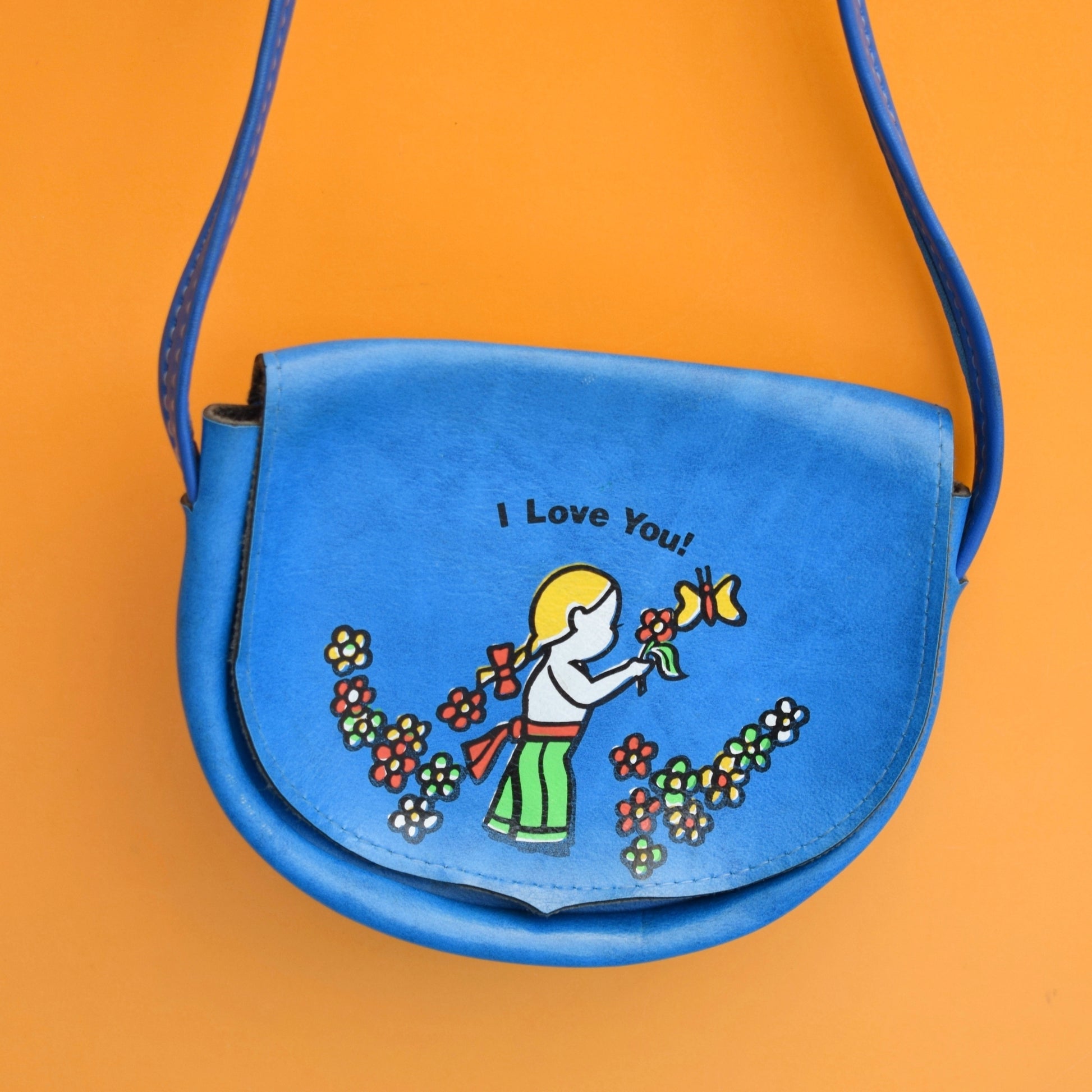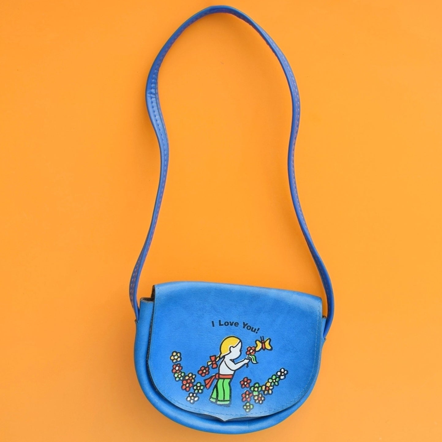 Cheerful vintage 1980s vinyl kids shoulder bag in bright blue, featuring a charming "I Love You" print—perfect for collectors, retro-inspired outfits, or everyday nostalgic fun for little ones. Lightweight, wipe-clean vinyl and a secure velcro flap make it practical for playtime and outings.
