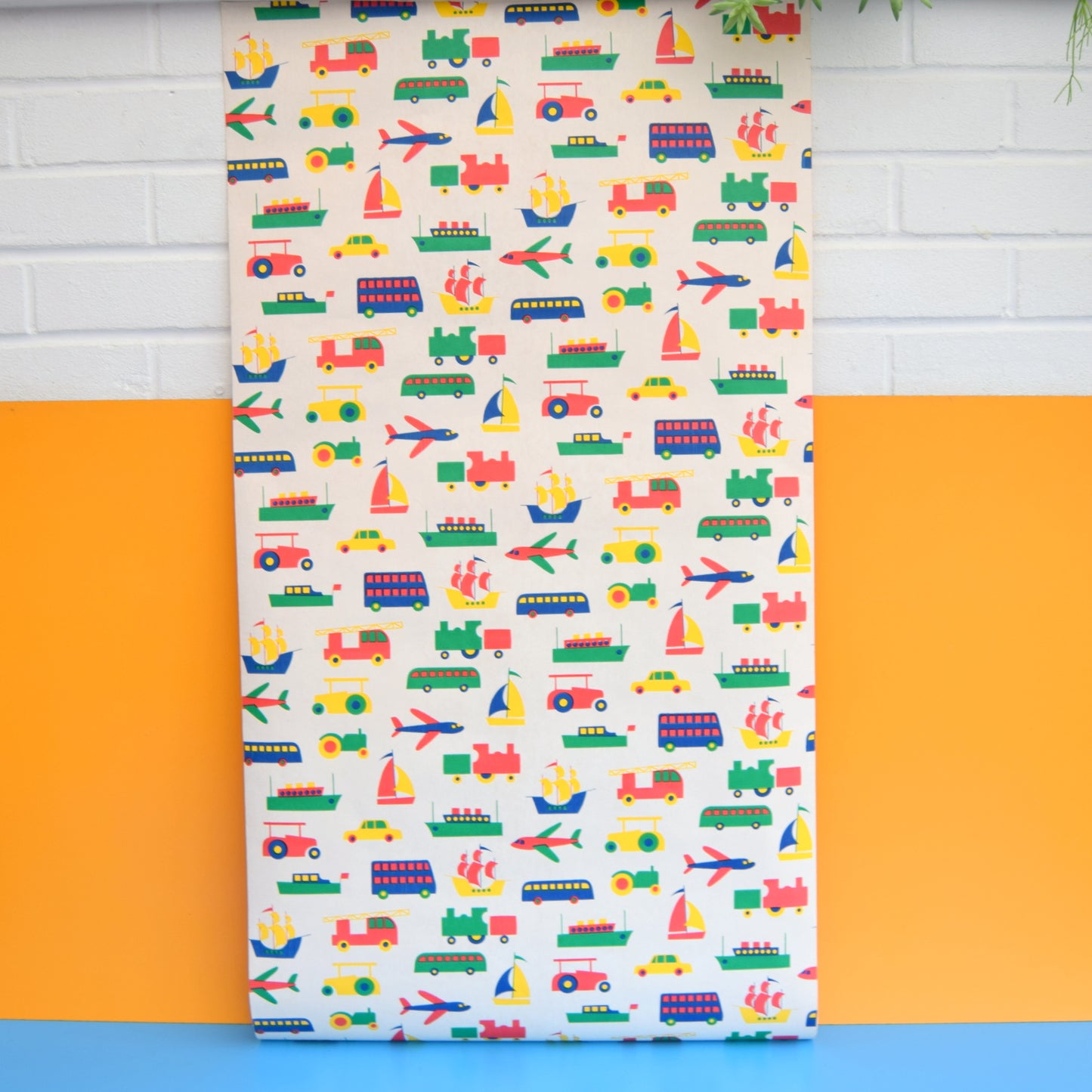 Vintage 1980s Vinyl Kids Wallpaper - Transport - Bright Colours