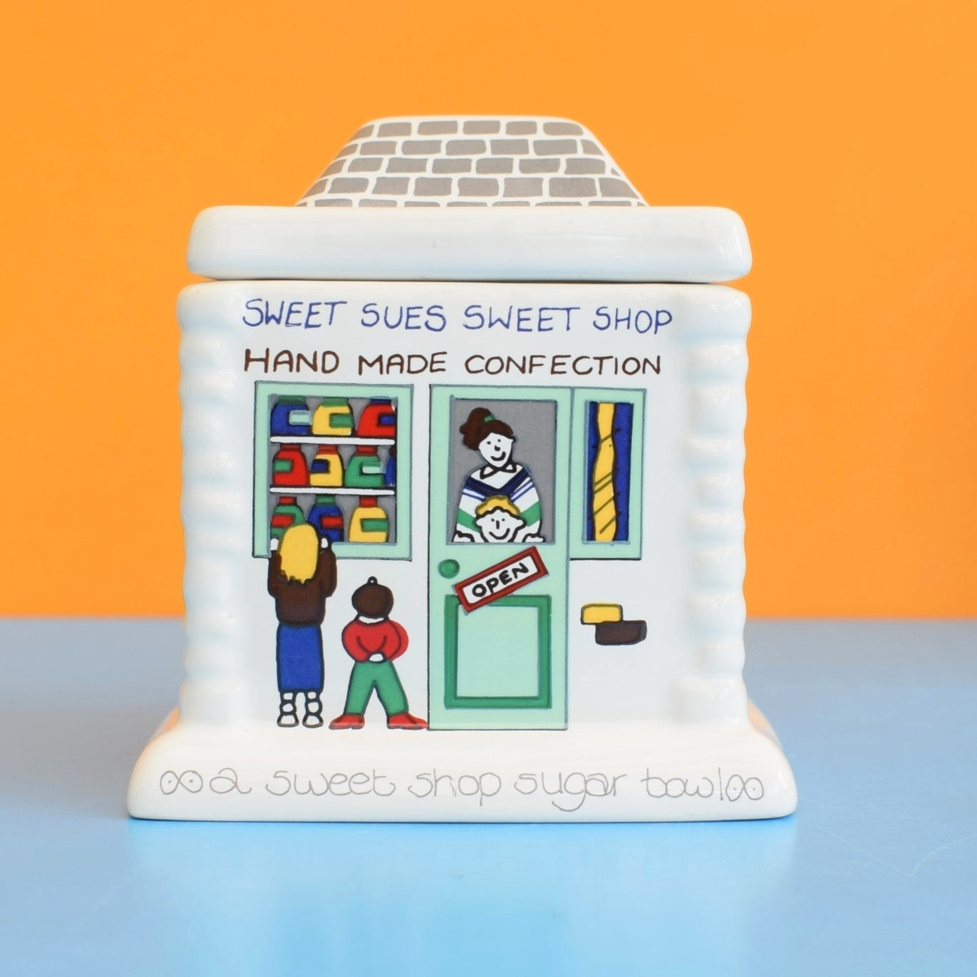 Charming vintage Wade China from the 1980s English Life range — perfect for collectors or anyone after a touch of retro British warmth at the table. Individually sold pieces include a chip shop teapot, a lidded "Sweet Sues" sugar bowl and a Florrie’s Flowers mug, each decorated with the range’s nostalgic, whimsical motifs.