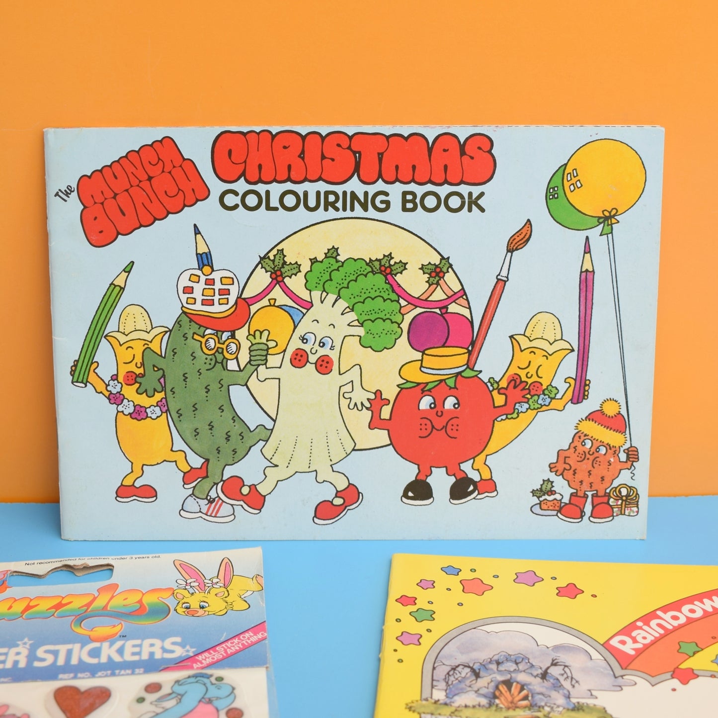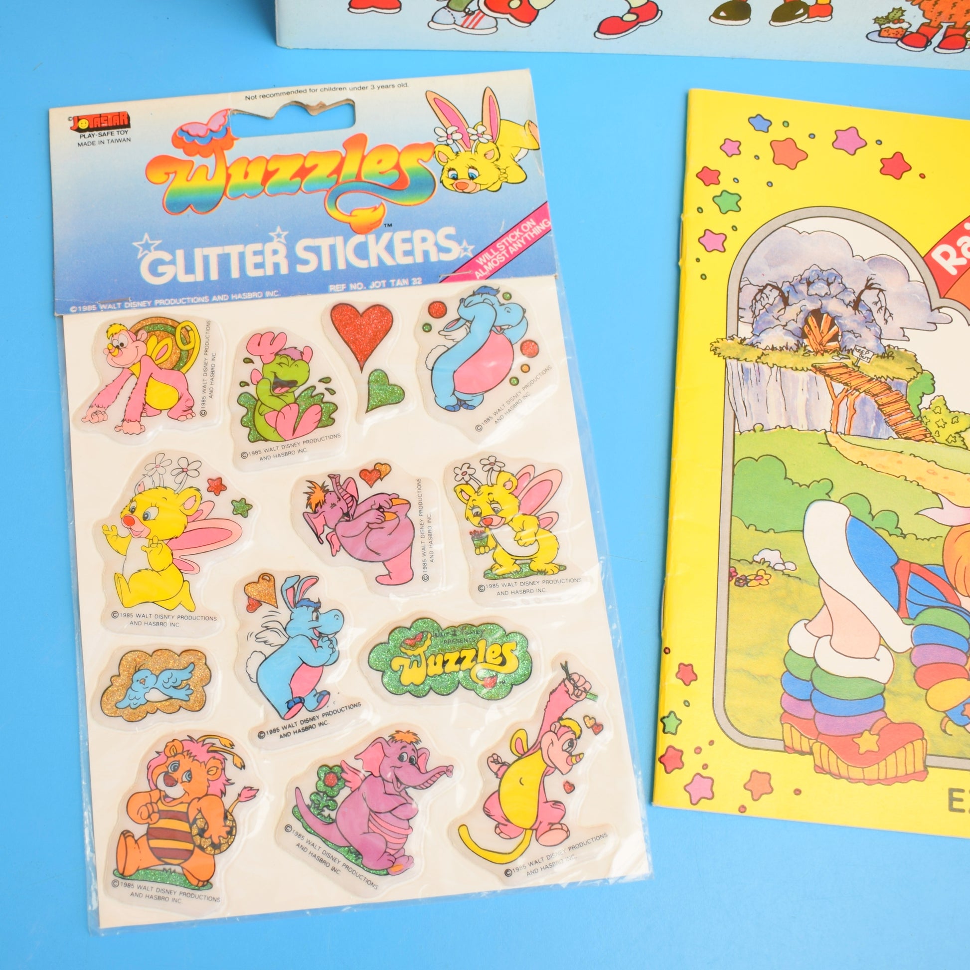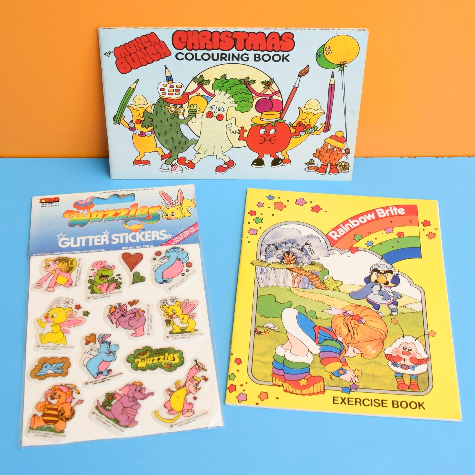A sheet of Wuzzles puffy stickers, Munch Bunch colouring book and Rainbow Brite exercise book