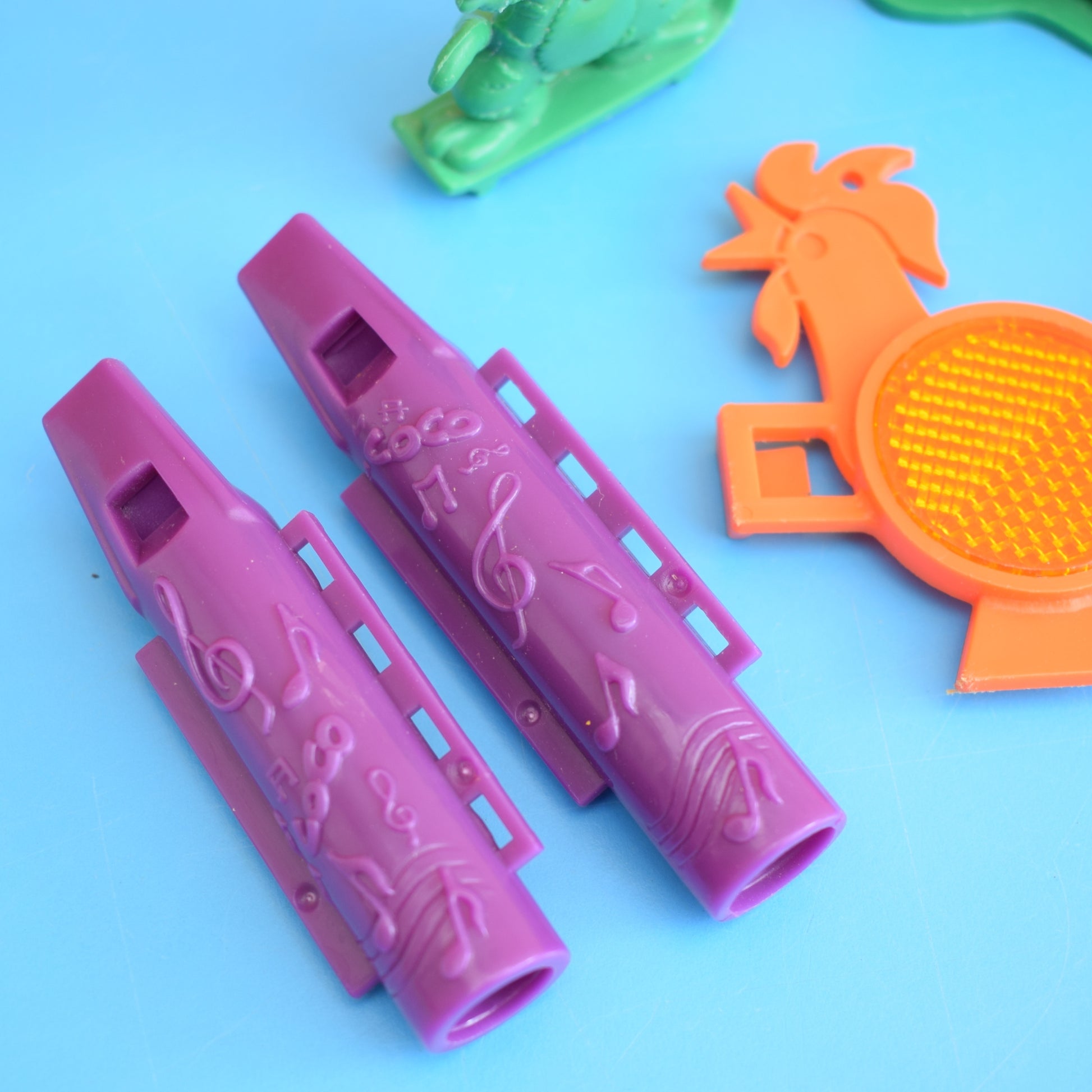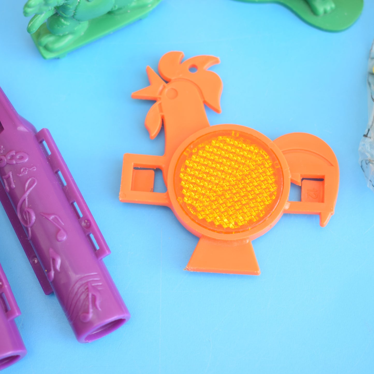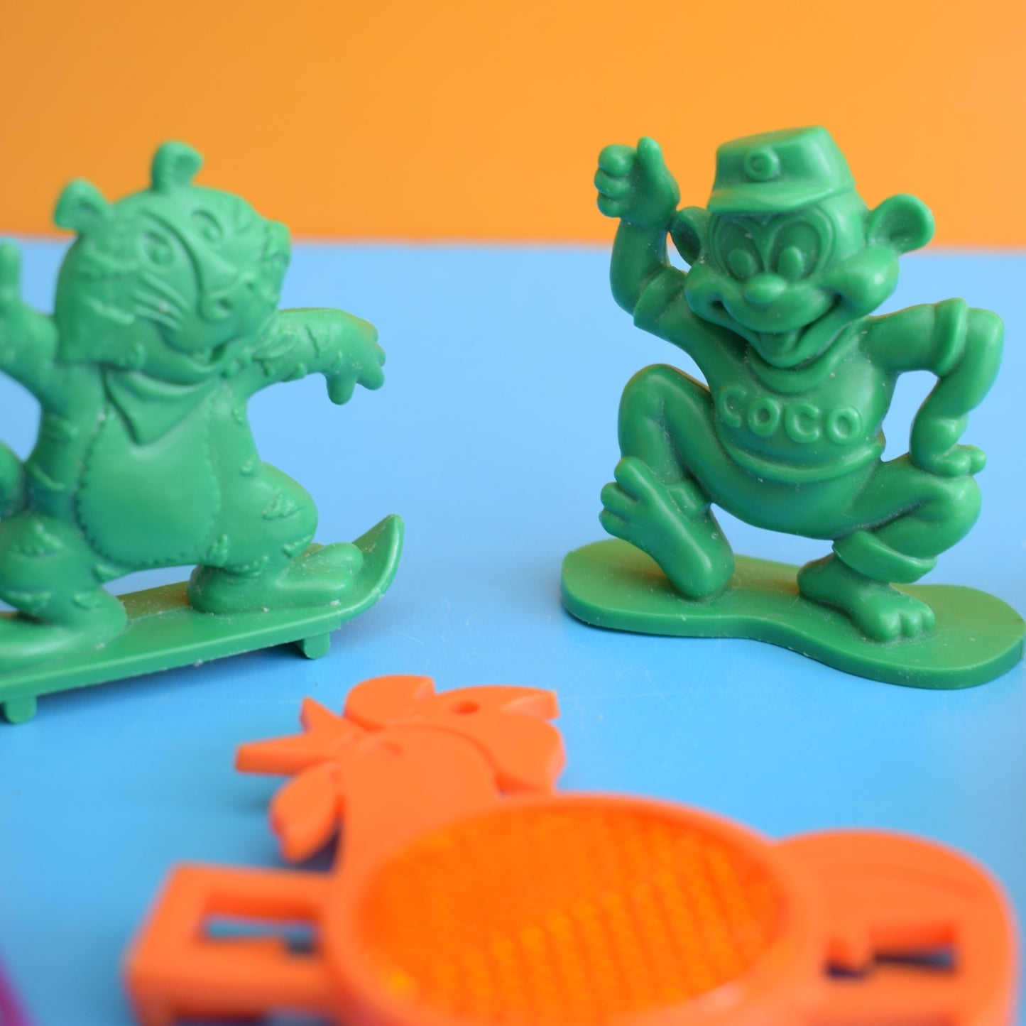 This mixed lot of vintage Kellogg's cereal toys offers authentic promotional pieces from the 1990s with lively colours and characterful wear that tells a story. Each toy is compact and lightweight, making them easy to arrange in themed displays, shadow boxes, or on a collector’s shelf. The assortment includes molded characters with hand‑painted details — note an orange figure dated 1989 — giving the lot added interest for advertising and cereal memorabilia enthusiasts.