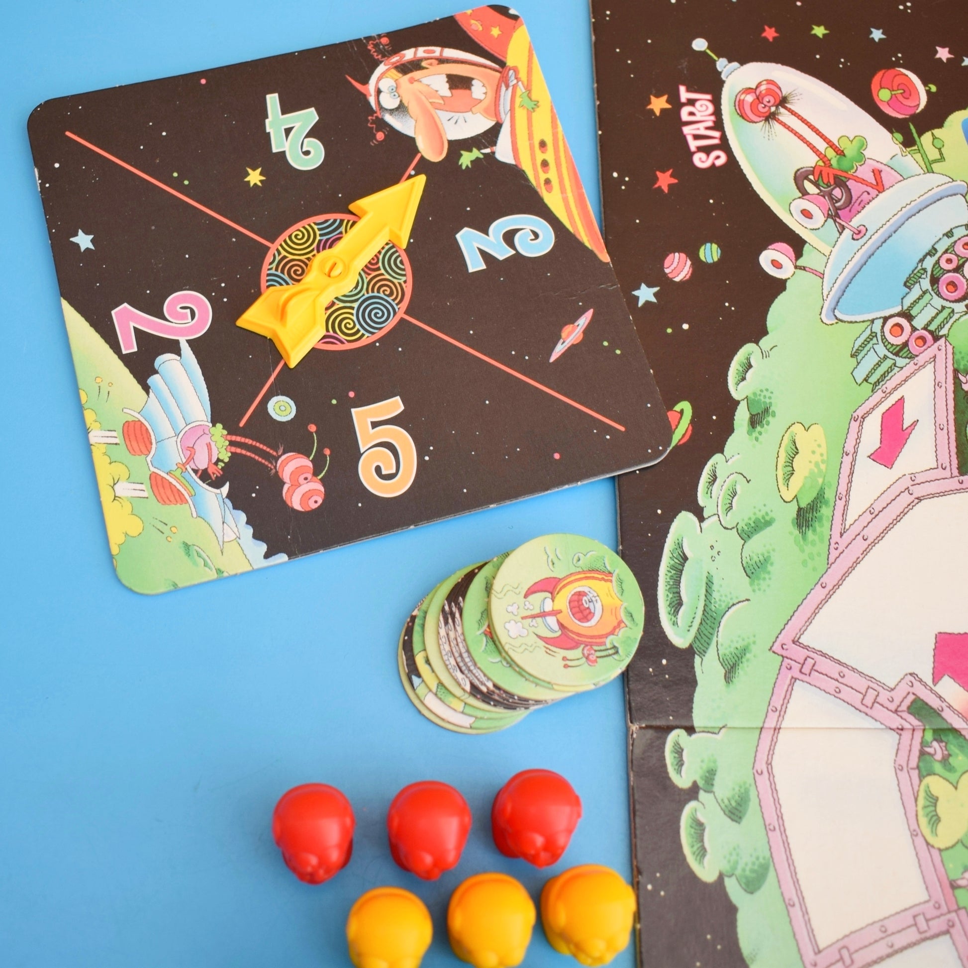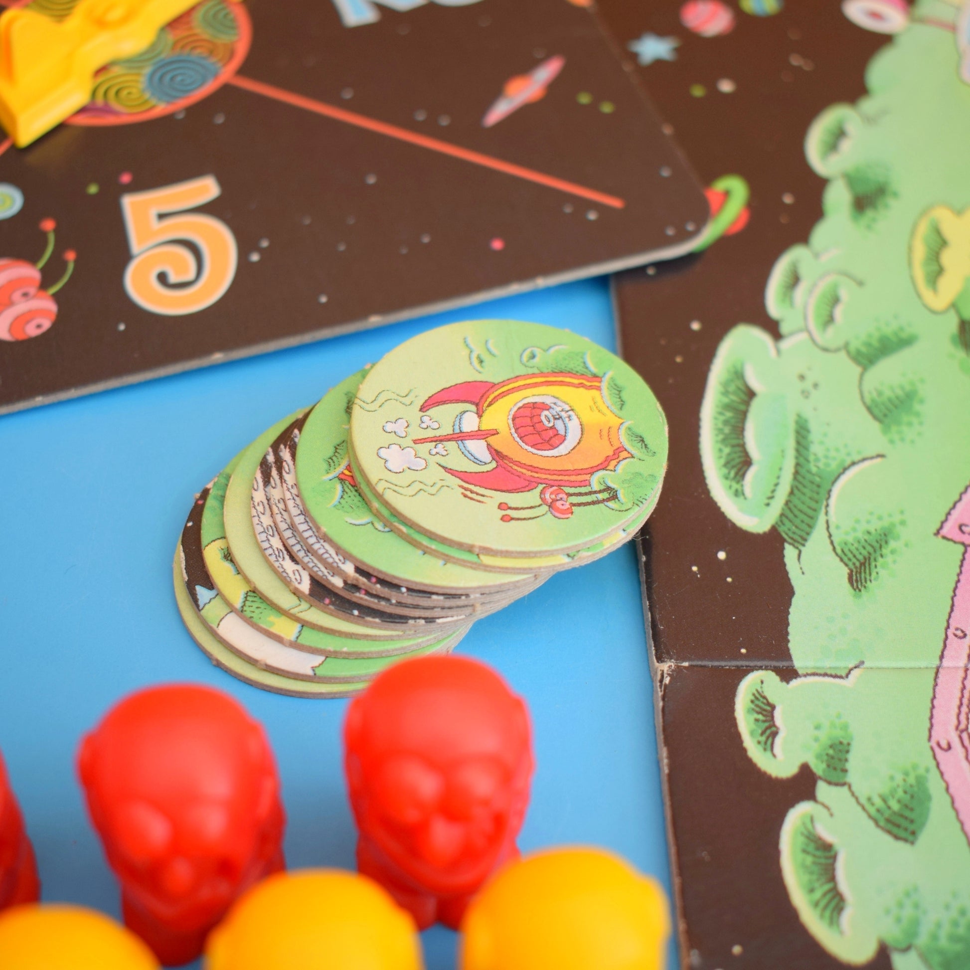 Really fun game. The little aliens move around the board, and when they get to the launchpad... the puffer is hit, and the little guy shoots up into the spaceship, holding them in the basket underneath!