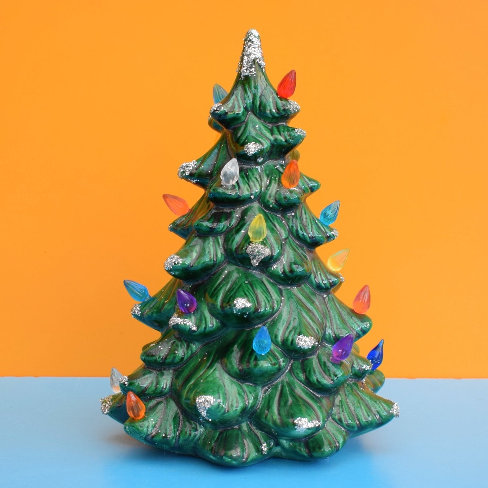 - Design Vintage unbranded kitsch style; hollow ceramic Christmas tree with multicolored plastic decorations; internal lights for a warm glow