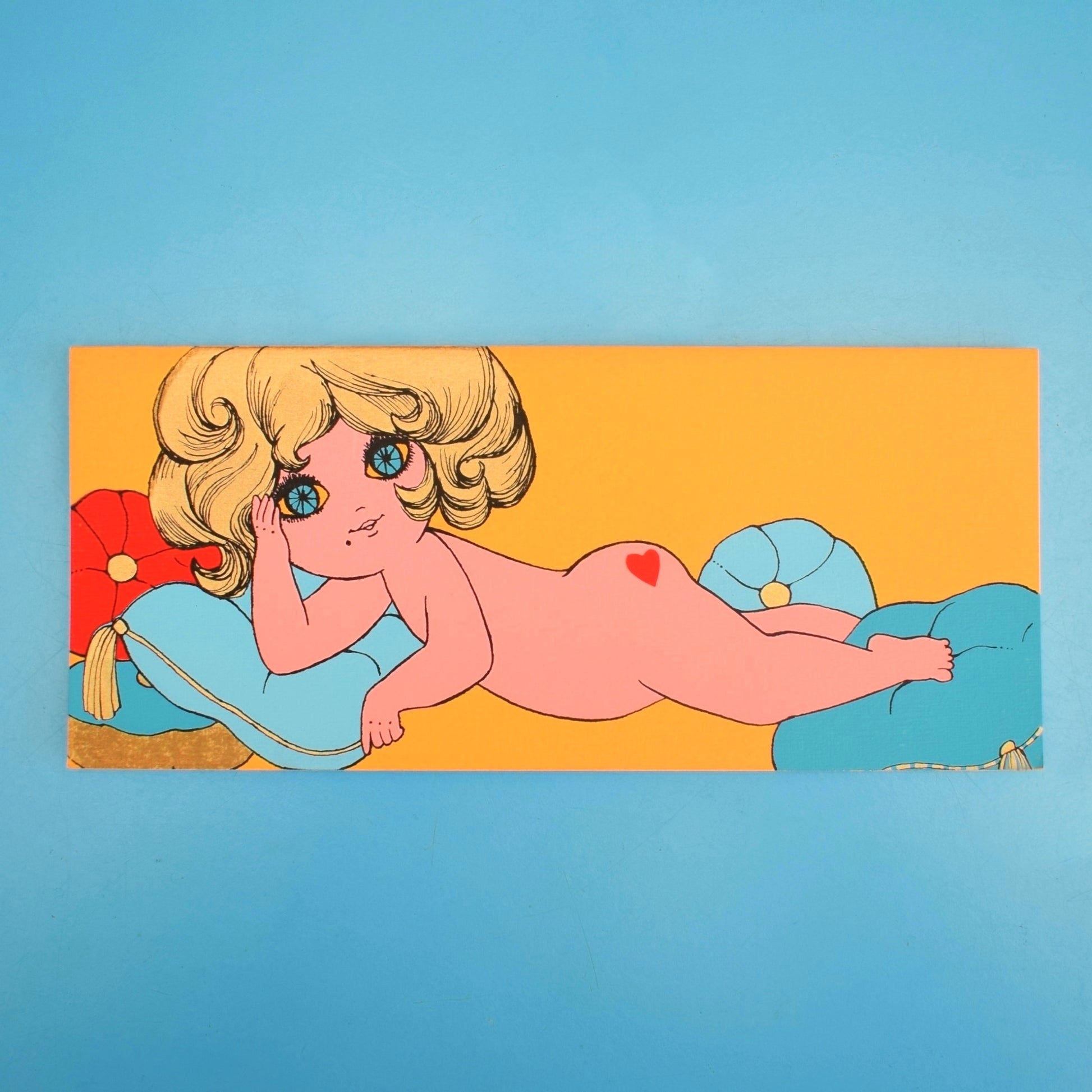 - Design American manufacturer unknown — 1970s retro illustration; yellow background with a naked lady motif and whimsical lettering; interior greeting reads “You Curl My Toes”