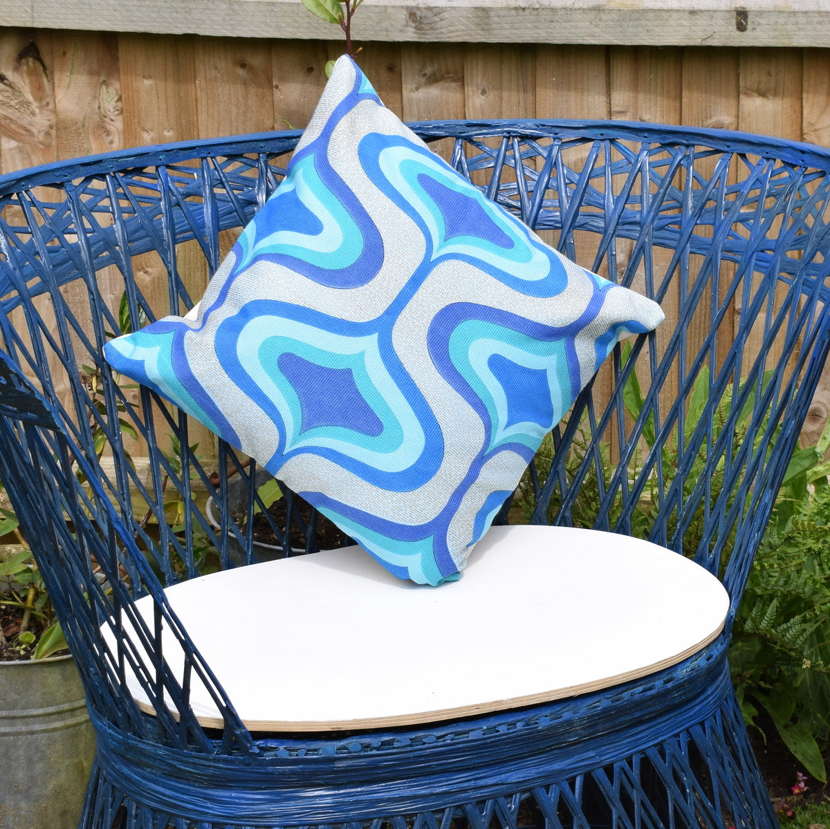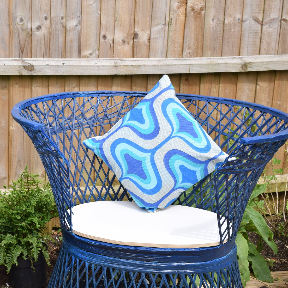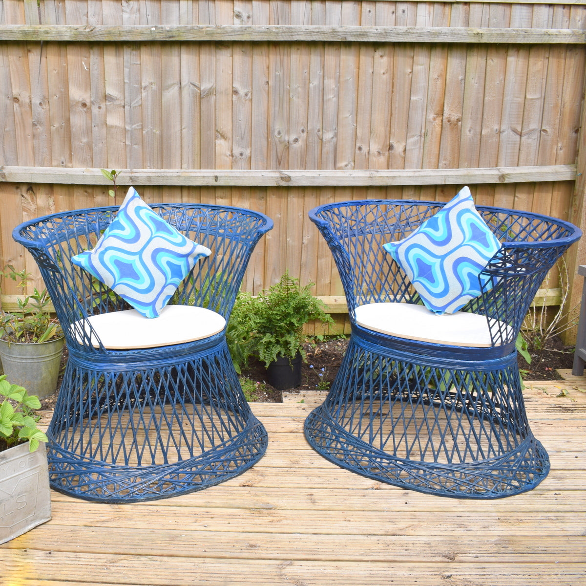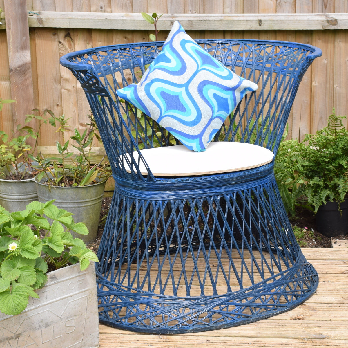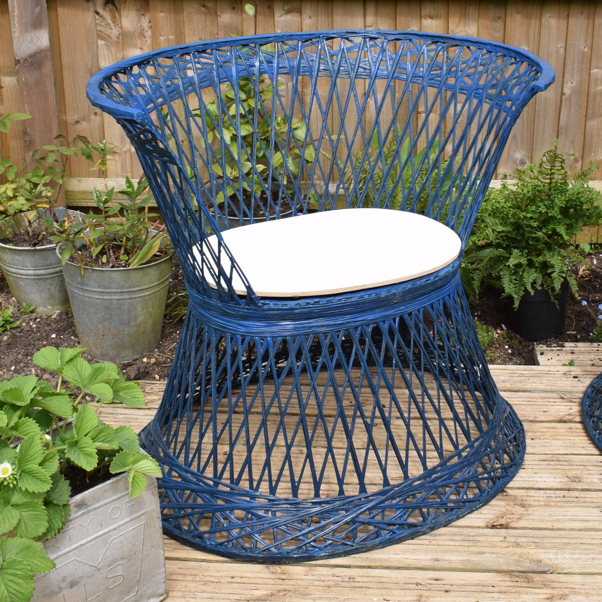 These tub chairs are unique, no other blue ones available (green available in another listing) It has a plywood base, painted to make weatherproof. Each of these has a slightly different shape at the front.