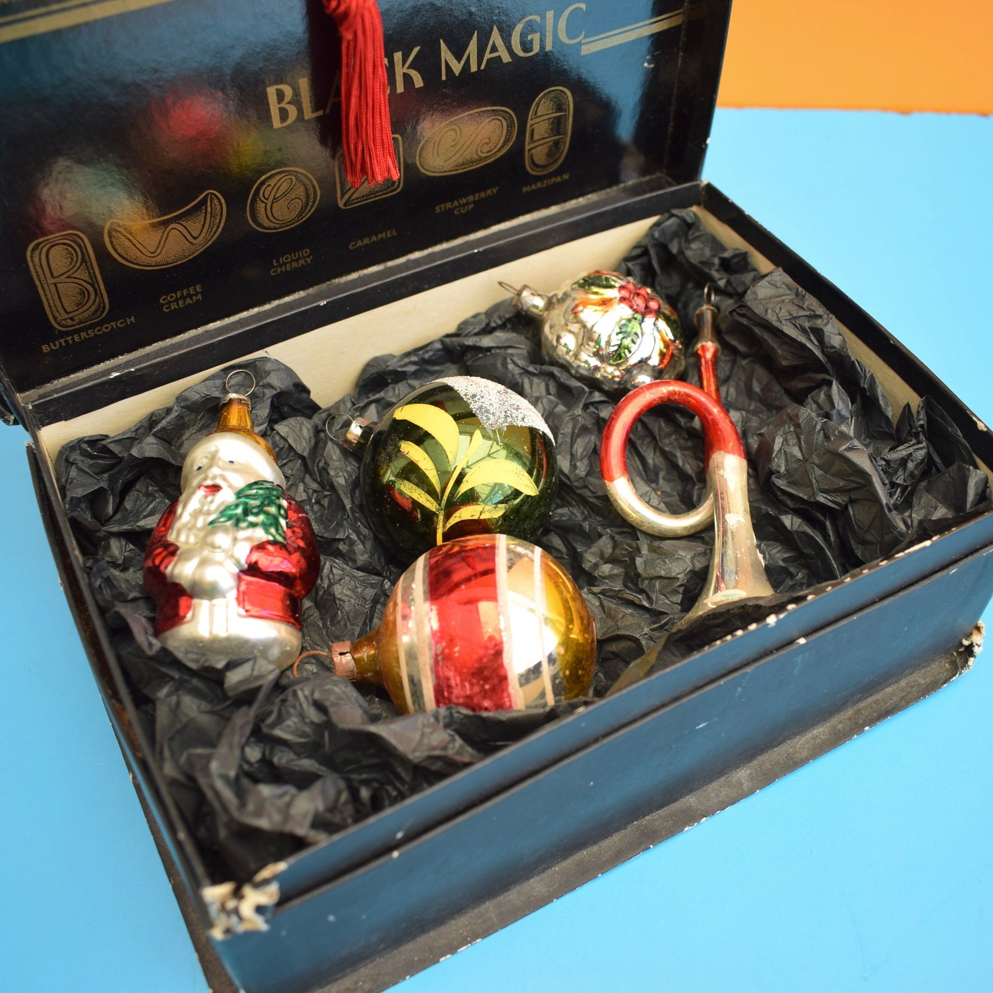 Bring authentic retro holiday style to your home with this mixed selection of glass baubles. Each ornament shows delicate hand‑painted detail and a variety of classic mid‑century shapes and finishes, giving your tree a layered, collectible look. The original chocolate box makes the set perfect for gifting, display, or safe storage between seasons.