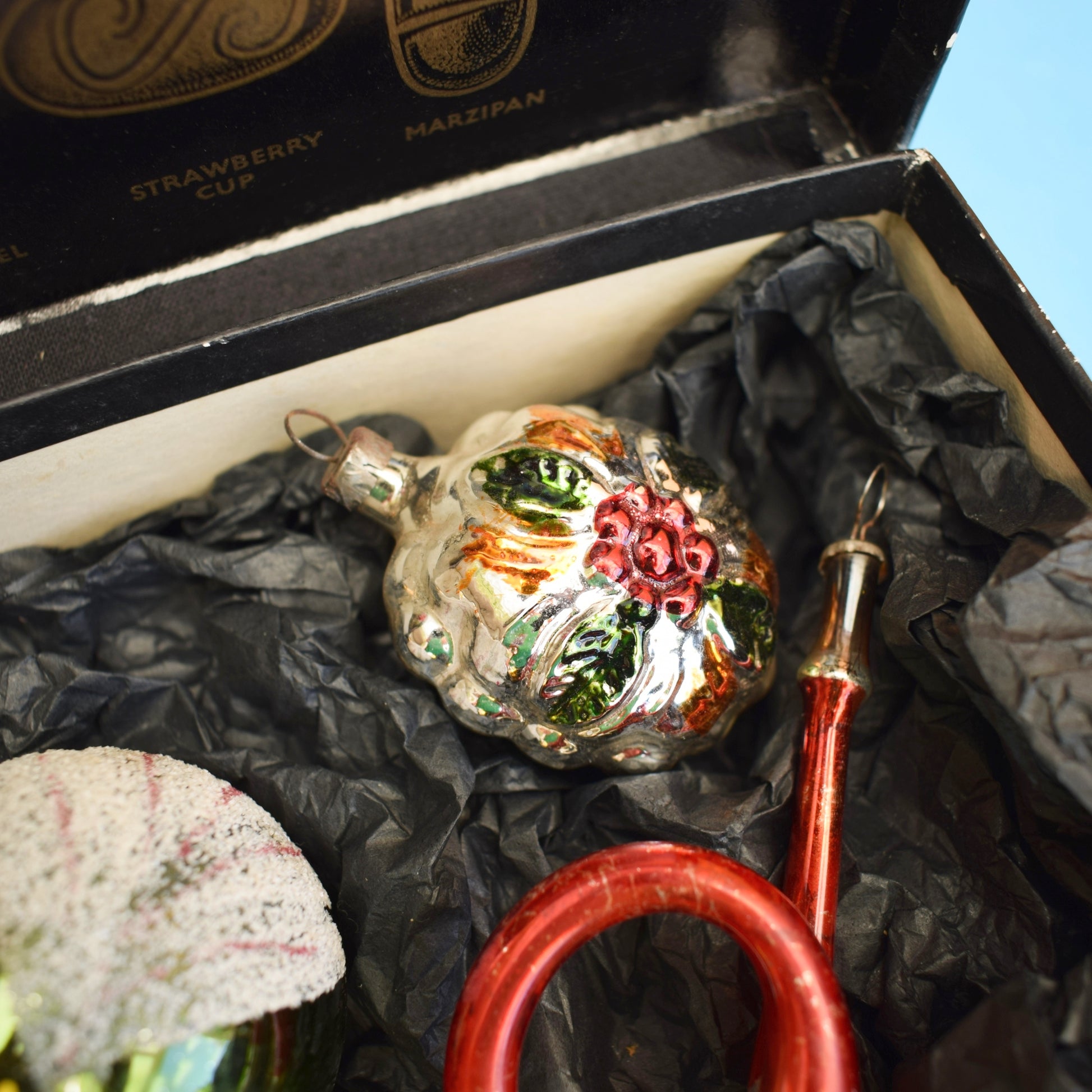 Authentic mid-century charm in a single curated lot — a collection of vintage hand‑painted glass Christmas baubles in festive red and green, presented in their original chocolate box and ready to adorn your tree or seasonal display. Ideal for collectors and anyone seeking nostalgic holiday décor with genuine 1950s–60s character.