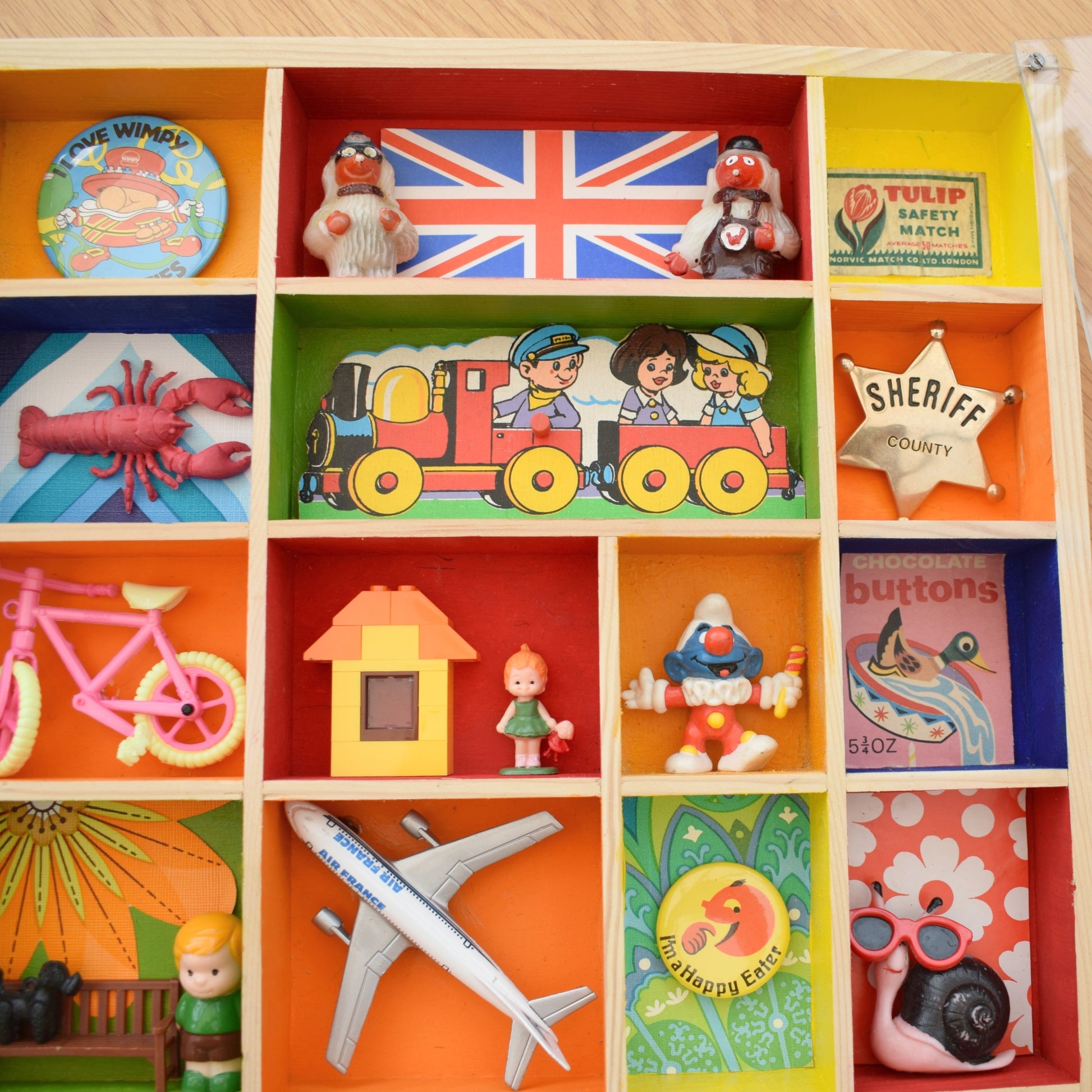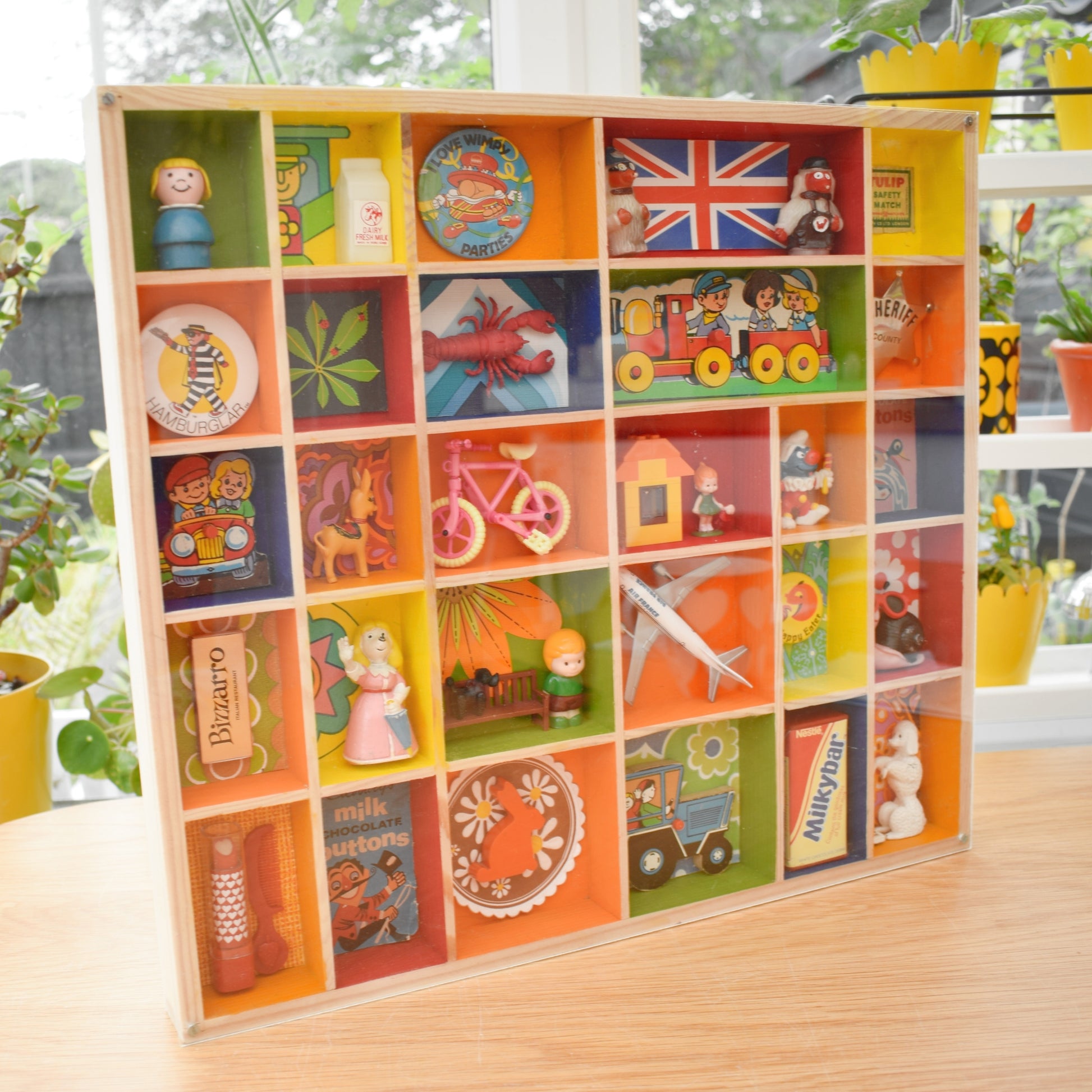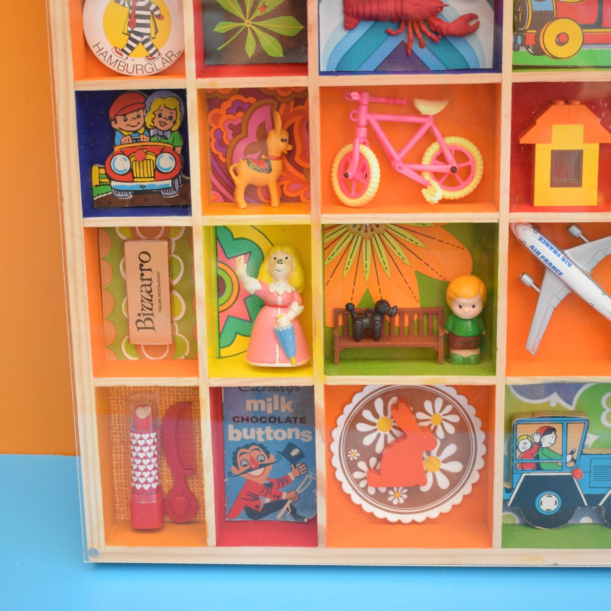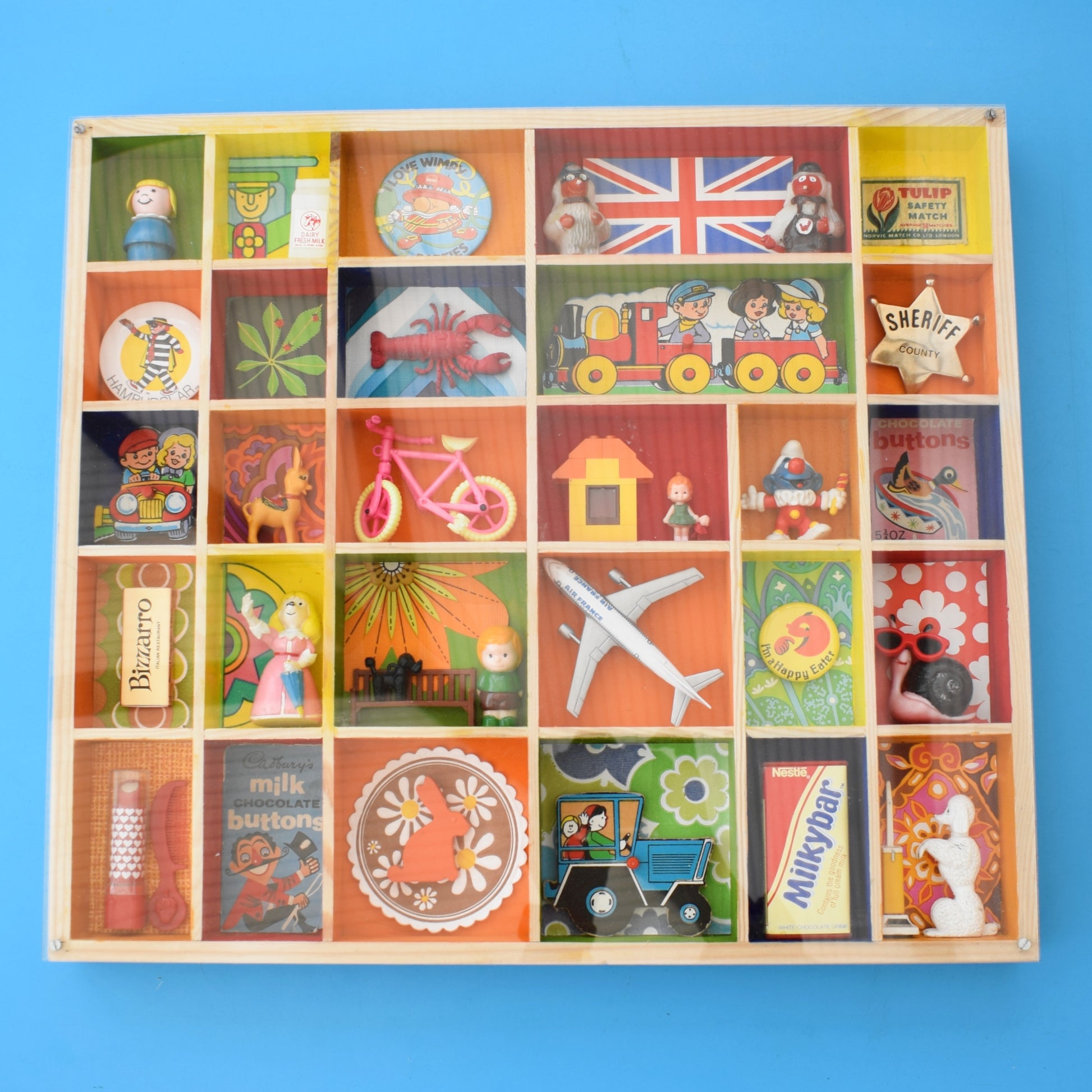 Please study the pictures to see all the little treasures in detail. Sold as a whole piece, filled with a piece of custom perspex covering the front to protect everything
