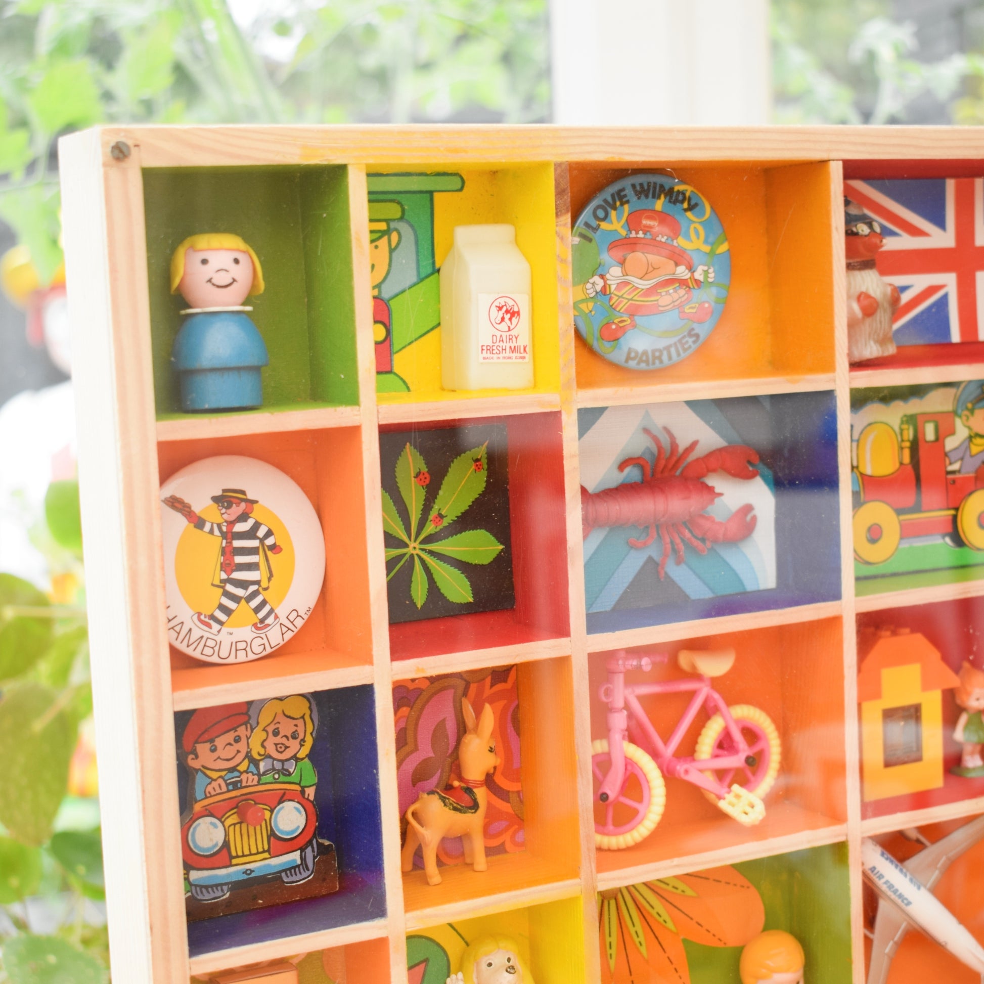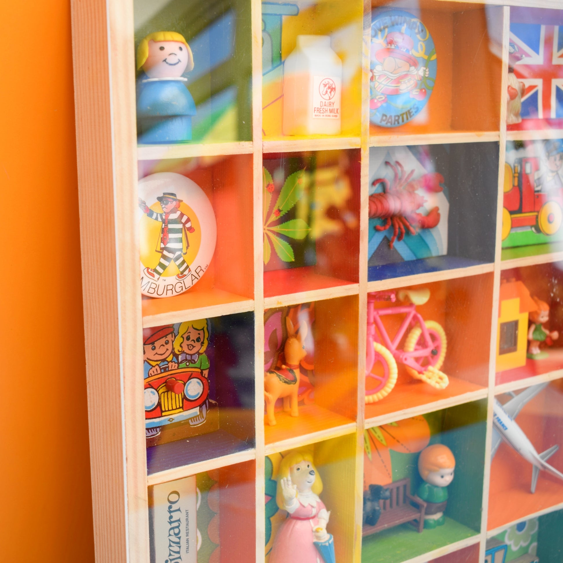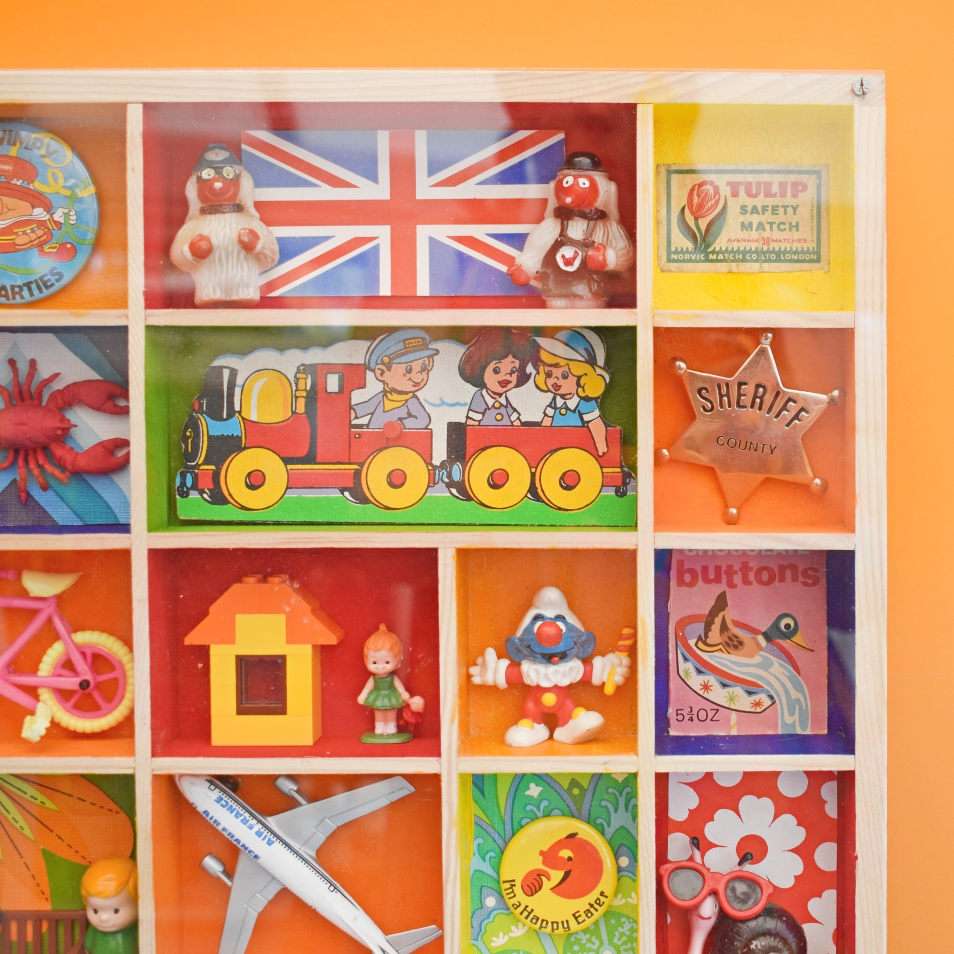 Please study the pictures to see all the little treasures in detail. Sold as a whole piece, filled with a piece of custom perspex covering the front to protect everything