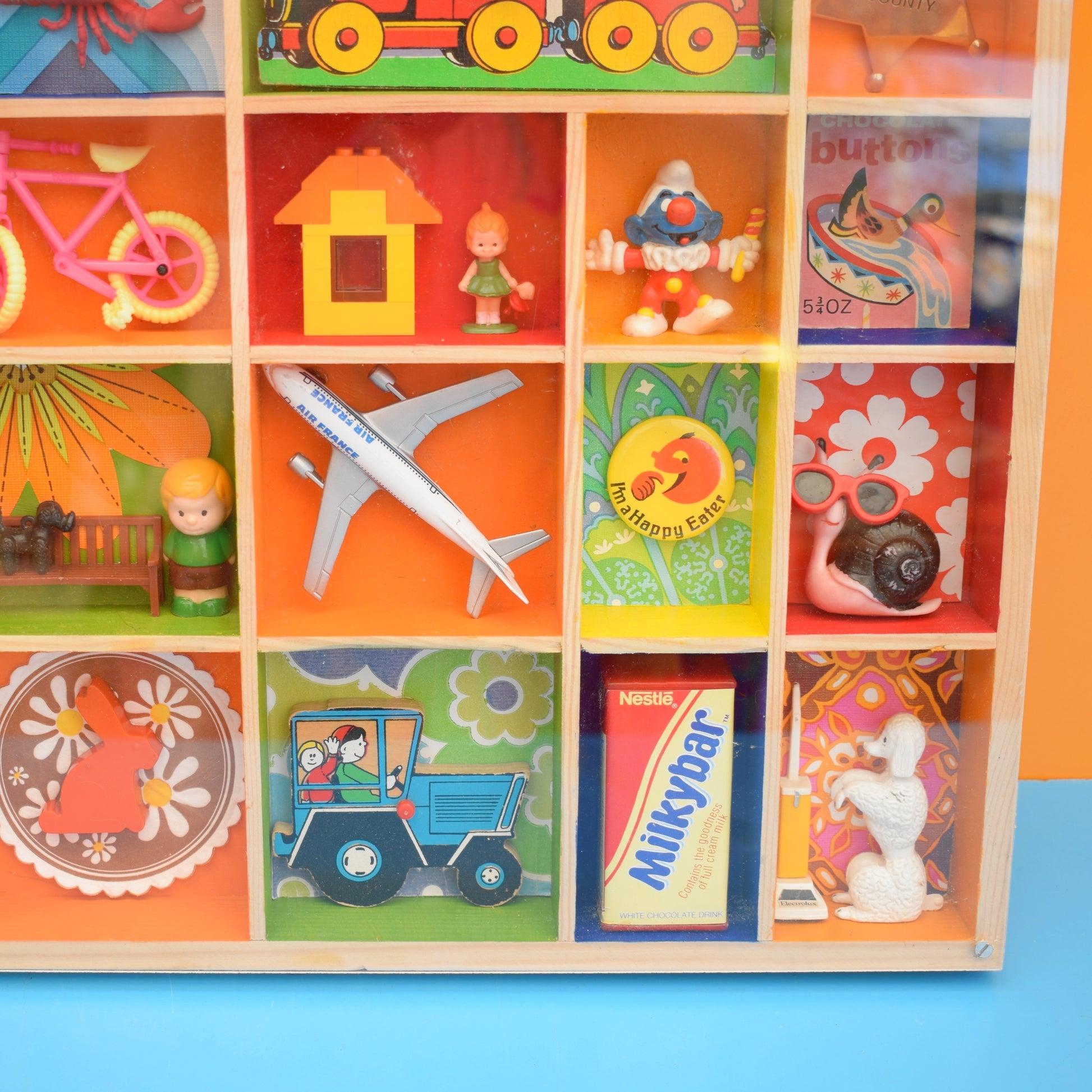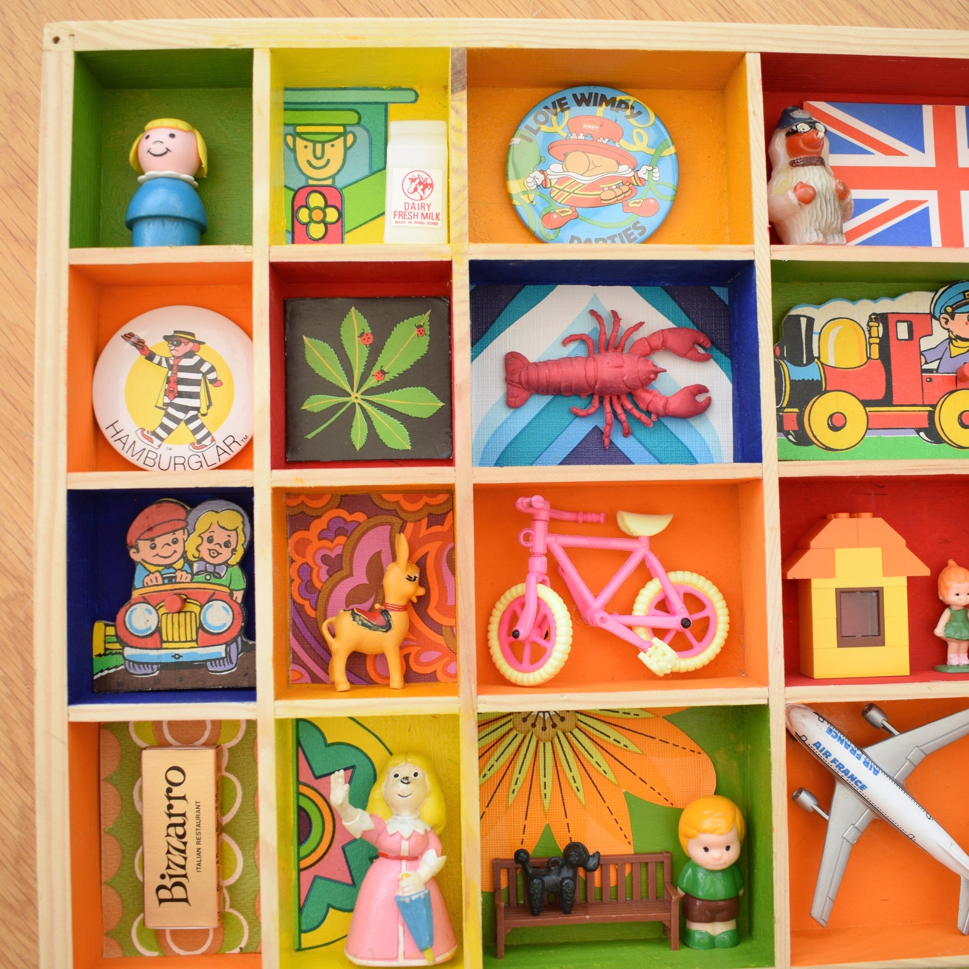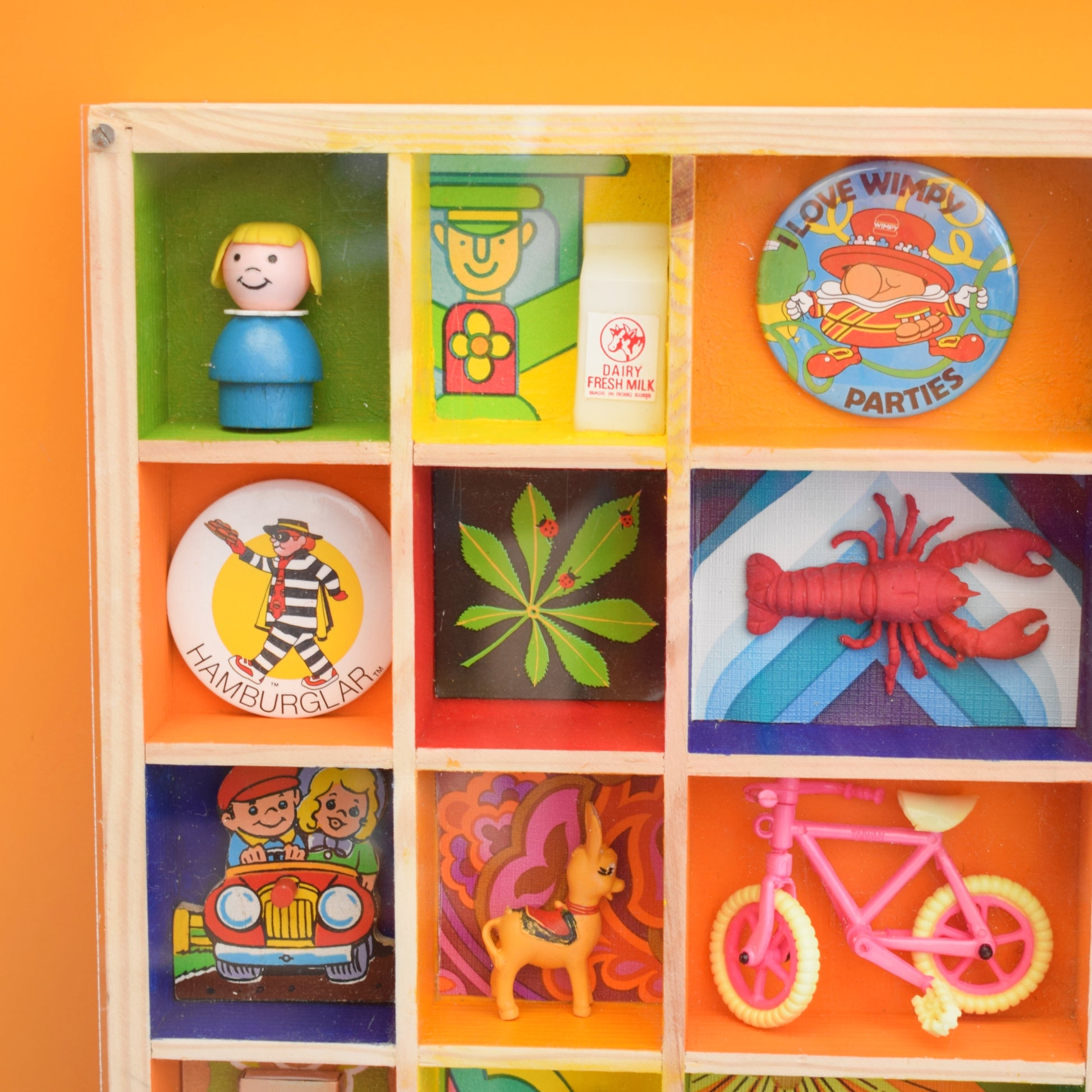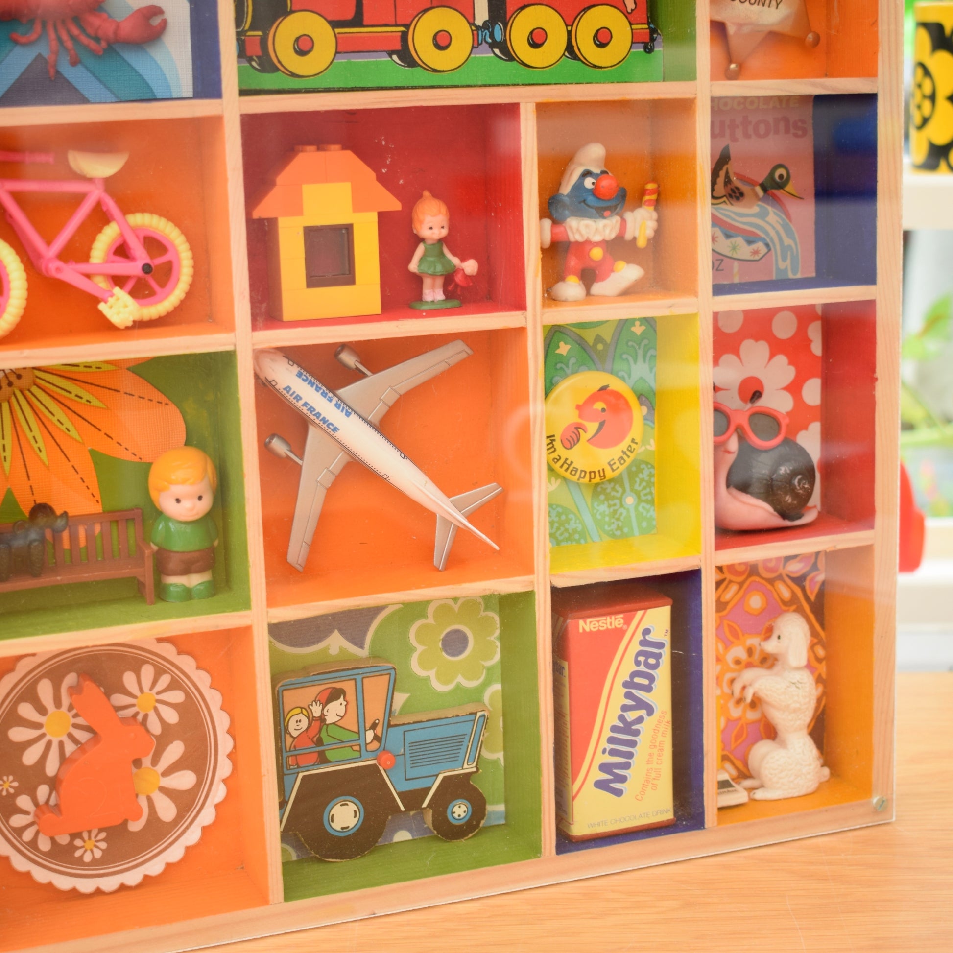 Please study the pictures to see all the little treasures in detail. Sold as a whole piece, filled with a piece of custom perspex covering the front to protect everything