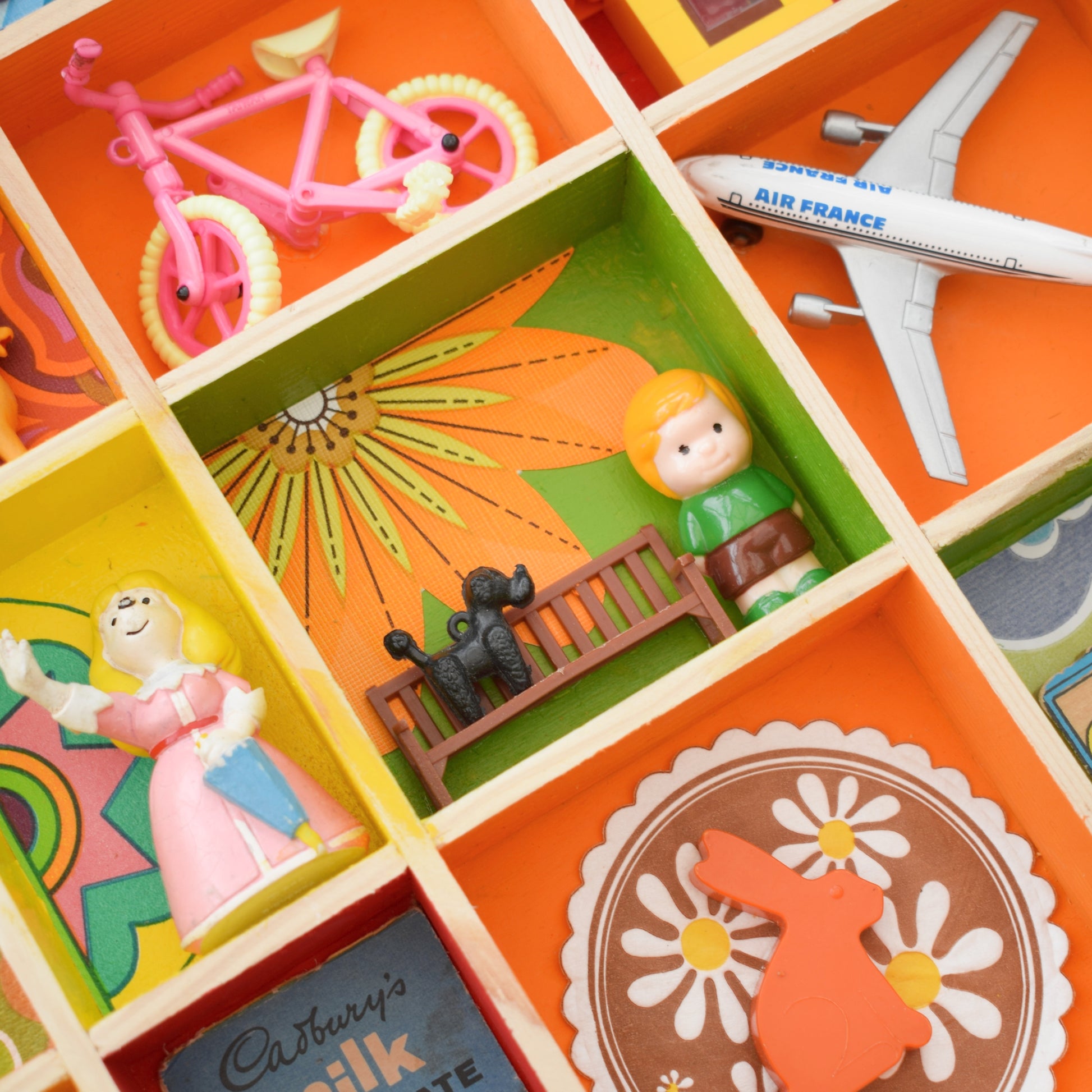 A wooden printers tray style unit, Filled with a carefully curated collection of tiny vintage treasures and 1970s wallpaper scraps