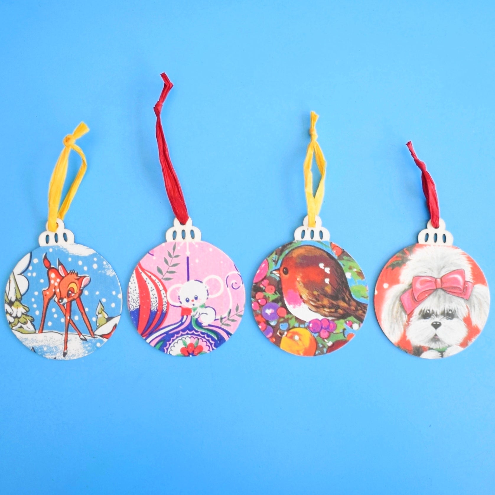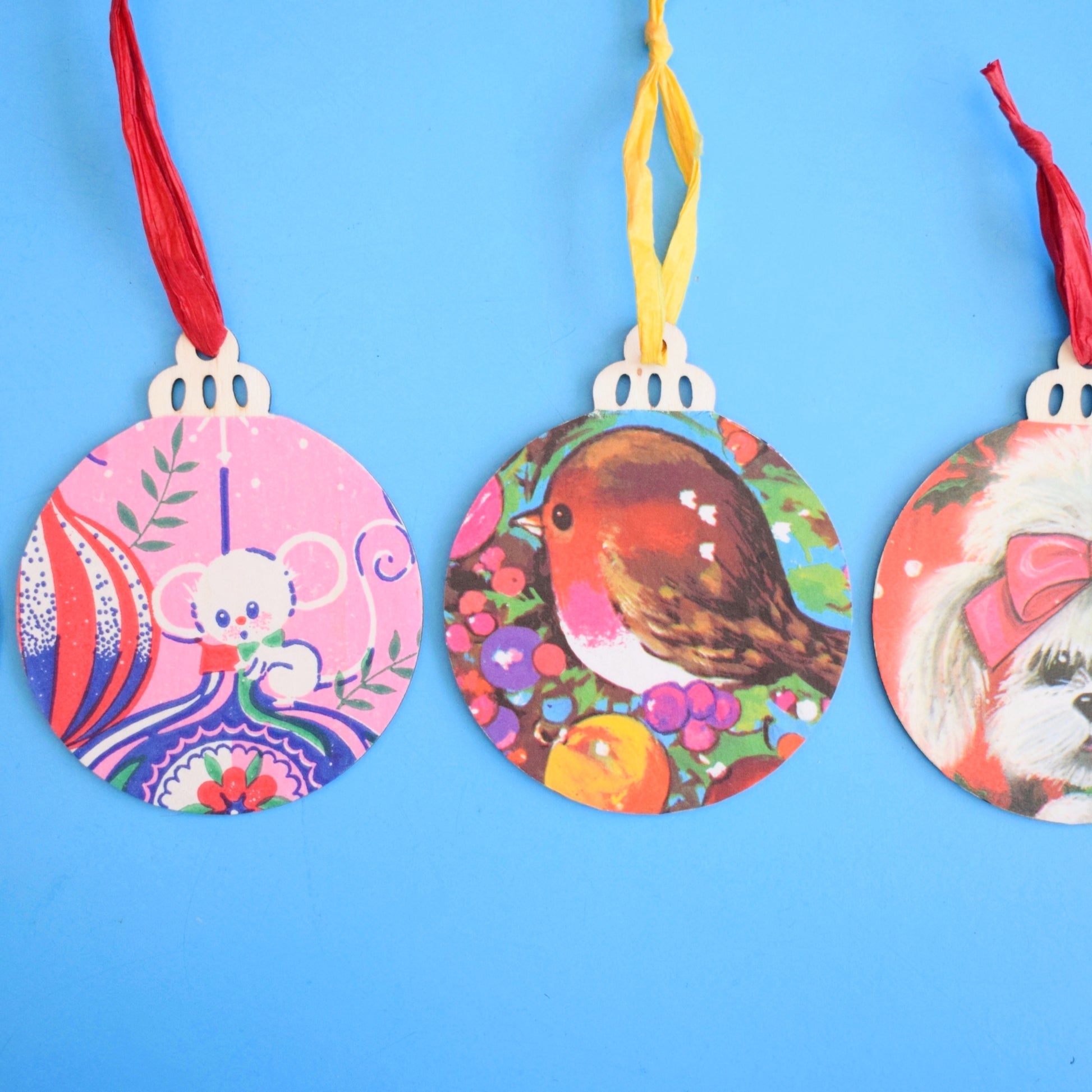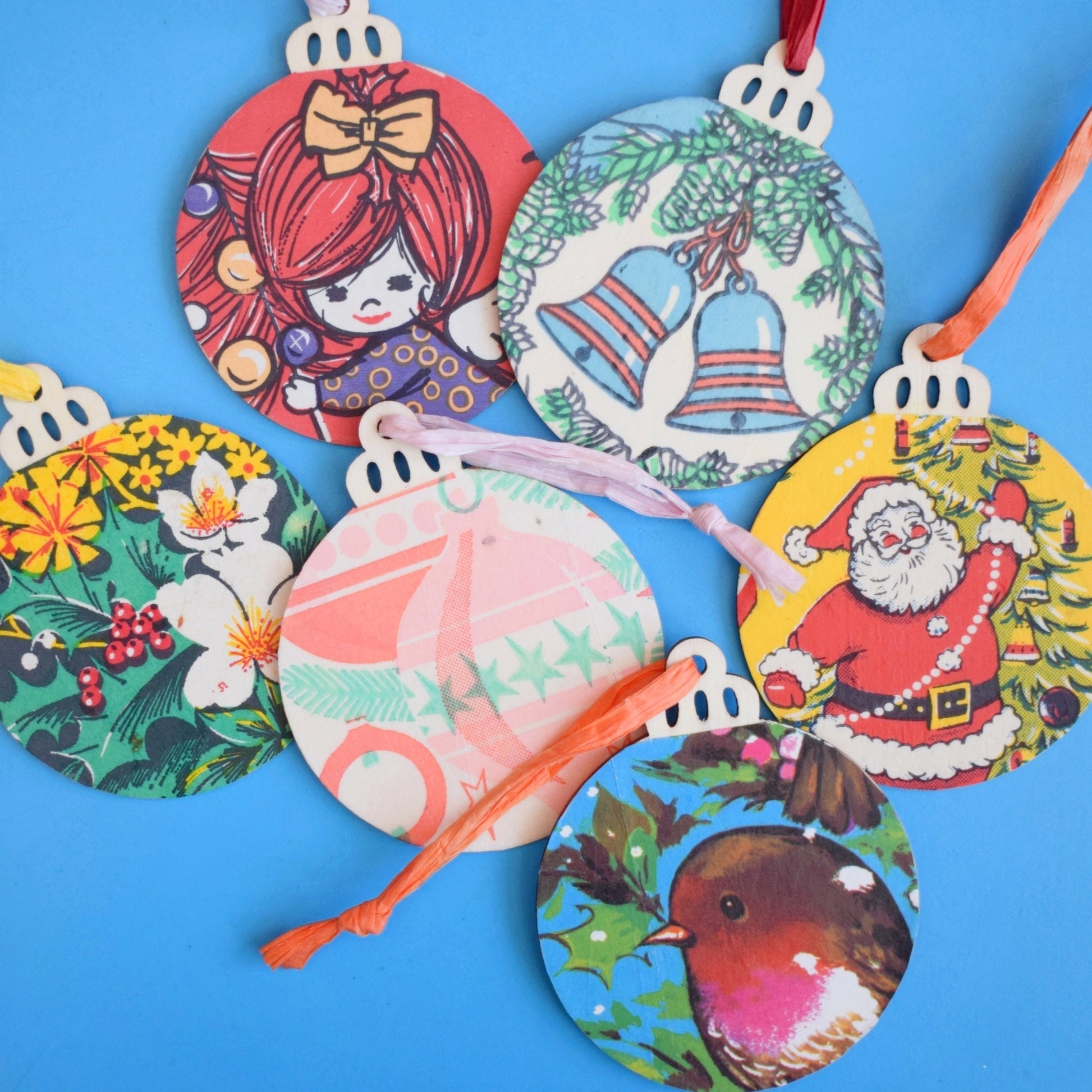 - Design Handmade wooden blanks finished with vintage wrapping paper motifs; coordinating hanging string; no manufacturer — artisanal vintage-inspired design