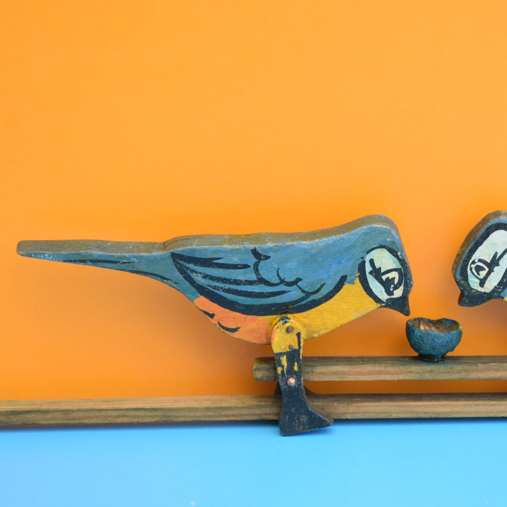 A handmade pair of pecking blue tits, made from wood, you slide each end and they take turns to peck at the acorn dish